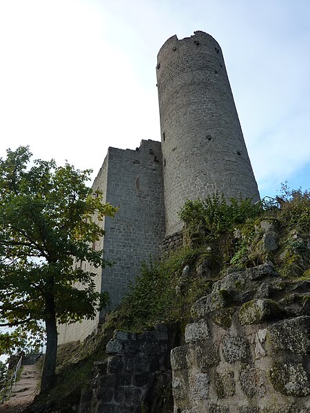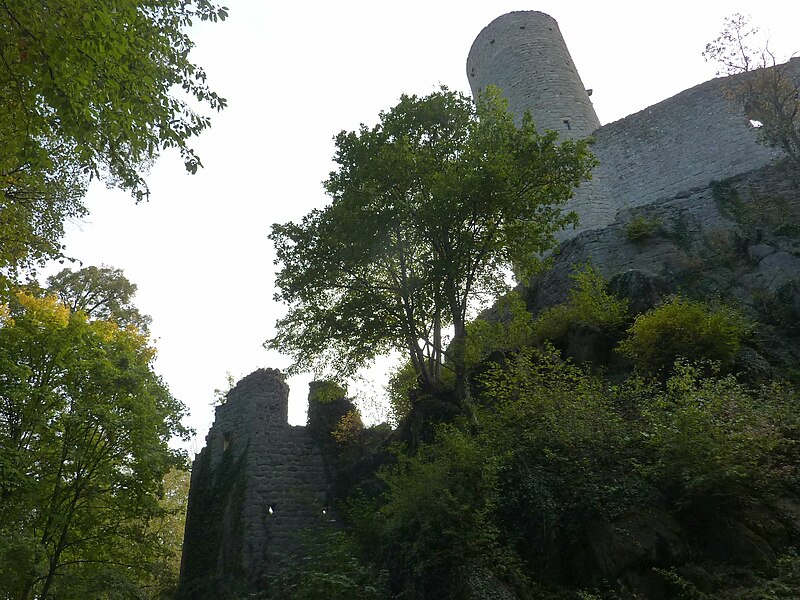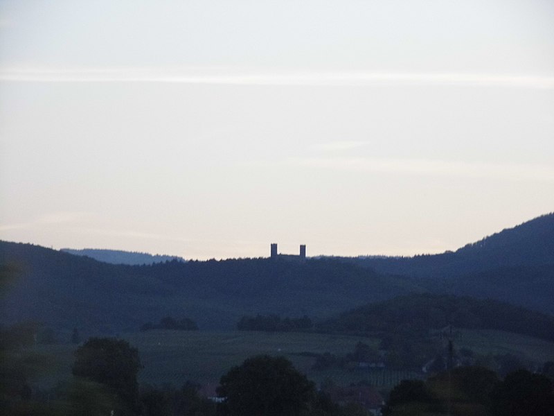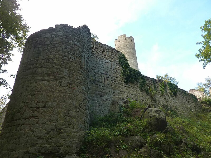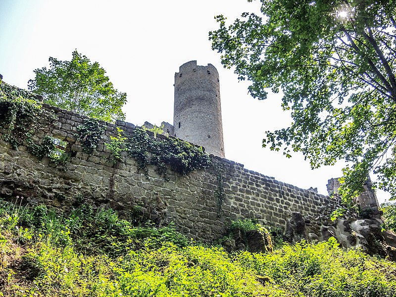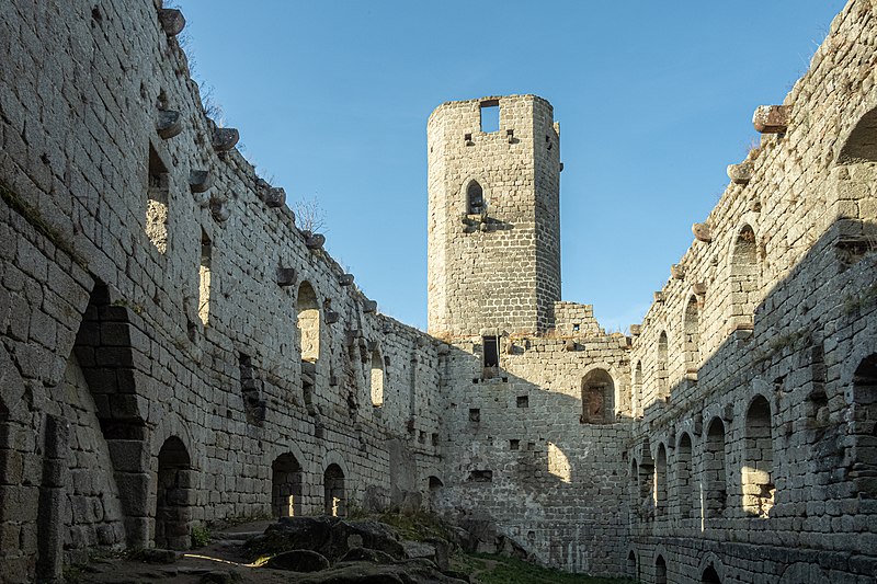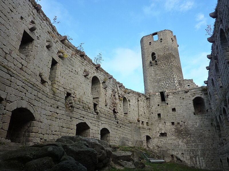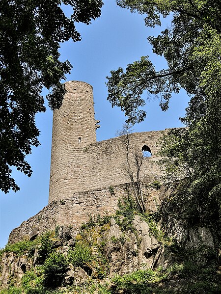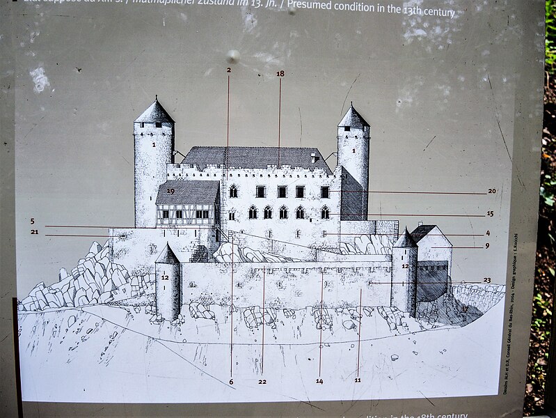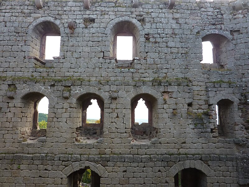 Le château du Haut‑Andlau, situé dans la commune d'Andlau (Bas‑Rhin), occupe une arête granitique étroite à 451 mètres d'altitude et domine les vallées de l'Andlau et de la Kirneck. Les sources divergent sur sa date de fondation : certaines l'attribuent aux sires d'Andlau à la fin du deuxième quart du XIVe siècle, peut‑être en remplacement d'un château plus ancien, tandis que d'autres mentionnent Eberhard d'Andlau entre 1246 et 1264 comme constructeur. Installé sur une arête d'environ vingt‑cinq mètres de large et quatre‑vingts mètres de long, orientée du sud‑sud‑est au nord‑nord‑ouest, il se compose d'un long logis d'habitation à trois niveaux flanqué à chaque extrémité de tours presque circulaires d'environ dix mètres de diamètre. Le niveau inférieur est percé d'archères, les deux niveaux supérieurs sont largement éclairés par des fenêtres ; l'ensemble est construit en granite extrait sur place. La basse‑cour a été transformée à la fin du XVe ou au début du XVIe siècle : elle était alors flanquée de deux petites tours, dotée d'un pont‑levis, de communs et d'une porte datée de 1538. À l'est, une forte pente montagneuse sert de défense naturelle ; sur les autres faces, un large fossé taillé dans le roc isole et protège l'enceinte. Le domaine resta aux comtes d'Andlau jusqu'à la Révolution et fut ensuite vendu comme bien national ; en 1796 il passa à un commerçant qui commença, à partir de 1806, à démanteler l'édifice pour revendre les matériaux. Racheté en 1818 par le comte Antoine‑Henri d'Andlau, il a été l'objet de travaux de consolidation en 1859, puis classé au titre des monuments historiques en juin 1926 ; une campagne de restauration menée en 1927‑1928 à l'initiative du Club vosgien a permis de stabiliser les ruines. Propriété de la famille d'Andlau, le site a conservé un usage patrimonial et culturel : en 1998 un pan d'enceinte est tombé, révélant la fragilité du monument, puis Guillaume d'Andlau a créé en 2000 l'association des Amis du château d'Andlau pour coordonner des campagnes de travaux. Depuis 2005 des chantiers d'insertion ont été organisés et le château a accueilli diverses activités autour de l'art contemporain et de la formation ; en 2019 il a été désigné comme site du Bas‑Rhin bénéficiaire de l'aide du loto du patrimoine. Les vestiges du Haut‑Andlau restent un témoin remarquable de l'architecture castrale en granite et de l'histoire locale.