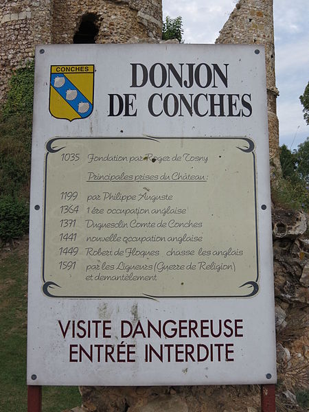 Les travaux du château débutent vers 1034 sous Roger Ier de Tosny ; la famille de Tosny conserve ce fief alors appelé Castellio (d’où Châtillon). Au printemps 1199, Philippe Auguste prend la forteresse et la donne en 1202 à son cousin Robert de Courtenay, moment où l’enceinte est agrandie et dotée de tours de flanquement. Conches, fief de Robert d’Artois, subit la chevauchée d’Henri de Lancastre en 1356 et le château est incendié. Par le traité de Mantes (1354), Jean II le Bon remet la ville et la forteresse à Charles II de Navarre, qui les confie successivement à Jean de Grailly puis à son oncle Archambaud. Bertrand du Guesclin assiège Conches en 1371 ; un accord du 4 février 1371 entraîne l’évacuation des Navarrais et permet d’épargner la forteresse. Henri V d’Angleterre s’empare du château en 1420 ; il est repris par les Français en 1440, reconquis l’année suivante par les Anglais, puis ces derniers sont chassés par Robert de Floques, bailli d’Évreux. En 1591 le château sert de refuge aux membres de la Ligue ; restant un point d’appui potentiel pour les ennemis de la monarchie, il est démantelé au XVIe siècle.