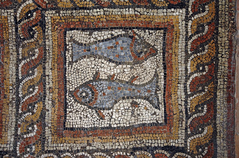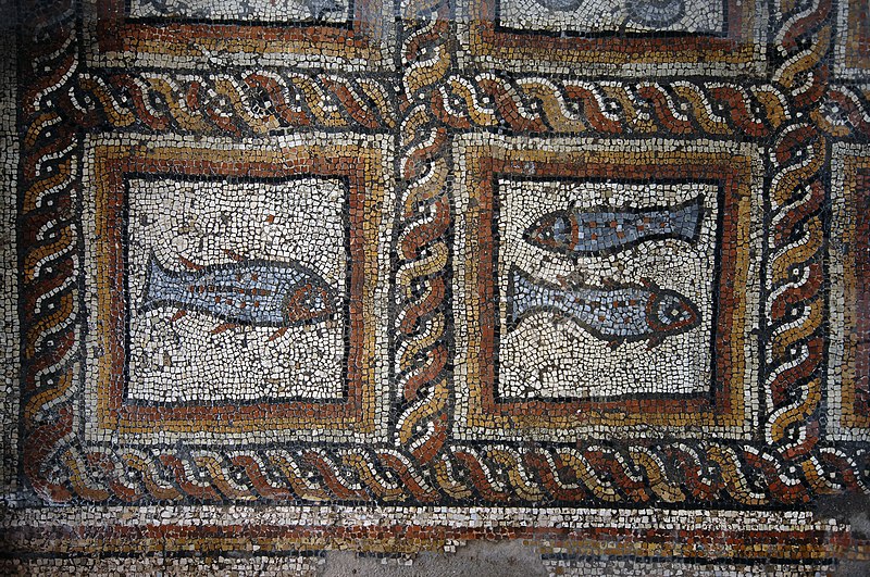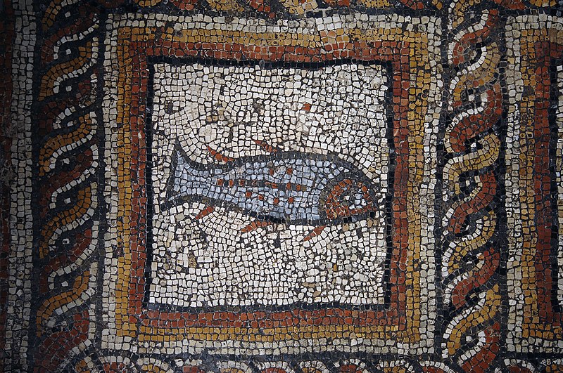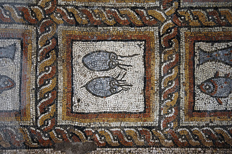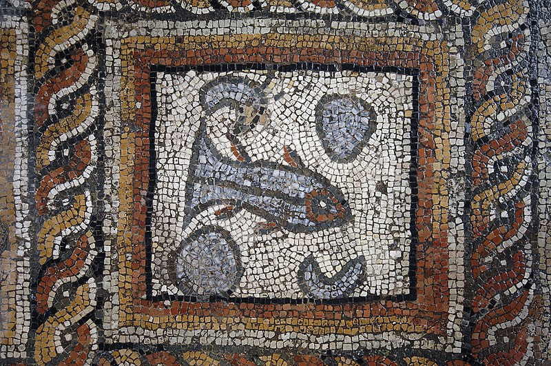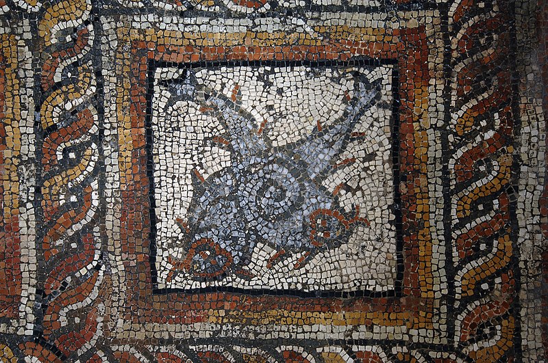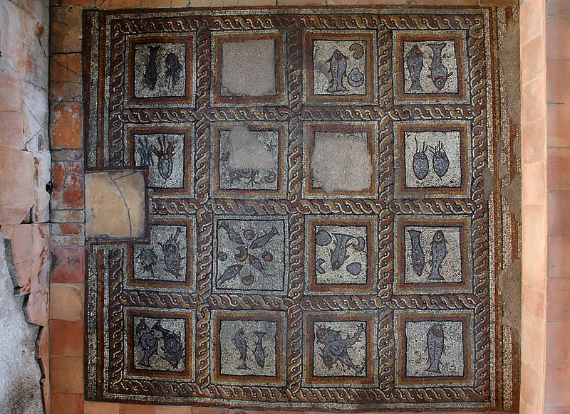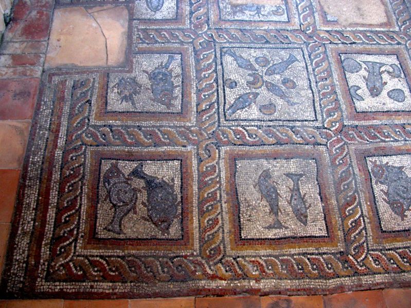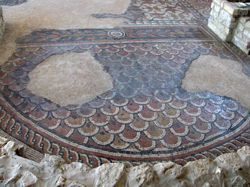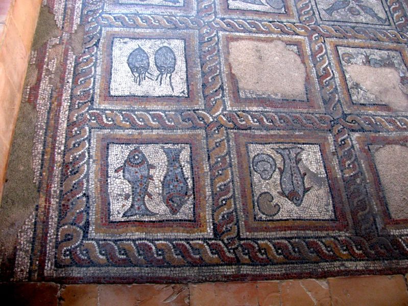 Le complexe thermal comprend une entrée ornée de boucliers et de nœuds de Salomon et, surtout, une piscine dont le fond est pavé d’une mosaïque carrée subdivisée en seize panneaux, treize d’entre eux représentant des animaux marins exécutés de façon sommaire ; les parois du bassin sont revêtues de carreaux en terre cuite, un gradin permettait de s’asseoir et une baignoire individuelle dallée de marbre se trouve à proximité, l’ensemble se vidant dans un caniveau. Cette piscine repose sur des constructions plus anciennes montrant des traces d’enduit hydraulique, peut-être une installation thermale antérieure.