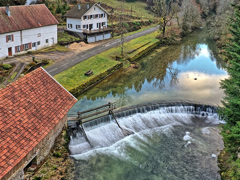 Située en rive droite du Dessoubre, au lieu-dit le moulin Girardot en aval de Laval‑le‑Prieuré, la scierie est le dernier témoin d’un moulin mentionné dès le XVe siècle et appartenant alors au prieuré de Laval. À l’origine, l’établissement comprenait un moulin à blé et une ribe pour le chanvre, actionnés par une ou plusieurs roues « en dessus ». Il semble s’être diversifié à la fin du XVIIIe siècle avec l’adjonction d’une scierie et d’une huilerie. Les archives signalent successivement plusieurs tenanciers et propriétaires : le moulin est acensé à Perrin Bassand en 1464, acheté par Jean Guyot‑Renaud en 1495 puis acensé à Fauvé en 1500 ; Etienne Girardot l’acquiert en 1706 et la famille apparaît sur la carte de Cassini sous l’appellation « moulin Fauvel » à la fin des années 1750. François‑Xavier Girardot fait construire une habitation en 1772 ; au début du XIXe siècle le site, alors propriété de Donat Girardot, est représenté sur le cadastre napoléonien en deux emplacements comprenant l’usine, la scierie, l’huilerie, des maisons et des dépendances. En 1851 la propriété est exploitée par Xavier Boulet (ou Poulet) ; le moulin principal compte cinq paires de meules et quatre roues hydrauliques verticales, tandis que le Moulin Fauvé actionne scierie, huilerie et ribe par trois roues hydrauliques, la scierie ne fonctionnant qu’une partie de l’année et la ribe et l’huilerie un à deux mois. Vers 1868 la propriété passe à Emile Girardot et Sigismond Constant de Baume, puis autour de 1883 à Emile Girardot seul, qui rebâtit la scierie avant 1884 et ajoute une habitation à l’est. L’exploitation change encore de mains à la fin du XIXe et au début du XXe siècle ; Constant Revillot devient propriétaire vers 1907 et rachète l’établissement en 1910. En 1912 Louis installe, dans la chambre d’eau, deux turbines Douge Frères (système Francis) ; un hangar de séchage prolonge le bâtiment vers 1918, marque d’une spécialisation dans le sciage et le commerce du bois, et l’affaire emploie une dizaine de personnes à la fin de la Première Guerre mondiale. L’exploitation est reprise en 1943 par le fils de Louis, Constant, qui fait édifier entre 1951 et 1958 une maison dont le sous‑sol abrite un grand garage destiné au camion et au tracteur forestier. Dans les années 1950 une scie électrique multiple remplace une des scies verticales à châssis en bois, l’autre étant immobilisée ; en 1959 les turbines Douge sont remplacées par un moteur diesel, puis par un moteur électrique avant 1980. Au tournant des années 1980 la scierie n’emploie plus que deux ouvriers ; l’activité cesse en 1988, le matériel est démonté et le moulin est détruit par un incendie en 1989, tandis que la maison des années 1950 est convertie en gîte. L’ensemble formé par la scierie, ses installations mécaniques, le hangar de séchage, le quai de chargement, la voie ferrée et le canal sous les deux bâtiments est inscrit au titre des monuments historiques par arrêté du 3 août 2004. Des travaux de restauration ont été conduits : la vanne de prise d’eau en 2012, la charpente en 2016 et la scierie elle‑même restaurée en 2016 ; seules subsistent en place les transmissions. Le bâtiment principal est un volume rectangulaire implanté le long de la rive, alimenté par un barrage courbe construit légèrement en biais pour amener l’eau sous le moulin, et il est prolongé par le hangar de séchage ; les habitations se situent de l’autre côté de la route.