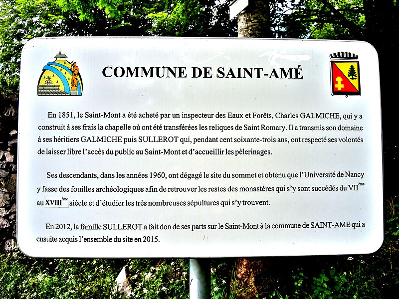 Le site archéologique du Saint-Mont se situe sur les communes de Saint-Amé et de Saint-Étienne-lès-Remiremont, dans le département des Vosges. Entre 1964 et 1991, plusieurs campagnes de fouilles conduites successivement par Michel Rouillon puis par Charles Kraemer ont mis au jour de nombreuses structures et artefacts. Ces découvertes couvrent principalement une période allant de l'Antiquité tardive à l'époque moderne. Le site est inscrit au titre des monuments historiques en 1995. Parmi les références et ressources figurent le portail des Vosges, le portail des monuments historiques français et le portail de l'archéologie ; on peut par ailleurs consulter la liste des monuments historiques du département des Vosges.