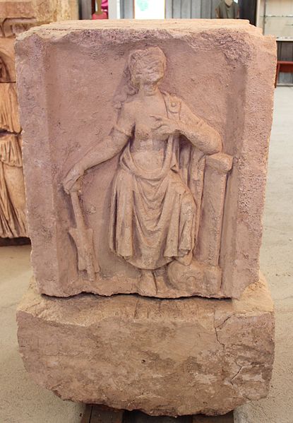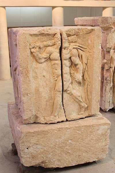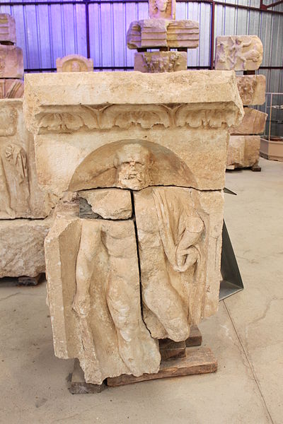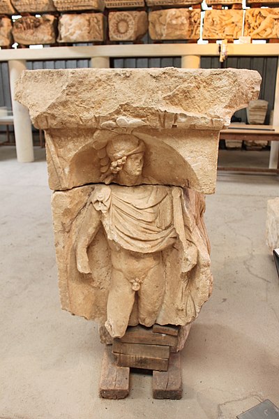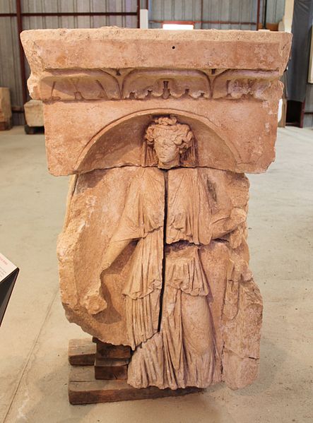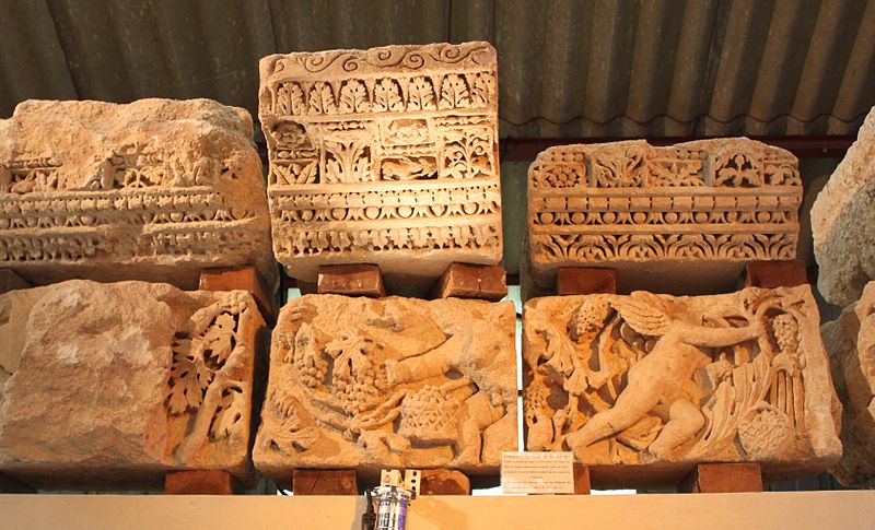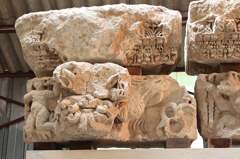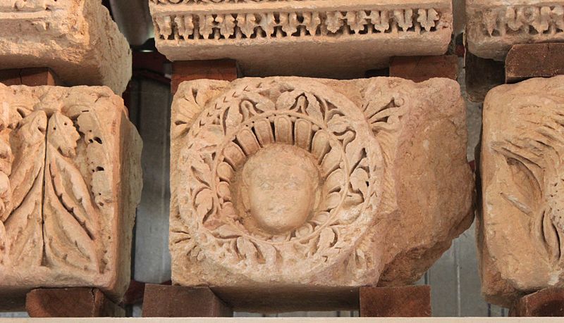 Les fondations des thermes reposent sur des blocs sculptés réemployés ; les frises montrent surtout des décors végétaux avec rinceaux d'acanthe, deux scènes de vendange permettant d'identifier un « plant de César », ainsi que des scènes mythologiques (silène, griffon, sphinge, monstre marin) et les dieux Apollon et Cernunnos. Les corniches présentent plusieurs registres de motifs romains (rais-de-cœur, oves, perles, denticules) et des caissons à fleurs alternant avec des métopes figurant animaux, végétaux, crosses ou visages.