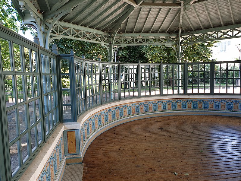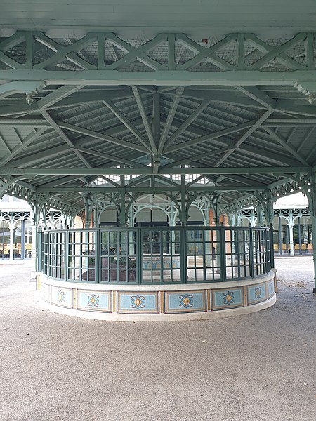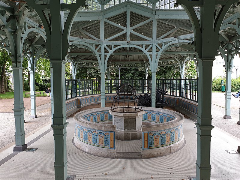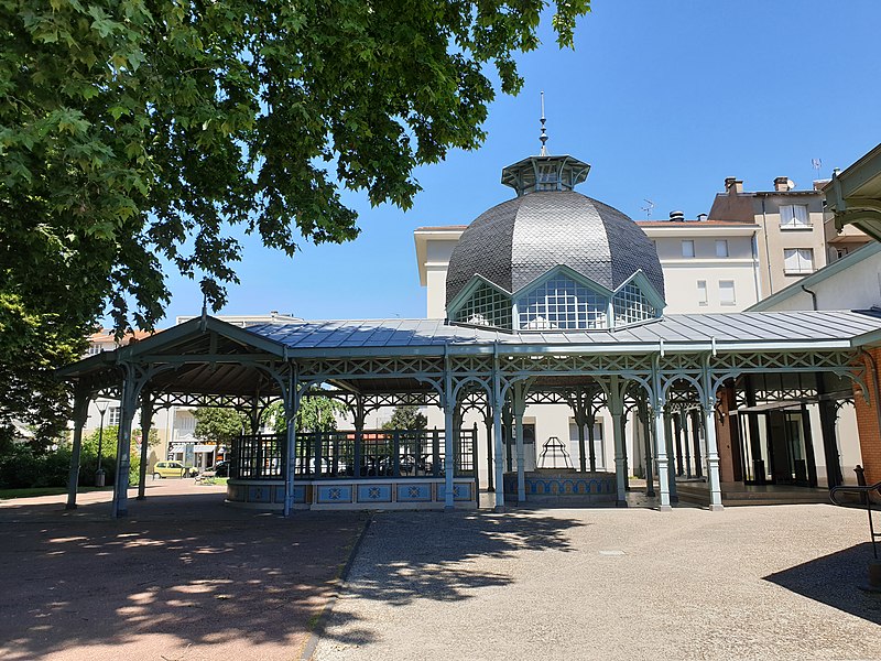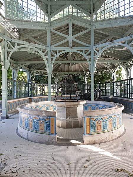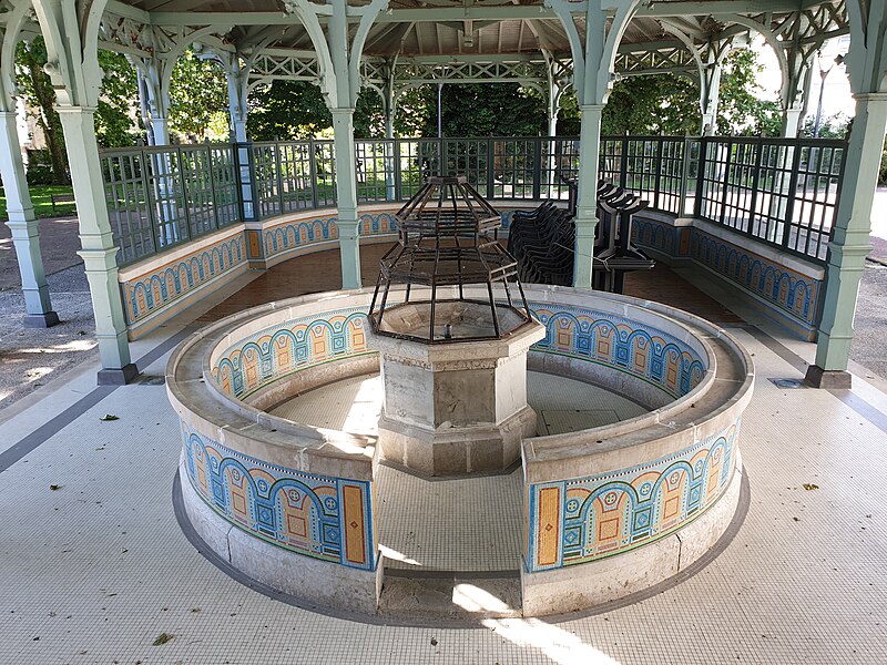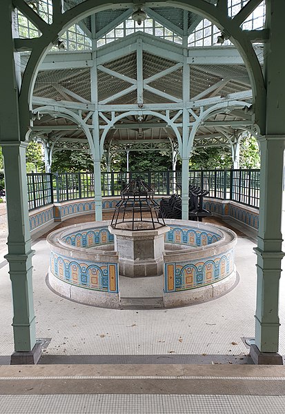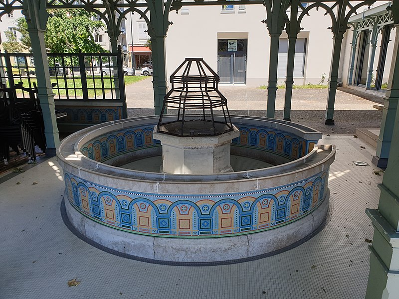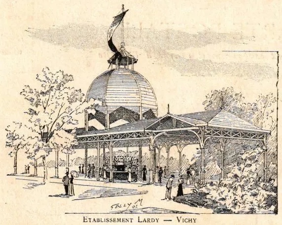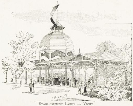 La source Lardy se situe à Vichy, 111 rue du Maréchal-Lyautey, dans le département de l'Allier en région Auvergne-Rhône-Alpes. Découverte en 1844, elle fut exploitée à partir de 1848 mais n'est plus utilisée aujourd'hui. Le pavillon actuel, construit en 1900, remplace des constructions primitives en bois couvertes de chaume. Restauré à l'identique en 2001 lors de la transformation des bains Lardy en pôle universitaire et technologique, il comporte 400 000 pièces de mosaïque. On attribue à l'architecte Antoine Percilly la galerie qui, autrefois, enjambait les buveurs. Le bâtiment est en bois, de plan rectangulaire terminé au nord par trois pans, et repose sur treize piliers de bois. Son plan en U contient, à l'intérieur, un mur qui clôt les sources et supporte une verrière à petits bois ; ce mur est, à l'intérieur comme à l'extérieur, revêtu de carreaux de faïence aux teintes bleu, jaune, vert et or. L'espace intérieur est divisé en deux parties séparées par une différence de niveau matérialisée par un escalier et une grille en fer forgé. Dans chacune des parties, un bassin circulaire, recouvert des mêmes carreaux de faïence, abritait la source, la source arrière étant protégée par une cloche de verre. Au-dessus de cette source a été érigé un dôme hexagonal couvert en écailles et couronné d'un lanternon. Ce pavillon constitue à Vichy l'un des derniers vestiges des constructions en bois dites fabriques, qui faisaient la transition entre l'architecture en pierre et l'architecture métallique. La source et le hall qui la couvre sont partiellement classés au titre des monuments historiques par arrêté du 8 février 1986.