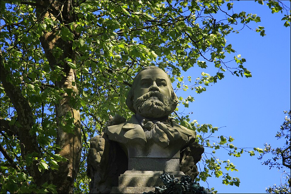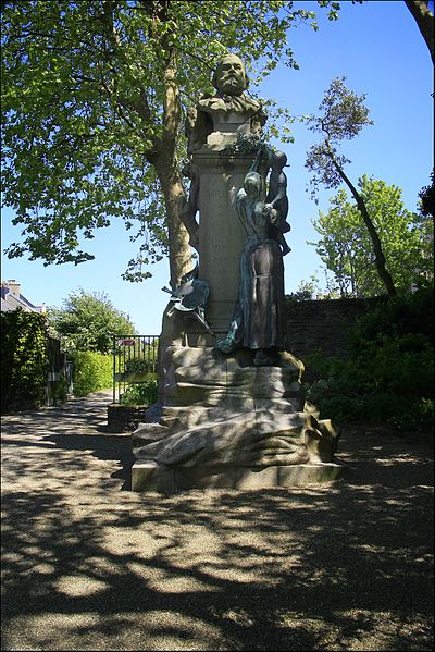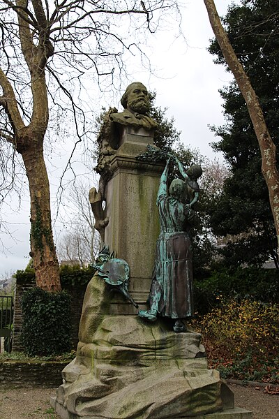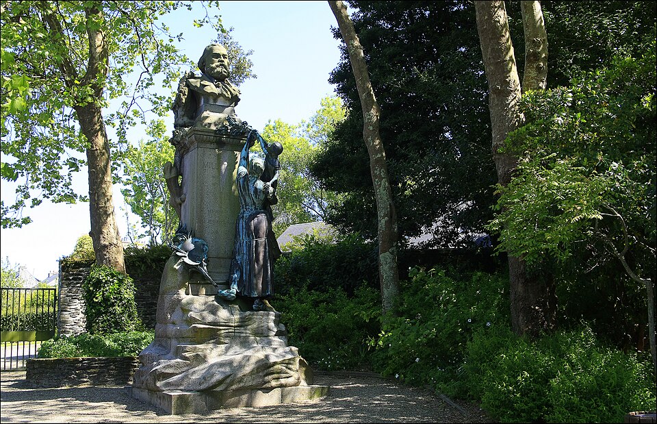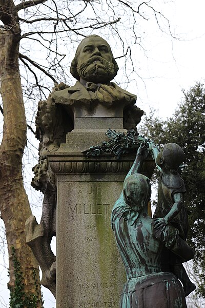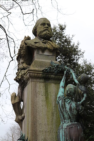 Une souscription ouverte en 1886 a permis d'élever un monument à Jean‑François Millet dans le jardin public d'Octeville. Le projet fut confié d'abord à Henri Chapu, puis, après le décès de Chapu, à Jean‑Ernest Bouteiller. Bouteiller redessina le buste et y ajouta un groupe allégorique représentant une paysanne, son enfant dans les bras, qui tend au peintre des fleurs des champs. Le piédestal présente une nature‑morte derrière le buste et des rochers de Gréville à la base. Le monument associe le marbre pour le buste, le bronze pour le groupe et le granit pour le piédestal. Jean‑François Millet est né le 4 octobre 1814 au hameau de Gruchy, à Gréville, et est mort le 20 janvier 1875 à Barbizon. Peintre réaliste, pastelliste, graveur et dessinateur, il fut l'un des fondateurs de l'école de Barbizon et est surtout connu pour ses scènes champêtres et paysannes, dont s'inspire directement l'allégorie sculptée.
