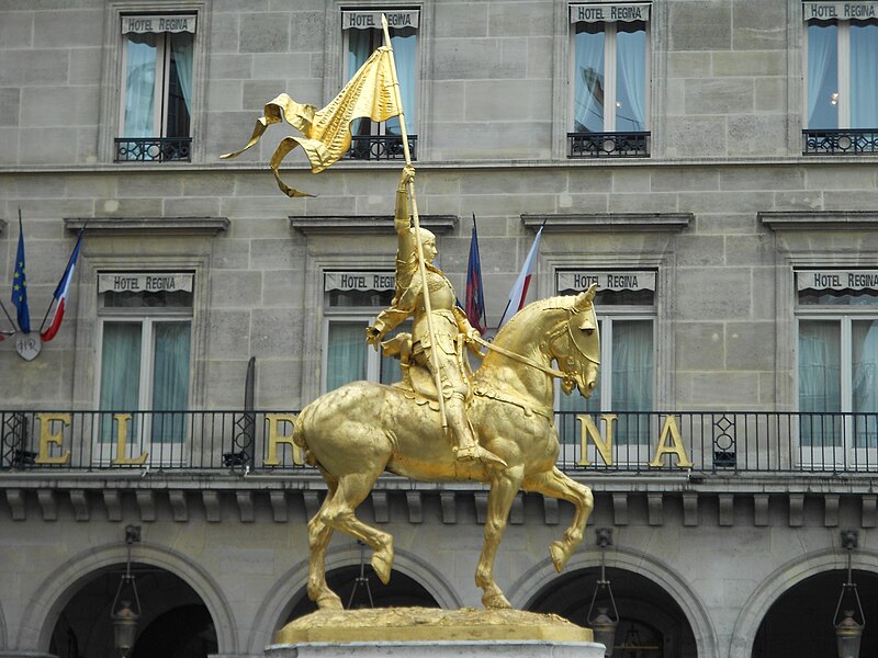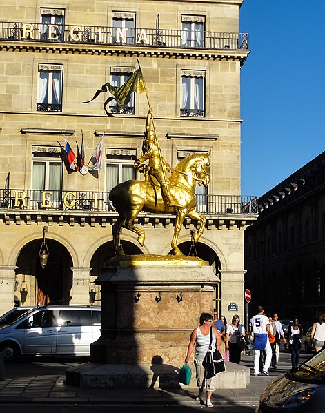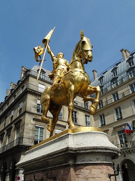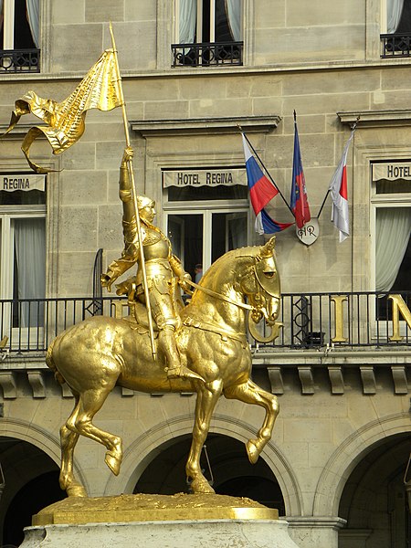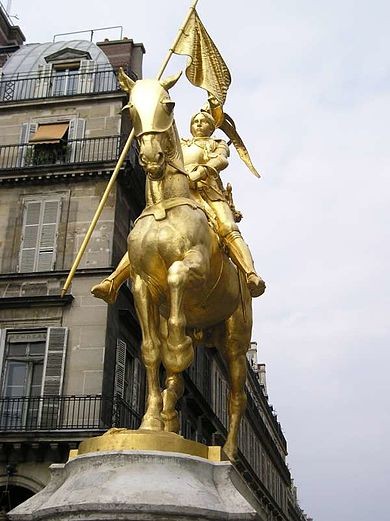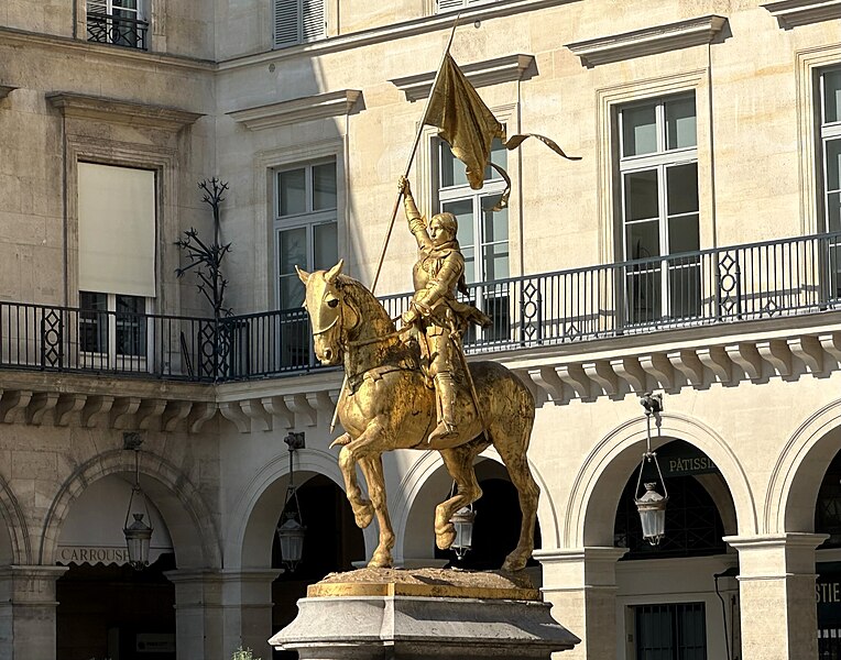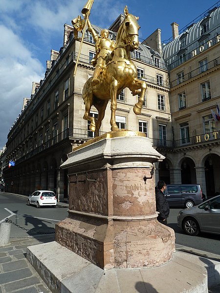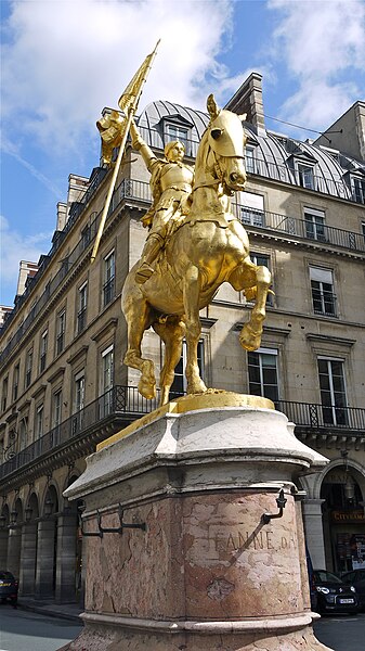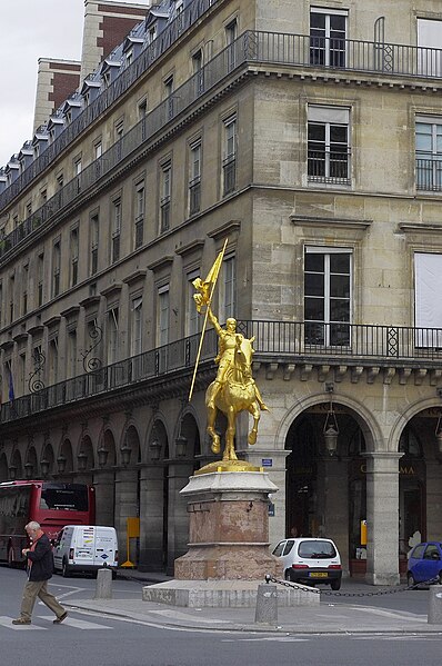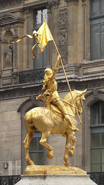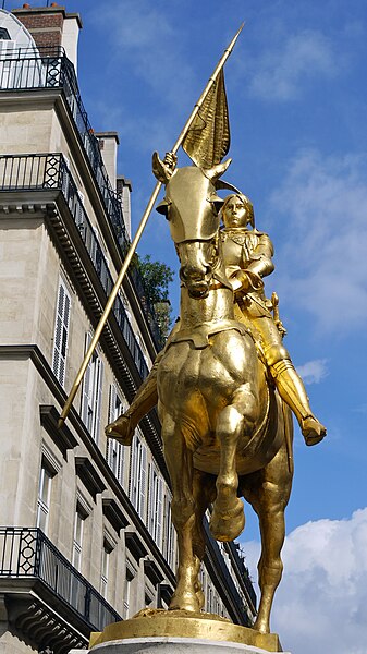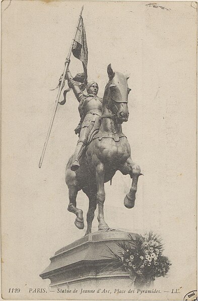 Commandée par le gouvernement à la suite de la défaite de 1870, la statue de Jeanne d'Arc d'Emmanuel Frémiet vise à redonner confiance à une nation humiliée et incarne la symbolique de la reconquête. Inaugurée et installée en 1874, elle occupe le centre de la place des Pyramides, dans le 1er arrondissement de Paris, à proximité du lieu où Jeanne aurait été blessée en tentant d'entrer dans la ville. Il s'agit d'une statue équestre en bronze doré représentant Jeanne tête nue, en armure, brandissant un étendard de la main droite et chevauchant un puissant cheval caparaçonné. Le piédestal a été conçu par l'architecte Paul Abadie, la grille par Gabriel Davioud et la fonte réalisée par la fonderie Thiébaut Frères. Frémiet utilisa comme modèle une paysanne lorraine originaire de Domrémy, Aimée Girod. À l'origine, la disproportion entre la frêle cavalière et le cheval de trait suscita des critiques, mais certains commentateurs d'art défendirent ensuite l'effet de contraste et la qualité de l'œuvre. Frémiet exécuta une nouvelle version pour Nancy en 1889, réduisant la taille du cheval, puis remplaça en 1899 le cheval de Paris par le modèle de Nancy, modification qui provoqua une polémique. Parmi les quelque 150 statues érigées à Paris entre 1870 et 1914, la Jeanne d'Arc de la place des Pyramides reste la seule commande publique de l'État de cette période. Le monument est classé au titre des monuments historiques depuis le 31 mars 1992. La version de Frémiet a donné lieu à de nombreuses reproductions, visibles notamment à Lille, Compiègne, Saint-Étienne, La Nouvelle-Orléans, Philadelphie, Portland et Melbourne. La statue sert régulièrement de lieu de rassemblement politique, notamment lors des manifestations du 1er mai organisées par le Front national, devenu Rassemblement national. Elle apparaît également dans la fiction et la scène : elle est un objectif dans le film Nocturama de Bertrand Bonello, où les dégâts montrés à l'écran sont des effets numériques, et elle a été intégrée comme décor dans une mise en scène de La traviata à l'Opéra Garnier en 2019.