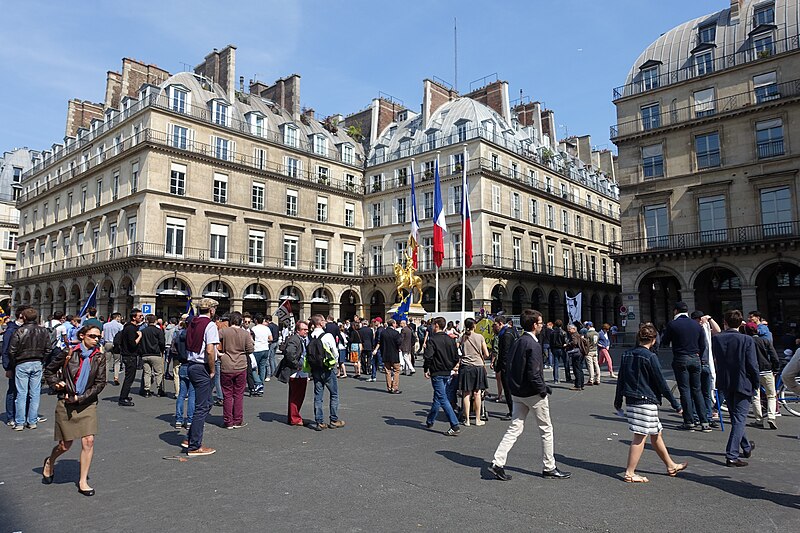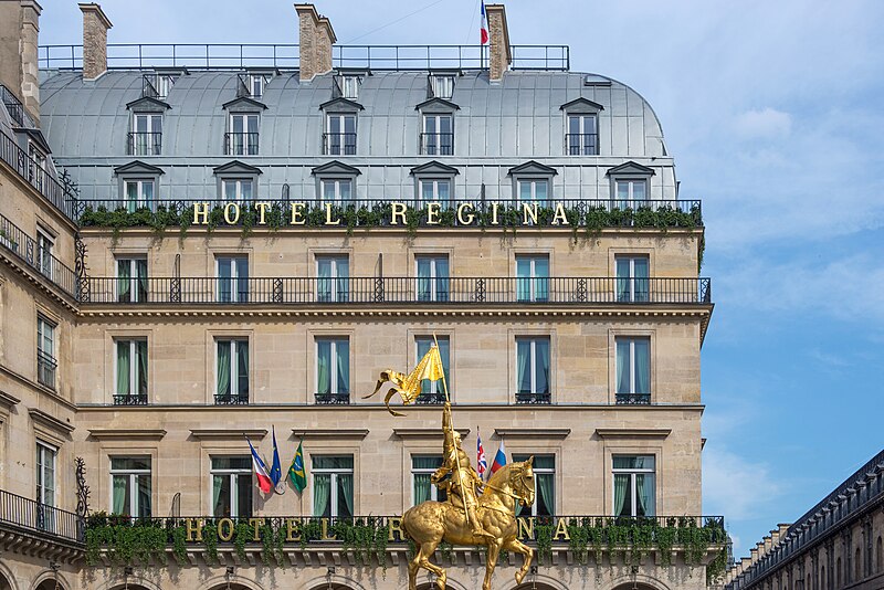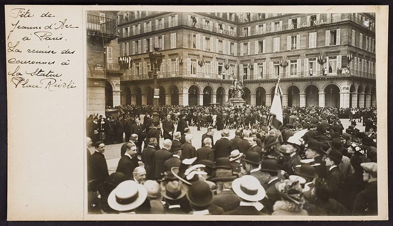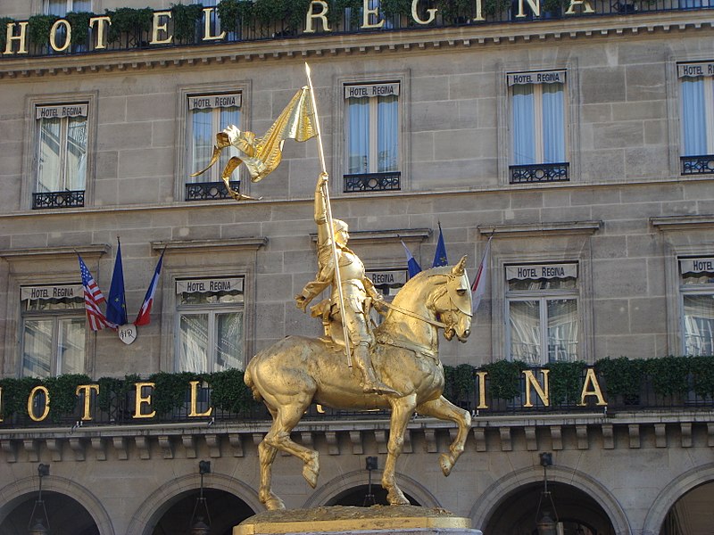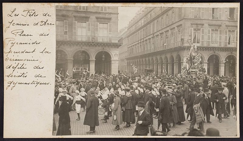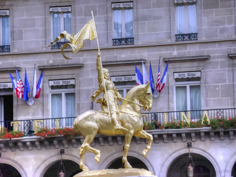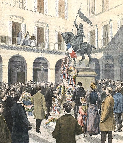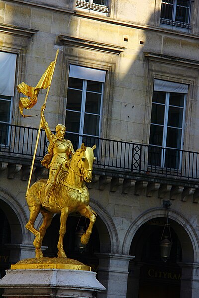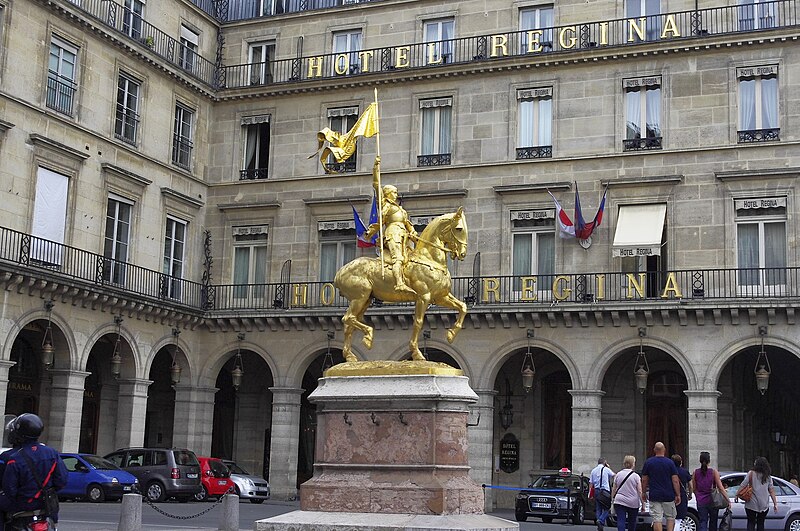 Commandée par le gouvernement à la suite de la défaite de 1870, la statue de Jeanne d'Arc d'Emmanuel Frémiet vise à redonner confiance à une nation humiliée et incarne la symbolique de la reconquête. Inaugurée et installée en 1874, elle occupe le centre de la place des Pyramides, dans le 1er arrondissement de Paris, à proximité du lieu où Jeanne aurait été blessée en tentant d'entrer dans la ville. Il s'agit d'une statue équestre en bronze doré représentant Jeanne tête nue, en armure, brandissant un étendard de la main droite et chevauchant un puissant cheval caparaçonné. Le piédestal a été conçu par l'architecte Paul Abadie, la grille par Gabriel Davioud et la fonte réalisée par la fonderie Thiébaut Frères. Frémiet utilisa comme modèle une paysanne lorraine originaire de Domrémy, Aimée Girod. À l'origine, la disproportion entre la frêle cavalière et le cheval de trait suscita des critiques, mais certains commentateurs d'art défendirent ensuite l'effet de contraste et la qualité de l'œuvre. Frémiet exécuta une nouvelle version pour Nancy en 1889, réduisant la taille du cheval, puis remplaça en 1899 le cheval de Paris par le modèle de Nancy, modification qui provoqua une polémique. Parmi les quelque 150 statues érigées à Paris entre 1870 et 1914, la Jeanne d'Arc de la place des Pyramides reste la seule commande publique de l'État de cette période. Le monument est classé au titre des monuments historiques depuis le 31 mars 1992. La version de Frémiet a donné lieu à de nombreuses reproductions, visibles notamment à Lille, Compiègne, Saint-Étienne, La Nouvelle-Orléans, Philadelphie, Portland et Melbourne. La statue sert régulièrement de lieu de rassemblement politique, notamment lors des manifestations du 1er mai organisées par le Front national, devenu Rassemblement national. Elle apparaît également dans la fiction et la scène : elle est un objectif dans le film Nocturama de Bertrand Bonello, où les dégâts montrés à l'écran sont des effets numériques, et elle a été intégrée comme décor dans une mise en scène de La traviata à l'Opéra Garnier en 2019.
