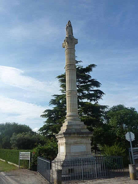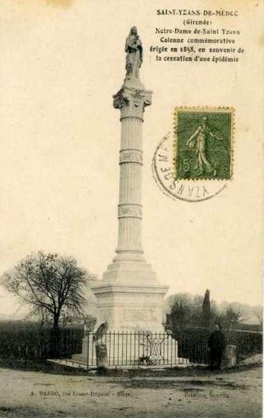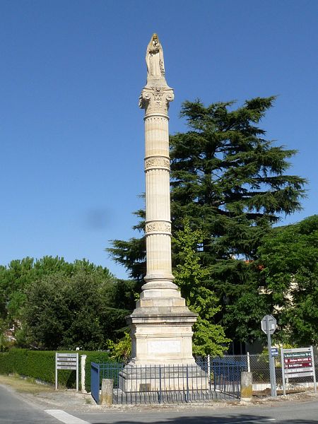 Le monument semble s’être inspiré de la « colonne à la Vierge » de Saint-Yzans de Médoc, élevée en 1856-1858 dans le contexte d’un épisode de fièvre typhoïde. On ignore si Saint-Germain d’Esteuil a été lui aussi touché par une épidémie ou si la paroisse a simplement voulu posséder une colonne similaire. Il se dresse sur un socle massif et quadrangulaire portant quatre courtes inscriptions latines et une date. La base attique est ponctuée de griffes ; le fût, lisse, est ceint à mi-hauteur d’une épaisse bague ornée de lettres mêlées à des feuillages. Au-dessus d’un lourd chapiteau se trouve la statue de la Vierge à l’Enfant.