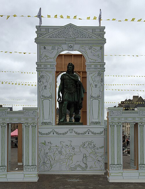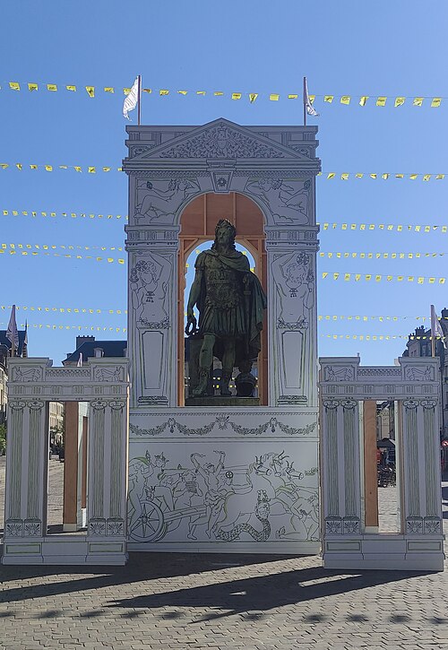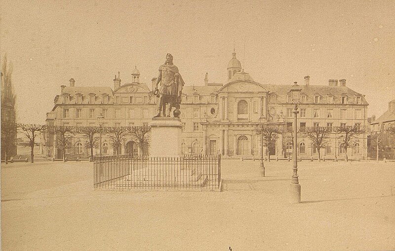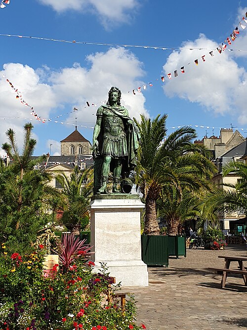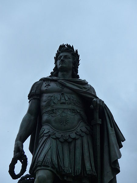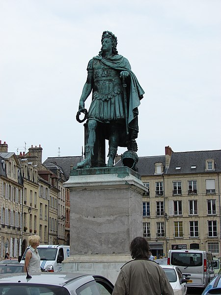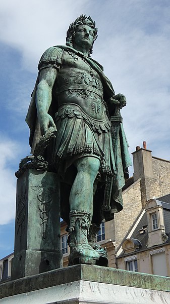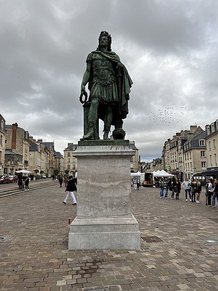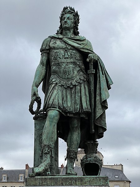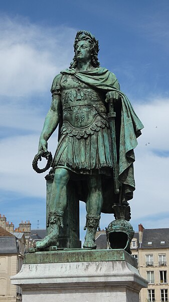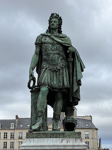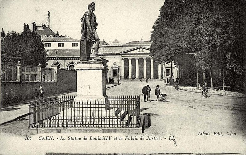La statue de Louis XIV, œuvre en bronze du sculpteur Louis Petitot, se trouve à Caen, dans le Calvados, et s'inscrit dans le courant néo-classique. Installée à partir de 1828 pour marquer la fidélité de la ville au régime de la Restauration, elle remplace une première effigie royale érigée en 1685 et renversée pendant la Révolution. La première statue, débutée par Jean Postel et acquise par Jean Regnault de Segrais, avait été inaugurée le 5 septembre 1685 ; sculptée dans une pierre friable, elle mesurait huit pieds et reposait sur un piédestal de douze pieds, mais fut rapidement détériorée et finalement abattue en juillet 1791. La nouvelle commande prit plusieurs années : après des projets concurrents, la réalisation fut confiée à Louis Petitot et le bronze fut fondu en 1827 dans les ateliers de Charles Crozatier. Présentée au Salon de 1827, l'œuvre fut officiellement inaugurée le 24 avril 1828 et accompagna la fabrication d'une médaille commémorative. Installée à l'origine sur la place Royale, devenue place de la République, la statue fut déplacée à la fin du XIXe siècle devant l'abbaye aux Hommes, occupée alors par le lycée Malherbe, et y demeura jusqu'en 1961. Le transfert, décidé par le maire Albert Mériel en 1882 pour aménager la place en square, suscita une vive polémique qui dépassa la région. Sous l'Occupation, la statue fut envisagée pour la fonte par la mobilisation des métaux non ferreux en 1941, mais elle fut finalement préservée pour son intérêt historique. En 1961, dans le cadre de l'achat et de la transformation de l'abbaye en hôtel de ville, la statue fut transférée sur la place Saint-Sauveur, où elle est installée depuis le 2 décembre 1961. L'ensemble statue et socle a été inscrit au titre des monuments historiques par arrêté du 18 août 2006. Retirée pour restauration le 26 juillet 2012, la statue a été replacée le 14 juin 2013 sur son socle d'origine, légèrement déplacée vers l'ouest et sans les trois marches qui existaient depuis 1828. Le monument mesure environ 3,65 m de hauteur ; la statue en bronze repose sur un piédestal sculpté dans du marbre du Boulonnais, et la signature du sculpteur est gravée sur la plinthe du bronze. Louis XIV y est représenté en empereur romain, le front ceint d'une couronne de laurier, vêtu d'une tunique et d'une cuirasse ornée de victoires ailées et d'un trophée, le torse en partie couvert d'un paludamentum fixé par une fibule. Il porte des calcei mullei décorés, a le pied droit appuyé sur une épée brisée et la main gauche posée sur un glaive, tandis que la main droite tient des rameaux de laurier ; à sa droite, un cippe présente un caducée et, sur les autres faces, des trophées évoquant la guerre, la marine et les arts. Petitot a placé à ses pieds un galea surmonté d'un cimier en plumes ; jusqu'en 1830, le casque et les festons de la cuirasse étaient ornés de fleurs de lys. L'iconographie vise à montrer le monarque comme protecteur des arts et du commerce, revenu en paix et prêt néanmoins à reprendre les armes. Sur le plan des sources et influences, Petitot s'est inspiré notamment de l'Auguste de Prima Porta et de la tradition de représentation à l'antique de Louis XIV, telle qu'on la trouve chez Coysevox ; il réalisera par la suite un cavalier pour Versailles. L'œuvre, accueillie favorablement par le pouvoir et par l'Académie des beaux-arts de son temps, a aussi fait l'objet de critiques pour sa froideur et un style jugé parfois outré ; ces réserves ont été formulées notamment par Paul de Longuemare et apparaissent encore dans des évaluations ultérieures. Aujourd'hui la statue demeure un élément important du patrimoine public de Caen, à la fois pour sa valeur historique et pour sa portée symbolique.