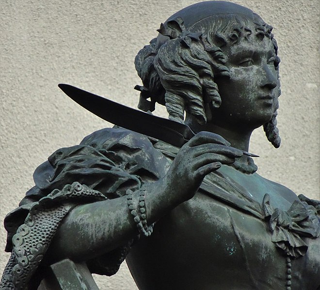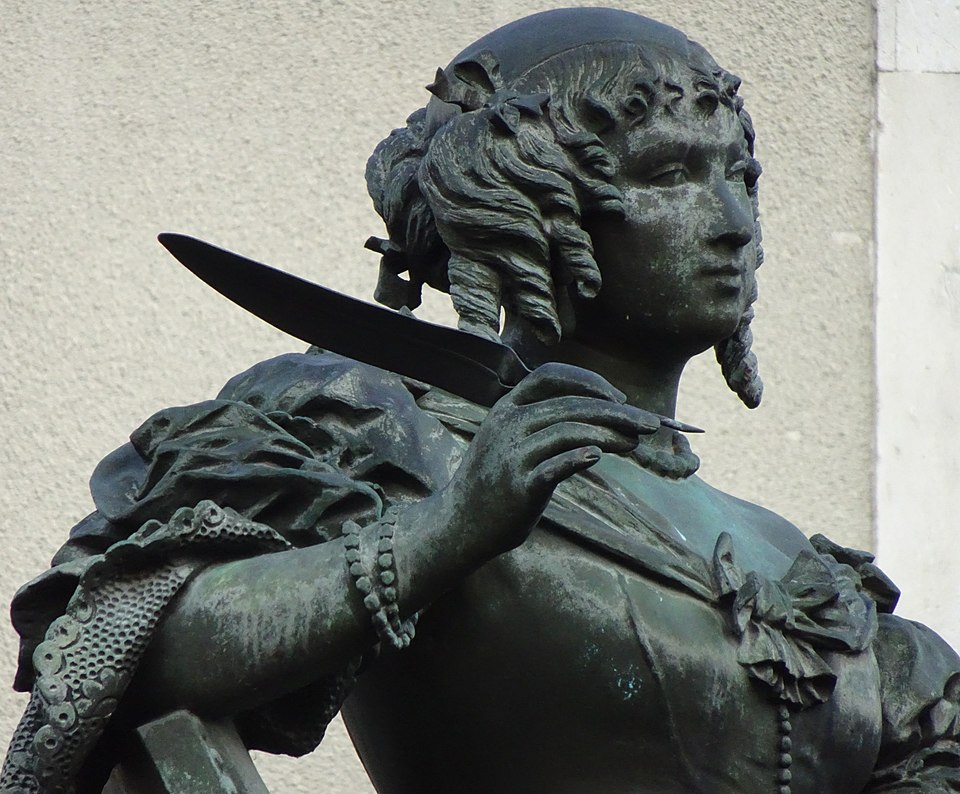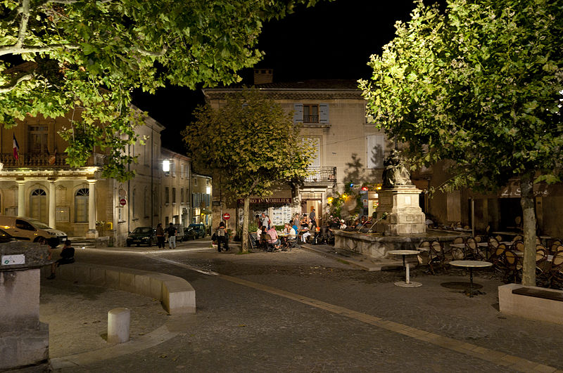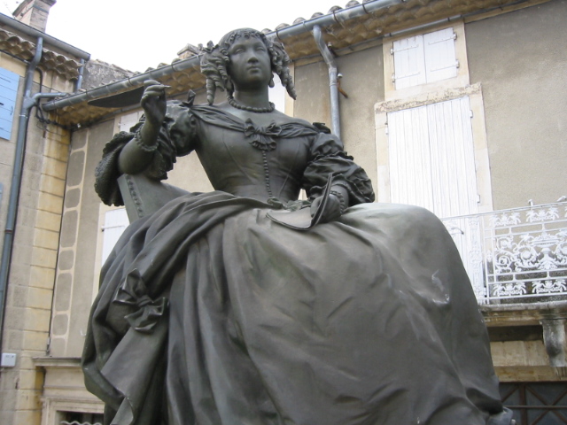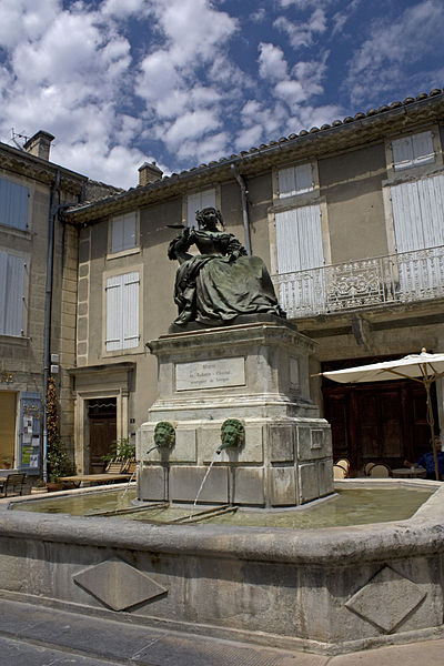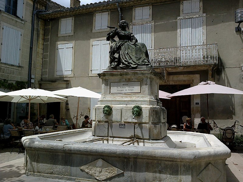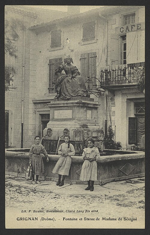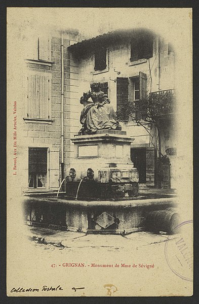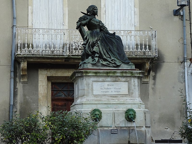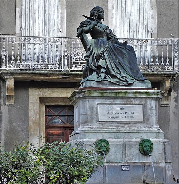 Érigée en 1857 à l'initiative de François-Auguste Ducros, alors maire de Grignan (1837-1868), et financée par souscription, la statue de Madame de Sévigné est une œuvre du sculpteur Louis Rochet. Elle repose sur un bassin rectangulaire aux pans coupés, auquel s'ajoute un piédestal central en pierre supportant la statue en bronze représentant la marquise assise, la plume dans la main droite et une lettre dans la main gauche. L'eau s'écoule dans le bassin par quatre masques en bronze à tête de lion, disposés deux par deux sur les grands côtés du soubassement. Sur les petits côtés du socle sont sculptés deux écus armoriés accompagnés des mentions « armes des Bussy » à l'ouest et « armes de Sévigné » à l'est. Deux plaques de marbre enchâssées sur les grands côtés portent, au sud, « Marie de Rabutin-Chantal, marquise de Sévigné » et, au nord, l'inscription « Une souscription nationale a élevé cette statue à l'immortelle madame de Sévigné le 4 octobre 1857 ».