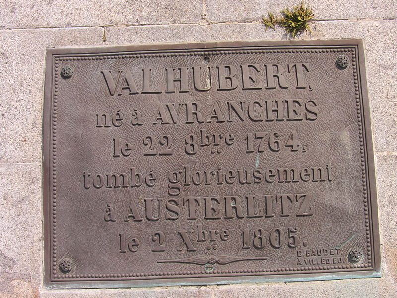 La statue de Valhubert, en marbre, se trouve place Valhubert à Avranches, dans la Manche. Elle représente Jean-Marie Valhubert, général né à Avranches en 1764, qui fut blessé à Austerlitz et mourut à Brünn en 1805. L'œuvre est signée du sculpteur Pierre Cartellier. Napoléon commanda à Cartellier une série de statues destinées au pont de la Concorde, parmi lesquelles figurait celle de Valhubert. Le modèle en plâtre fut achevé en 1812 et la version en marbre en 1815. Sous Louis XVIII, la statue fut finalisée et placée dans une cour des Invalides. À la demande du beau‑frère du général et de la ville d'Avranches, elle arriva en 1829 et fut érigée dans les jardins de l'Évêché en 1832. Le personnage est représenté debout, en uniforme de général, tenant dans la main droite le sabre d'honneur reçu en 1803. Un boulet de canon, symbolisant celui qui le blessa mortellement, est figuré près de son pied droit. L'ensemble mesure 4,50 mètres de hauteur. Le monument et son socle sont inscrits au titre des monuments historiques depuis le 18 août 2006.