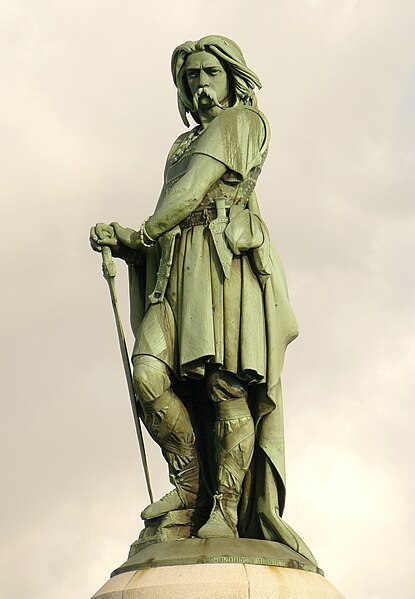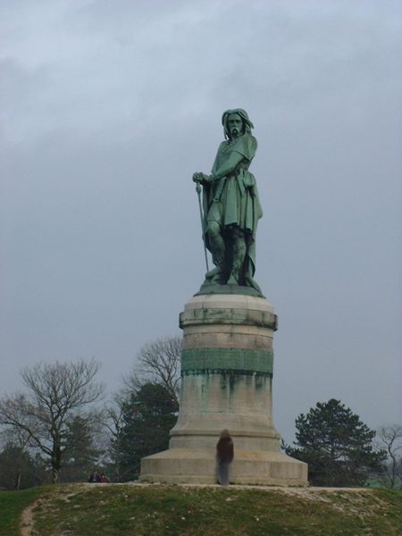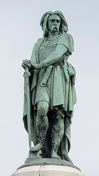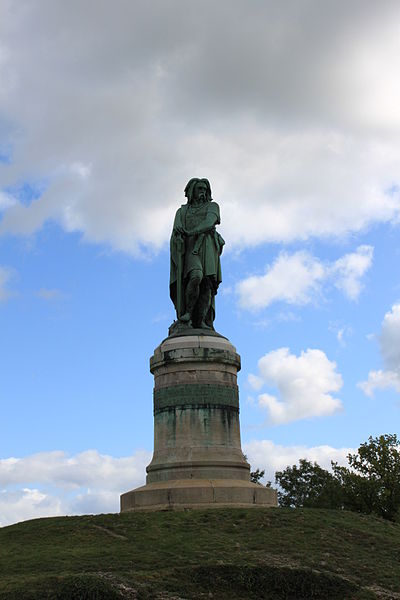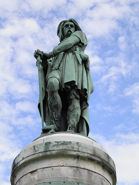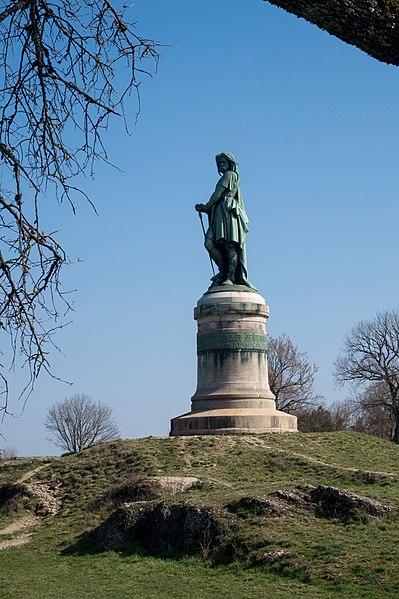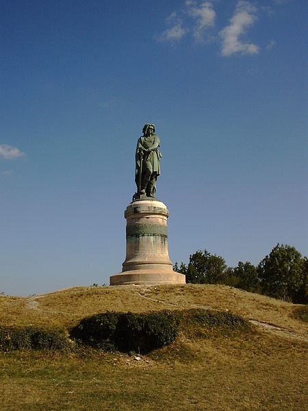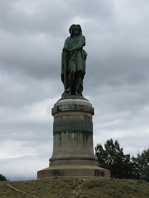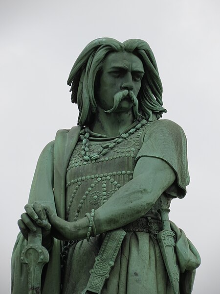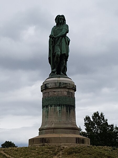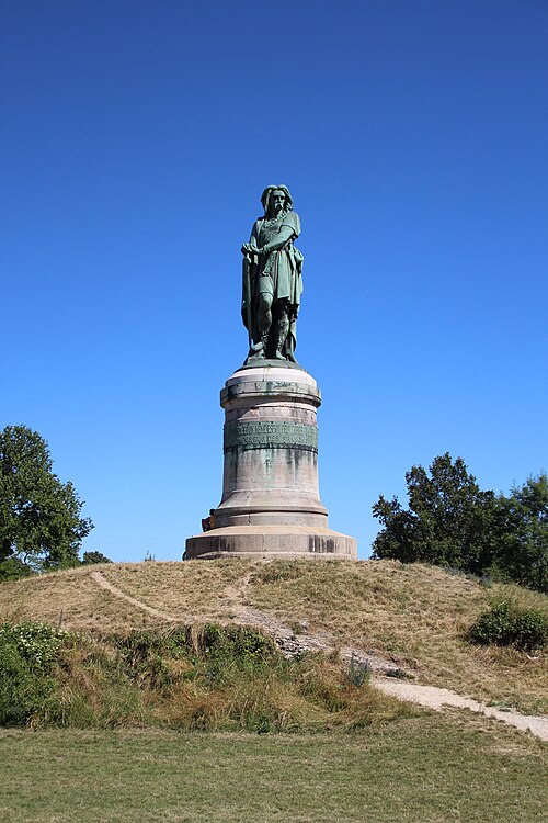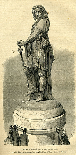 Le Monument de Vercingétorix, œuvre du sculpteur Aimé Millet, domine depuis 1865 le village d'Alise‑Sainte‑Reine, sur le mont Auxois, site de l'oppidum d'Alésia. La statue fut érigée en août 1865, financée par Napoléon III, mais elle ne fut jamais inaugurée. Construite à Paris et exposée au Salon de 1865 au palais de l'Industrie, elle fut transportée et installée le 27 août 1865 à l'extrémité ouest du mont Auxois, dominant le champ de bataille. L'ensemble associe une statue en tôle de cuivre battue et repoussée, rivetée sur une charpente métallique, haute de 6,60 m et d'environ cinq tonnes, à un piédestal de 7 mètres en granit de Saulieu et pierre de Pouillenay dessiné par Eugène Viollet‑le‑Duc. Un bandeau de bronze porte la devise « La Gaule unie, formant une seule nation, animée d'un même esprit, peut défier l'univers », variation d'un passage rapporté par Jules César dans De Bello Gallico (VII, 29) et marquée par le vocabulaire national du XIXe siècle ; en dessous figure l'inscription « Napoléon III, empereur des Français, à la mémoire de Vercingétorix ». La statue est creuse et son mode de fabrication la rapproche, par principe, de la statue de la Liberté. Vercingétorix y est représenté dans un style romantique, archétype de l'image du Gaulois au XIXe siècle : moustaches tombantes, longs cheveux hirsutes, attitude morne et traits évoquant Napoléon III, ainsi qu'un collier de perles. La parure et les armes présentent de nombreux anachronismes : les bandelettes entourant les braies appartiennent aux débuts du Moyen Âge, la cuirasse et l'épée s'inspirent de modèles de l'âge du Bronze, antérieurs de plusieurs siècles à l'époque de Vercingétorix, et le collier relève de la fantaisie. Dès sa création, le monument a suscité critiques et éloges : certains commentateurs estimaient que Millet n'avait pas su saisir poétiquement la figure, tandis que d'autres, comme Théophile Gautier, saluaient la grandeur et la netteté des profils, adaptés à une vision de loin. Admirateur de Jules César, Napoléon III soutint la redécouverte et la mise en valeur de l'histoire gauloise, fit entreprendre d'importantes fouilles pour retrouver le site d'Alésia et fit ériger cette statue qui reflète aussi ses ambitions politiques. La rumeur selon laquelle la statue aurait été financée sur ses fonds personnels est infondée : un arrêté du 2 juillet 1862 précise que les frais du piédestal et de la statue seraient imputés au crédit des ouvrages d'art et décorations d'édifices publics. Après la défaite de 1871, Vercingétorix devint une figure nationale mobilisée dans le sentiment de revanche contre l'Allemagne, renforçant la portée symbolique du monument et faisant taire une partie des critiques. Le projet allemand du Hermannsdenkmal, commencé en 1841 et achevé en 1875, a sans doute inspiré Millet et Napoléon III, le mythe d'Arminius engendrant en réaction celui de Vercingétorix. L'ensemble monumental a été classé au titre des monuments historiques par arrêté du 17 janvier 2014. D'autres hommages à Vercingétorix existent, notamment la statue de François Mouly (1887) à Gien en fonte de la fonderie de Tusey, la statue de Frédéric Auguste Bartholdi (1903) à Clermont‑Ferrand et le monument de Gergovie (1900) par Jean Teillard.