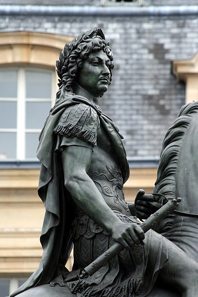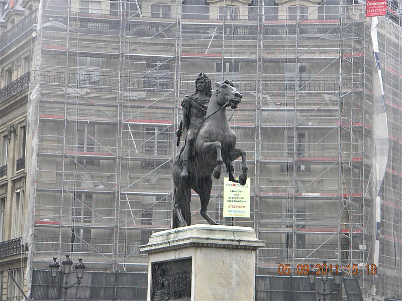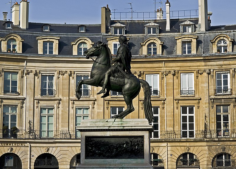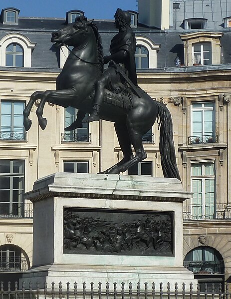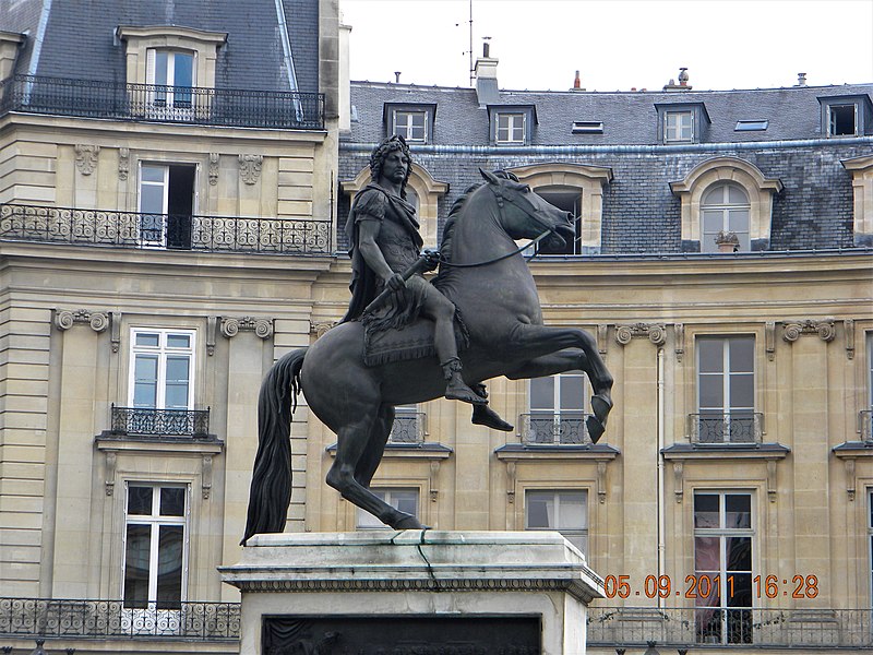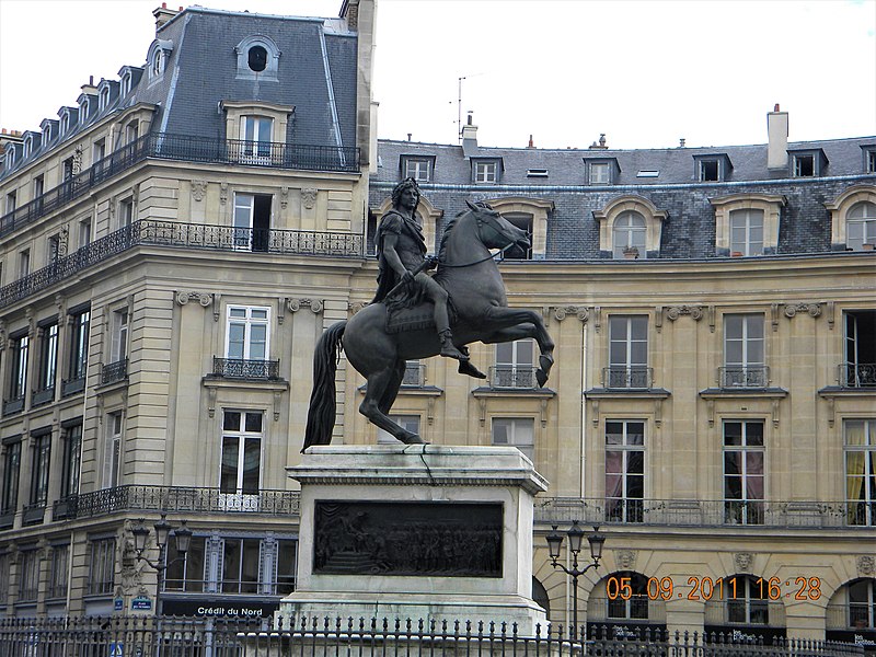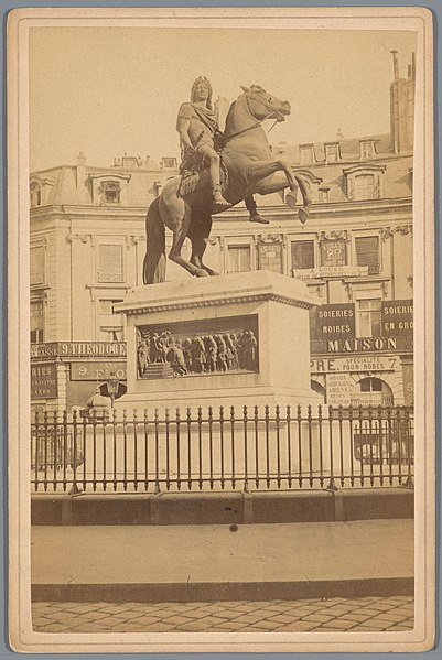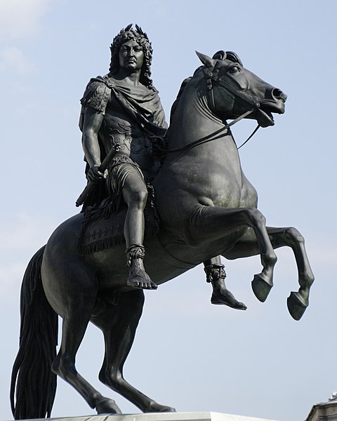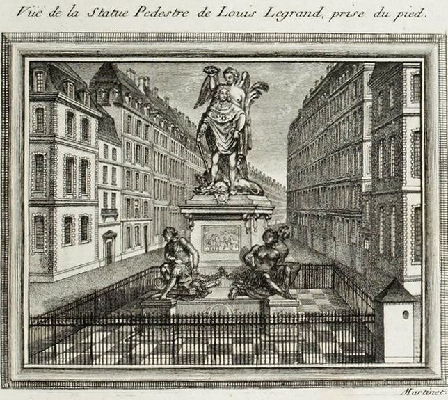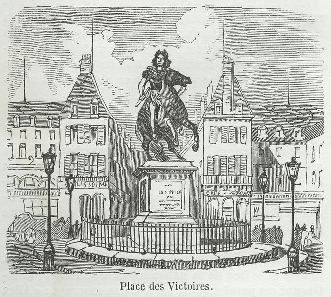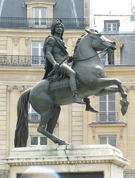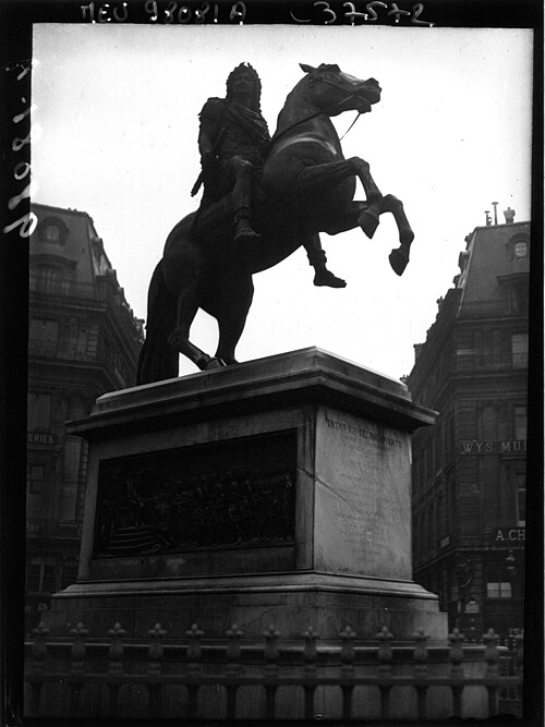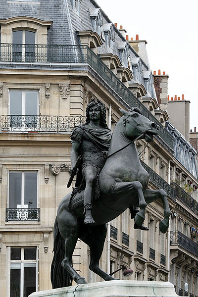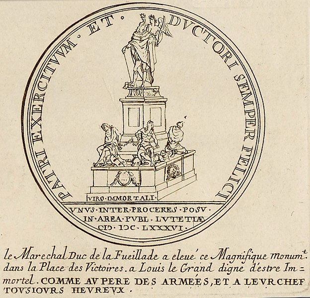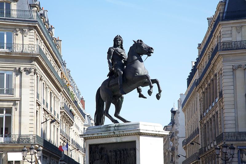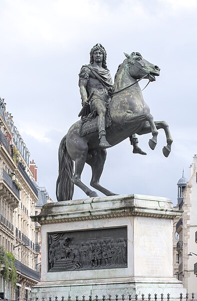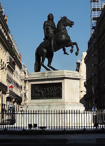 La statue équestre de Louis XIV se dresse au centre de la place des Victoires, à cheval sur les 1er et 2e arrondissements de Paris ; le monument a été classé au titre des monuments historiques en 1992. À l'origine, le duc de La Feuillade commanda au sculpteur Martin Desjardins une statue du roi après la paix de Nimègue ; Desjardins réalisa une œuvre en pied représentant Louis XIV coiffé d'une couronne et piétinant ses ennemis, parfois décrite en costume de sacre ou à l'antique, surmontée d'une Renommée. Le piédestal, conçu par Jean-Antoine Alavoine, était orné de bas-reliefs et flanqué de quatre figures d'esclaves ; l'ensemble atteignait environ 22 mètres de haut et nécessita l'achat puis la démolition de l'hôtel de la Ferté pour son installation. Inauguré place des Victoires, ce monument célébrait les victoires du roi en Europe et en France, mais il fut renversé lors des événements révolutionnaires du 10 août 1792 et envoyé à la fonte pour la fabrication de canons ; les quatre captifs de Desjardins, retirés dès 1790, sont aujourd'hui exposés au musée du Louvre (cour Puget). Après la destruction, la place fut provisoirement occupée par une pyramide en bois portant les noms des citoyens morts le 10 août, et une tradition rapporte que ce bois aurait ensuite été donné par Napoléon Ier à un corps de garde qui l'aurait utilisé pour se chauffer. En 1810 une statue du général Desaix fut érigée au centre de la place, puis fondue sous la Restauration pour refabriquer la statue équestre d'Henri IV du pont Neuf, inaugurée en 1818. La statue actuelle, œuvre de François-Joseph Bosio, a été inaugurée le 15 août 1822 ; le bronze a été fondu par Auguste-Jean-Marie Carbonneaux. Pour l'attitude du cavalier et du cheval, Bosio s'est inspiré du Cavalier de bronze de Falconet représentant Pierre le Grand à Saint-Pétersbourg. La sculpture a été restaurée en 2005. Le groupe représente Louis XIV vêtu à la façon d'un empereur romain, monté sur un cheval cabré, et repose sur le piédestal d'Alavoine orné de bas-reliefs en bronze réalisés par Bosio, notamment Le Passage du Rhin et Institution de l'ordre royal et militaire de Saint-Louis en 1693. Deux autres bas-reliefs — La conquête de la Franche-Comté et La paix de Nimègue — ainsi que les médaillons Les duels abolis et L'hérésie détruite, qui figuraient initialement sur le piédestal, ont été déposés et sont visibles au Louvre à côté des Captifs de Desjardins.