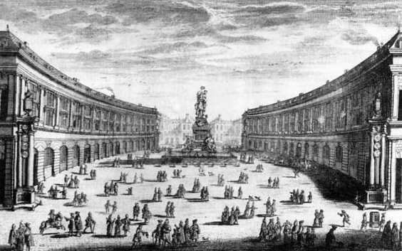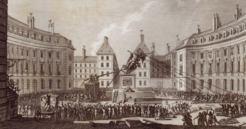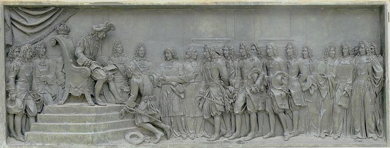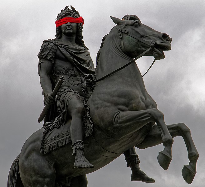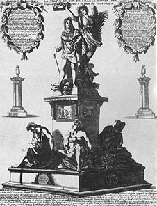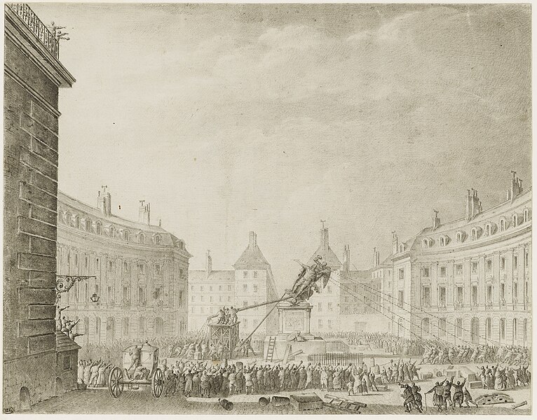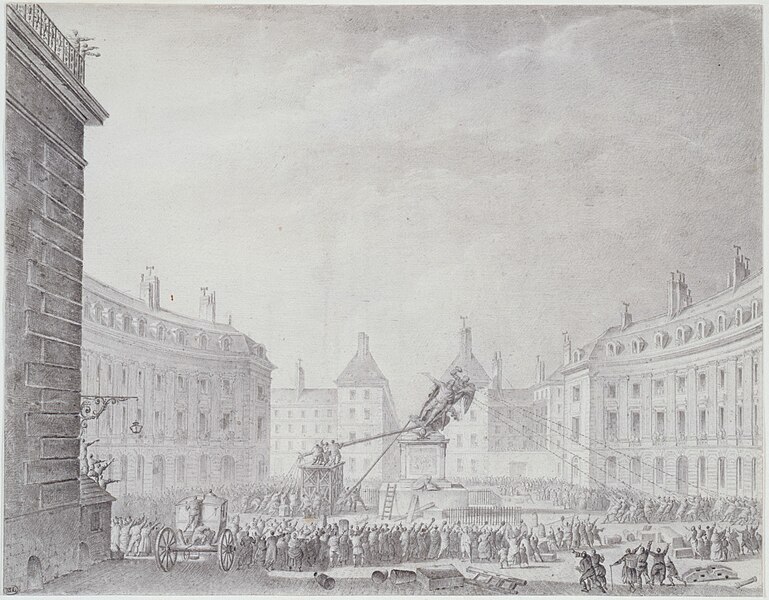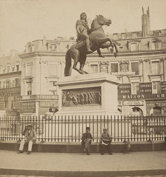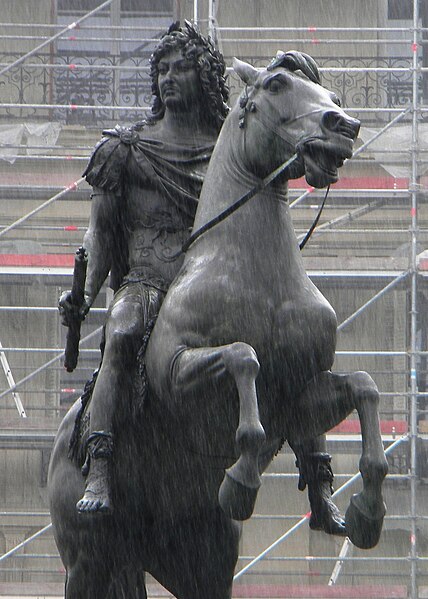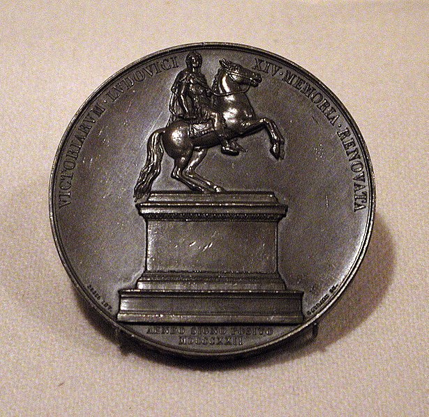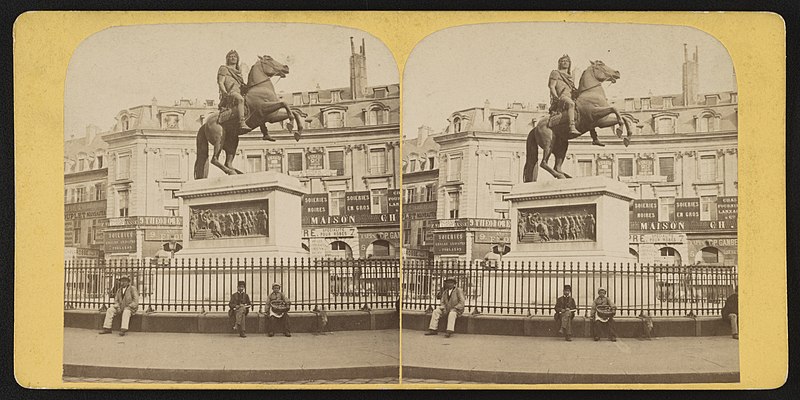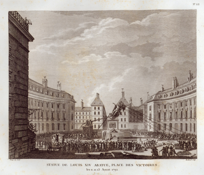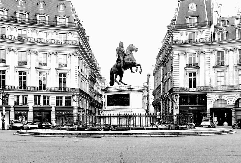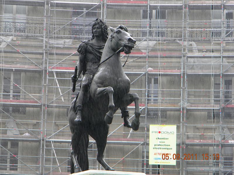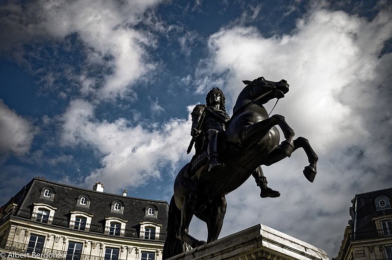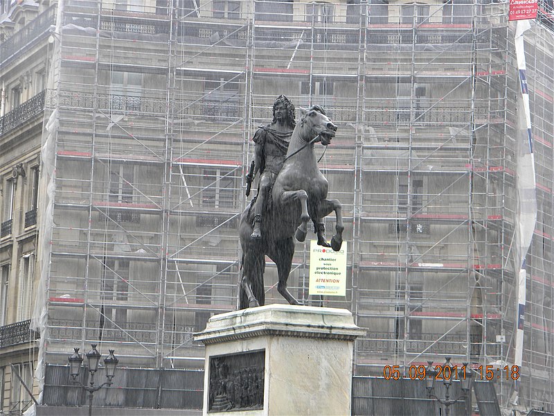La statue équestre de Louis XIV se dresse au centre de la place des Victoires, à cheval sur les 1er et 2e arrondissements de Paris ; le monument a été classé au titre des monuments historiques en 1992. À l'origine, le duc de La Feuillade commanda au sculpteur Martin Desjardins une statue du roi après la paix de Nimègue ; Desjardins réalisa une œuvre en pied représentant Louis XIV coiffé d'une couronne et piétinant ses ennemis, parfois décrite en costume de sacre ou à l'antique, surmontée d'une Renommée. Le piédestal, conçu par Jean-Antoine Alavoine, était orné de bas-reliefs et flanqué de quatre figures d'esclaves ; l'ensemble atteignait environ 22 mètres de haut et nécessita l'achat puis la démolition de l'hôtel de la Ferté pour son installation. Inauguré place des Victoires, ce monument célébrait les victoires du roi en Europe et en France, mais il fut renversé lors des événements révolutionnaires du 10 août 1792 et envoyé à la fonte pour la fabrication de canons ; les quatre captifs de Desjardins, retirés dès 1790, sont aujourd'hui exposés au musée du Louvre (cour Puget). Après la destruction, la place fut provisoirement occupée par une pyramide en bois portant les noms des citoyens morts le 10 août, et une tradition rapporte que ce bois aurait ensuite été donné par Napoléon Ier à un corps de garde qui l'aurait utilisé pour se chauffer. En 1810 une statue du général Desaix fut érigée au centre de la place, puis fondue sous la Restauration pour refabriquer la statue équestre d'Henri IV du pont Neuf, inaugurée en 1818. La statue actuelle, œuvre de François-Joseph Bosio, a été inaugurée le 15 août 1822 ; le bronze a été fondu par Auguste-Jean-Marie Carbonneaux. Pour l'attitude du cavalier et du cheval, Bosio s'est inspiré du Cavalier de bronze de Falconet représentant Pierre le Grand à Saint-Pétersbourg. La sculpture a été restaurée en 2005. Le groupe représente Louis XIV vêtu à la façon d'un empereur romain, monté sur un cheval cabré, et repose sur le piédestal d'Alavoine orné de bas-reliefs en bronze réalisés par Bosio, notamment Le Passage du Rhin et Institution de l'ordre royal et militaire de Saint-Louis en 1693. Deux autres bas-reliefs — La conquête de la Franche-Comté et La paix de Nimègue — ainsi que les médaillons Les duels abolis et L'hérésie détruite, qui figuraient initialement sur le piédestal, ont été déposés et sont visibles au Louvre à côté des Captifs de Desjardins.