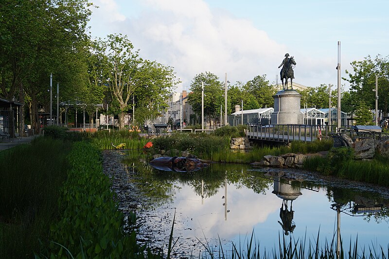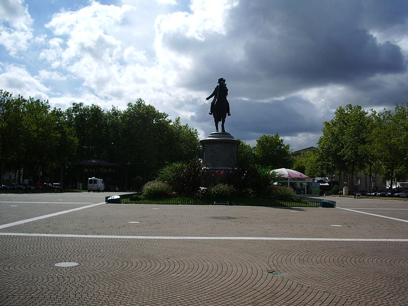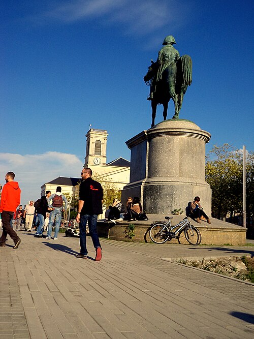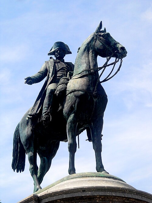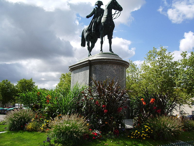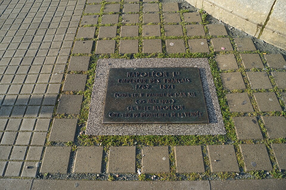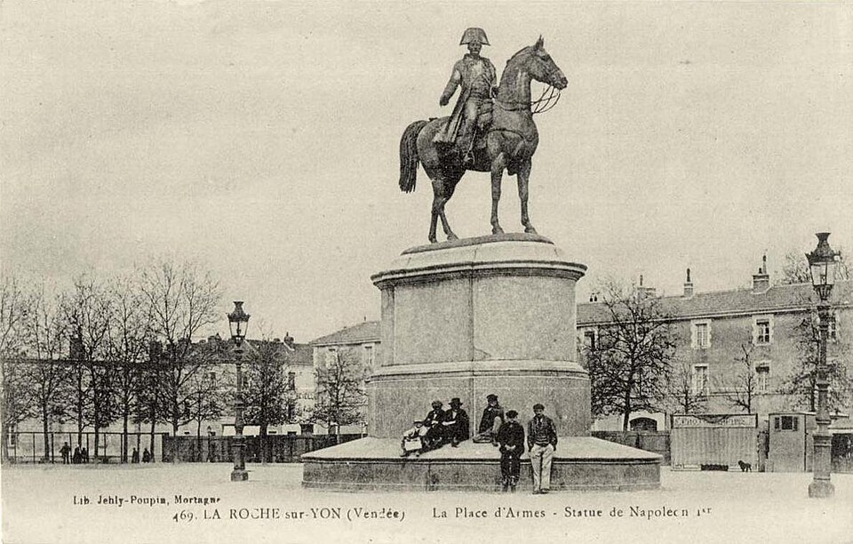 La statue équestre de Napoléon Ier, en bronze, se dresse au centre de la place Napoléon à La Roche-sur-Yon, dans le département de la Vendée. Conçue par le comte Émilien de Nieuwerkerke et réalisée en collaboration avec l’architecte Pierre Manguin, elle a été fondue selon la méthode de la cire perdue et inaugurée en 1854 pour commémorer le cinquantenaire de la fondation de la ville. La commande répondait au souhait du maire Léon Audé formulé en février 1851 ; l’autorisation présidentielle fut donnée par décret le 13 septembre 1852 et la première pierre fut posée le 15 août 1853. Le financement provenait d’une souscription à laquelle contribuèrent cent cinquante-deux communes de la Vendée et l’administration des Beaux-Arts, la somme recueillie s’élevant à 57 721 francs-or. L’inauguration, le 20 août 1854, coïncida avec les célébrations du jubilé de la cité et réunit une foule estimée à vingt mille personnes. La statue elle-même mesure environ 4,66 m de hauteur, 5,40 m de longueur et 1,70 m de largeur ; elle repose sur un piédestal de granit de 4,86 m de haut pour 7,90 m de long et 5,80 m de large, l’ensemble atteignant approximativement neuf mètres. Contrairement à d’autres effigies, Napoléon y est représenté désignant de la main droite l’emplacement où fut décidée la fondation de la ville, geste qui symbolise son rôle d’instaurateur ; le groupe est par ailleurs très proche d’un modèle inauguré à Lyon, à l’exception de cette posture de la main. La création s’inscrit dans le contexte de la fondation impériale de La Roche-sur-Yon : par décret de mai 1804 Napoléon Ier ordonna la création de la cité pour structurer et pacifier la région vendéenne, la ville fut conçue selon un plan orthonormé centré sur la place qui porte aujourd’hui son nom, et la seule visite de l’Empereur, le 8 août 1808, fut marquée par sa déception face à la lenteur des travaux. Parmi les six statues équestres napoléoniennes recensées en France, celle de La Roche-sur-Yon est la seule à être demeurée in situ depuis son érection. La commune a obtenu son classement au titre des monuments historiques par arrêté du 14 octobre 2019, officialisé au cours de juillet de la même année. L’ensemble a fait l’objet d’une campagne de restauration en 2020 ; il a également subi un acte de vandalisme consistant en une application de peinture rouge, nécessitant une intervention spécialisée et conduisant la municipalité à déposer plainte.