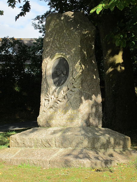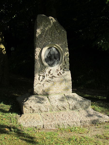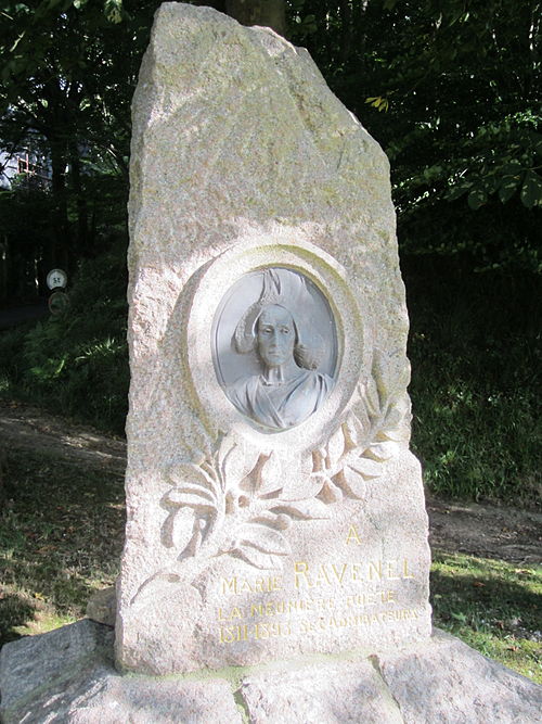 La stèle de Marie Ravenel porte un médaillon représentant la poétesse à quarante ans, inséré dans une pierre dressée en forme de menhir pour évoquer les mégalithes du Val de Saire qui lui étaient chers. L'initiative de poser ce médaillon sur sa tombe a été lancée en 1904 par La Violette Manchoise, société poétique de Cherbourg, et le monument a été réalisé par l'artiste Elisa Bloch en association avec l'architecte Mesnage. Marie Ravenel, meunière et poétesse, avait été distinguée par une médaille d'or au congrès scientifique et littéraire en 1860. Née Marie Ravenel le 21 août 1811 au moulin familial de la Coudrerie à Réthoville, elle épouse Yves Le Corps en janvier 1830 et prend le nom de Mme Le Corps ; elle meurt le 8 mars 1893 à Fermanville. Fille de cultivateurs, elle élève trois enfants tout en poursuivant sa vocation poétique, d'où la publication, à la demande d'amis, d'un premier volume de vers en 1852, apprécié pour la vivacité et l'intimité de son rapport à la nature. Une nouvelle édition de ce recueil paraît en 1860 et, en 1890, elle fait paraître une édition complète de ses œuvres en deux volumes à Cherbourg. Après son mariage, elle quitte Réthoville pour s'établir à Carneville puis, vers 1848, à Fermanville, où elle continue malgré sa notoriété à mener une vie paysanne et à assister aux offices dominicaux en coiffe. Le monument funéraire rappelle à la fois son attachement au pays et la reconnaissance littéraire dont elle a bénéficié.