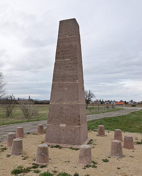 Deux stèles géodésiques du département du Haut-Rhin, situées à Oberhergheim (au nord) et à Sausheim (au sud) entre Mulhouse et Colmar, servent de mires topographiques. Elles ont été élevées en août 1804 par l'équipe de l'astronome Maurice Henry (1763‑1825) dans le cadre de la cartographie de la Suisse sous domination française durant le règne de Napoléon Ier. L'opération visait à mesurer, à quelques kilomètres de la frontière franco‑suisse, la distance séparant les deux stèles, soit 19,045 km. Cette distance, dite base d'Ensisheim en référence à la commune située à peu près au milieu du trait, a ensuite servi à la triangulation et constituait alors la plus longue base mesurée à la surface de la Terre. La stèle de Sausheim devait à l'origine être placée sur la colline de Rixheim en raison des effets de la réfraction atmosphérique, et une troisième stèle avait été envisagée à Jungholtz‑Thierenbach. Selon Charles Grad, dans la revue Le Tour du monde (1886), la stèle méridionale portait à l'origine un écusson à l'effigie de Bonaparte, brisé par les Autrichiens lors de l'invasion de 1813. Les deux monuments ont été classés au titre des monuments historiques par arrêté du 5 décembre 1979 ; la stèle de Sausheim a fait l'objet d'une restauration en 1985. Les stèles prennent la forme d'obélisques ou de pyramides composées de six blocs de grès rose des Vosges superposés ; leur hauteur est de 5 mètres, la stèle de Sausheim étant surmontée de deux blocs supplémentaires qui portent sa hauteur à 7 mètres. Elles sont entourées de douze bornes plus petites disposées en cercle. La mire d'Oberhergheim porte l'inscription suivante : « Terme septentrional d'une base de 19 045 1/4 mètres mesurée sous le règn[e] de Napoléon I empereur des Français pour servir à la carte de l'Helvétie et à la détermination de la grandeur et de la figure de la terre en aoust MDCCCIV. » Ces monuments reprennent la forme de la pyramide et de l'obélisque, dans un contexte d'égyptomanie en France après la campagne d'Égypte. Les coordonnées géographiques (système ETRS89) sont : Oberhergheim 47°57′42,246″N, 7°24′04,441″E et Sausheim 47°47′26,5246″N, 7°23′14,9417″E.