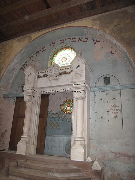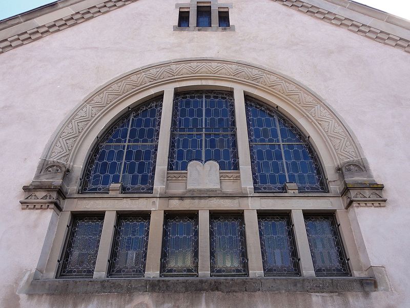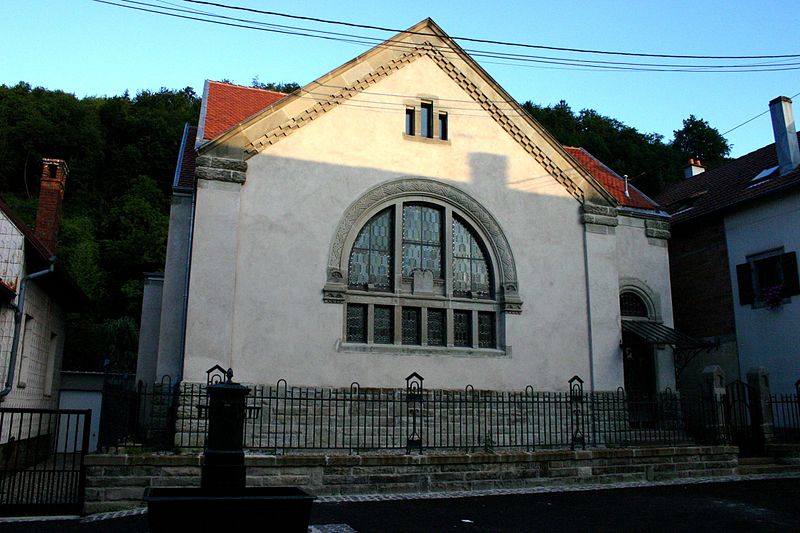 La synagogue de Schirmeck, située rue des Écoles dans le Bas-Rhin, a été conçue par les architectes strasbourgeois David Falk et Emile Wolf et construite entre 1906 et 1909. Bâtiment inscrit à l'inventaire des monuments historiques en 1999, elle se distingue par une architecture peu commune dans le corpus des synagogues alsaciennes : un plan presque central, un vaisseau unique et de grandes baies cintrées de type thermal qui éclairent la salle. Édifiée en moellons de grès enduit avec modénatures en pierre et couverte d'une toiture en tuiles plates, la parcelle est close côté rue par une clôture en pierre de taille et fer forgé. La façade porte deux Tables de la Loi et des inscriptions hébraïques indiquant la fonction religieuse de l’édifice ; l'Arche sainte (Aron haKodesh) est implantée hors-œuvre contre le pignon nord, surmontée d'une baie cintrée. L'intérieur a conservé son dispositif cultuel d'origine, notamment un aron néo-byzantin, un mobilier ancien et la disposition de la salle où l'officiant priait à l'est devant la Torah. Un harmonium témoignait d'une pratique liturgique proche du judaïsme libéral et la tribune des femmes, exceptionnellement située au rez-de-chaussée, est accompagnée d'une séparation latérale d'environ 1,5 m côté hommes, solution visant à rapprocher les fidèles tout en assurant une séparation pendant le culte. La synagogue a été profanée pendant la Seconde Guerre mondiale puis restaurée et rouverte au culte en 1946 sous la conduite de Fernand Bloch ; le bâtiment a toutefois de nouveau souffert de dégradations avant des interventions provisoires dans les années 1980. Des travaux de restauration des toitures, façades et vitraux ont été menés en 2007, 2011 et 2014 avec le soutien de l'opération "Engagés pour le patrimoine". La communauté juive locale, présente depuis le milieu du XIXe siècle et initialement liée aux rabbinats d'Épinal puis de Mutzig, s'est progressivement réduite : la synagogue est désaffectée depuis 1978, le mobilier d'origine ayant néanmoins été préservé.