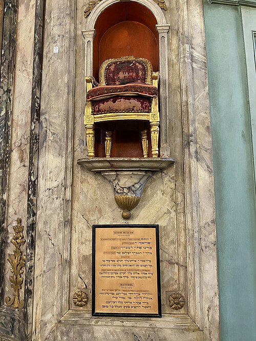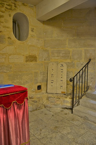 La synagogue de Carpentras, située en Vaucluse, est la plus ancienne synagogue française en activité ; son édification par les Juifs comtadins commence en 1367 après une autorisation donnée en 1361. Les éléments médiévaux subsistent surtout en partie basse et sont souvent intégrés à des espaces plus vastes remaniés à l'époque moderne ; la salle de prière des femmes se trouvait à l'origine dans les salles basses, à l'emplacement de l'actuelle salle de réunion communautaire. Le premier étage, destiné aux hommes, est aménagé lors d'une reconstruction conduite au XVIIIe siècle, dont la première tranche est menée dans les années 1740 ; Antoine d'Allemand, architecte local, est traditionnellement associé à ces travaux, tandis que le projet initial a peut‑être été conçu par l'architecte Teissier. L'édifice n'est achevé qu'à la veille de la Révolution ; il dut notamment être rabaissé à la demande de l'évêque Joseph‑Dominique d'Inguimbert afin de respecter une apparence jugée modeste. Au milieu du XIXe siècle, d'importantes transformations introduisent des tribunes pour les femmes et des annexes ornées d'un décor néoclassique ; la façade et le vestibule sont remaniés à la fin du XIXe siècle et la façade actuelle est datée de 1909.