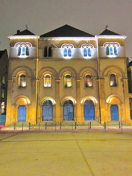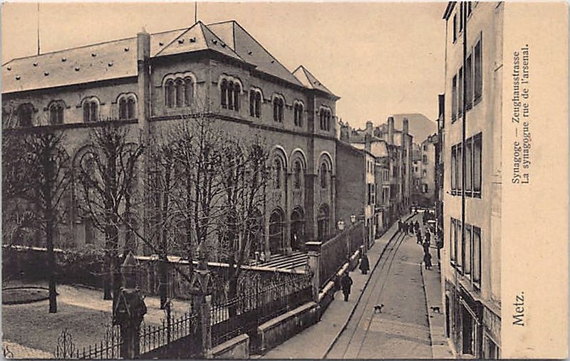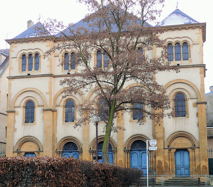 Dès 1839 le Consistoire envisagea la construction d’un nouvel édifice ; la population juive de Metz était alors estimée à 2 400 âmes en 1842. Selon l’Annuaire de la Moselle (1850-51), le temple mesure 40 mètres de longueur sur 20 mètres de largeur, s’élève du sol de six marches et comprend une nef flanquée de bas-côtés précédée d’un porche avec trois doubles portes réservées aux hommes. Au-dessus des bas-côtés s’élèvent deux rangs de galeries et trois galeries se trouvent au-dessus du porche pour les femmes, desservies par deux entrées particulières. La façade principale présente cinq grandes arcades avec pilastres ; les trois arcades centrales servent d’entrées pour les hommes, les deux arcades en avant-corps donnent accès aux entrées féminines, et des fenêtres ornées de colonnettes occupent l’élévation. La tribune des chantres est placée au milieu de la nef, élevée de deux marches et entourée d’une grille en fonte ouvragée, contrairement à d’autres synagogues où elle se trouve à l’avant. L’arche sainte, engagée dans le mur du fond et élevée de trois marches, est encadrée par quatre colonnes soutenant un cintre orné et une voûte sculptée, surmontée d’un fronton ; ses portes sont garnies d’un parokhet de velours rouge brodé d’or et décorées intérieurement et extérieurement de peintures rehaussées d’or. Une chaire à prêcher finement sculptée est appuyée contre l’un des piliers de la nef et l’intérieur était autrefois éclairé par 400 becs de gaz sur des candélabres et des lustres en cuivre de style byzantin. La synagogue fut dotée d’un orgue en 1897, rénové par Frédéric Haerpfer en 1934 puis par Haerpfer-Erman en 1965. Les archives départementales ainsi que les archives et la bibliothèque municipales conservent des documents importants relatifs aux Juifs de Metz et de la région, notamment le Memorbuch, le dossier du procès de Raphaël Lévy et des documents liés au Grand Sanhédrin de 1807.