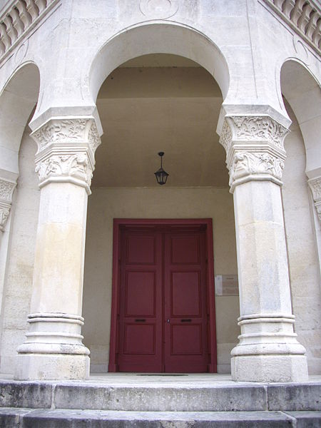 Le bâtiment de plan rectangulaire est précédé de deux parvis ; l'entrée principale à l'ouest s'ouvre par un porche rythmé par quatre colonnes supportant des arcs outrepassés.
