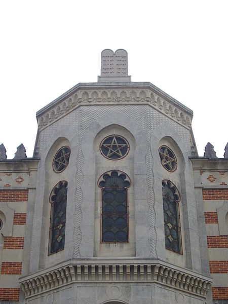 Le décor, composé de motifs géométriques et végétaux, intègre des caractères hébraïques ; des étoiles de David figurent dans les rosaces et les Tables de la Loi couronnent l'édifice.