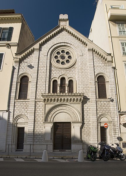La synagogue de Nice, dite grande synagogue, est un lieu de culte juif situé au n°7 de la rue Gustave-Deloye, en plein centre-ville. La communauté juive est présente à Nice depuis le XIIIe siècle et ne se structure qu'à partir du XVIIIe ; en 1773 une synagogue est aménagée rue Benoît-Bunico dans la giudaria. L'ancienne synagogue, devenue trop petite, est vendue pour financer un nouvel édifice pris en charge par un particulier. En 1885, le théâtre de l'Opéra-Comique qui occupait le terrain est démoli et remplacé par un immeuble et un temple avec ses dépendances. Les relevés sont signés par l'ingénieur Paul Martin, et l'architecte Brun assure la décoration intérieure ; Paul Martin est par ailleurs connu pour avoir construit le palais de l'Agriculture. La façade en pierre adopte une composition romano-byzantine : elle présente une partie sommitale en forme de pyramide percée d'une rosace et est coiffée des Tables de la Loi. À l'intérieur, l'espace central est divisé en hauteur par une galerie soutenue par des piliers cylindriques et le sanctuaire est richement décoré. Une série de douze vitraux intitulée Le Chant des prophètes, réalisée par Théo Tobiasse dans l'atelier du maître verrier Alain Peinado à Nice, est inaugurée en 1993. La nouvelle synagogue est inaugurée le 21 mars 1886 par le grand-rabbin de France Lazare Isidor, assisté par le rabbin de Nice Honel Meiss. En 1943, pendant la Seconde Guerre mondiale, l'édifice est utilisé comme lieu d'internement avant la déportation de nombreux Juifs. Une importante rénovation fait l'objet d'une inauguration en 1988. La synagogue est inscrite au titre des monuments historiques le 17 avril 2007.