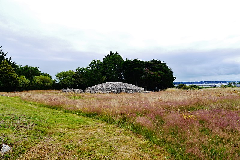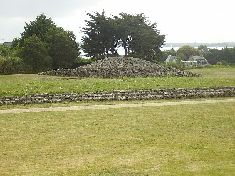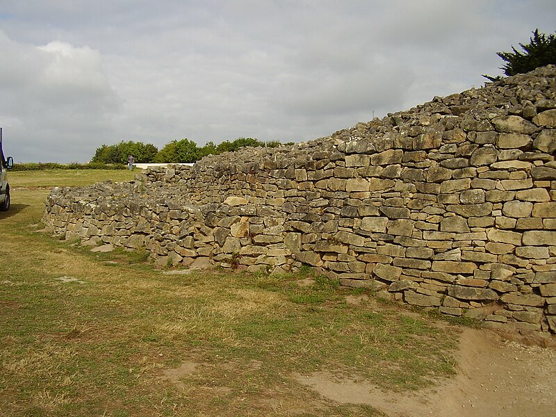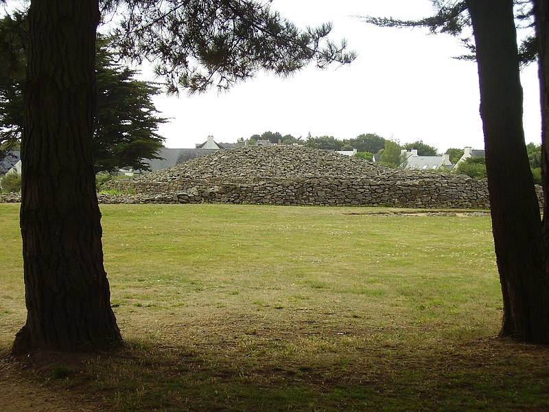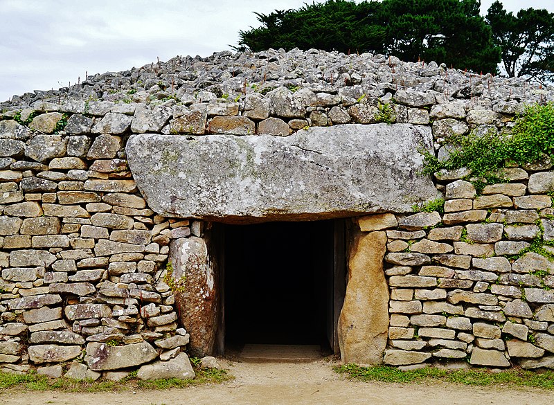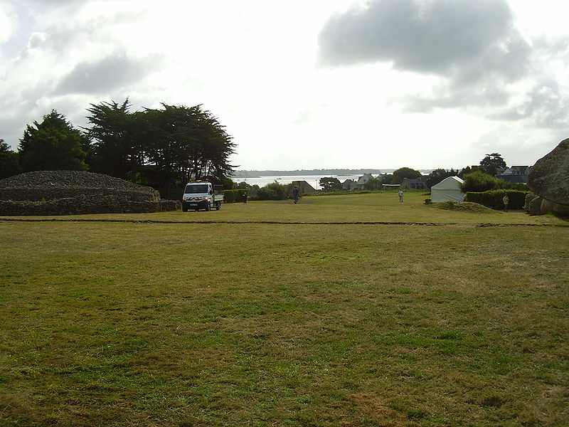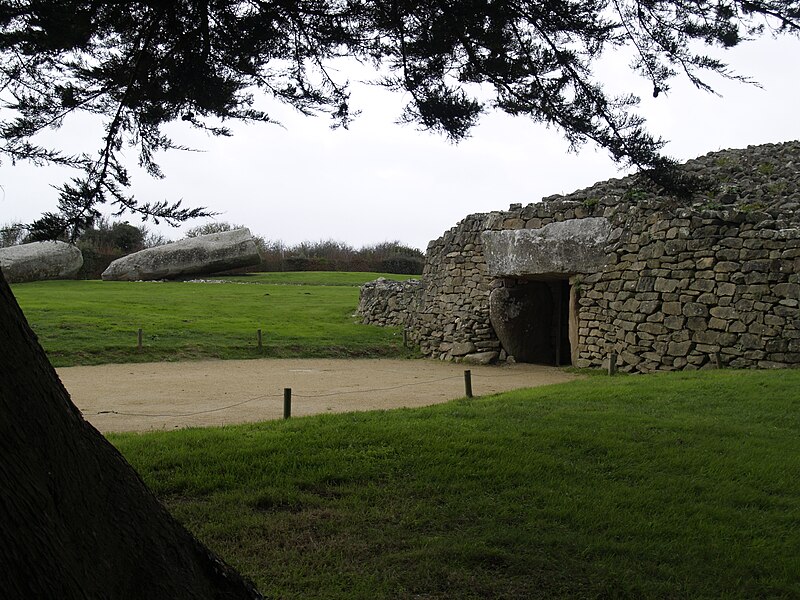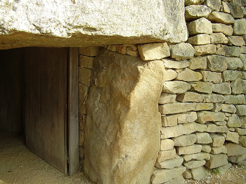 La dalle de couverture représente une grande hache emmanchée, une crosse allongée et le train avant d'un animal ; la stèle d'origine est brisée et des fragments correspondant à la partie manquante ont été réemployés dans d'autres monuments, notamment le cairn de Gavrinis, et un fragment ultérieur pourrait avoir été réutilisé dans le tumulus d'Er Grah ou ailleurs. Les orthostates n°2 et n°3 présentent des tracés très effacés découverts plus tardivement, avec une figure quadrangulaire, des signes serpentiformes et ramiformes et un groupe de cupules, tandis que les n°16 et 17 ne portent que des cupules, ce qui suggère une construction symétrique par paire dont la signification reste inconnue.