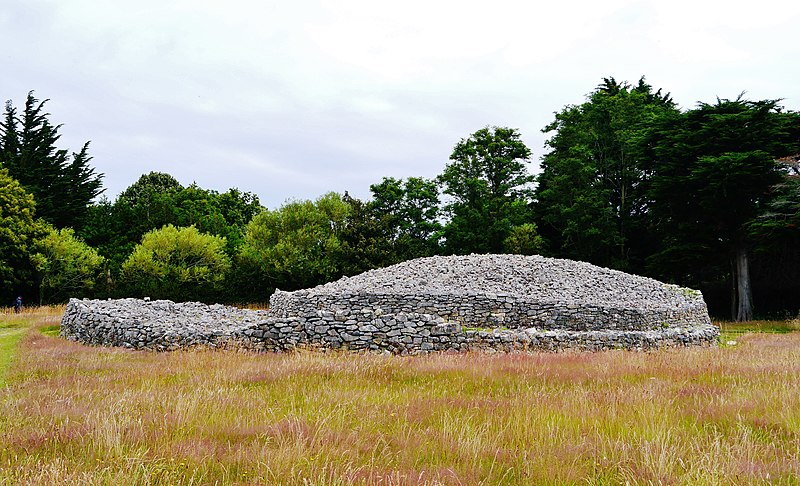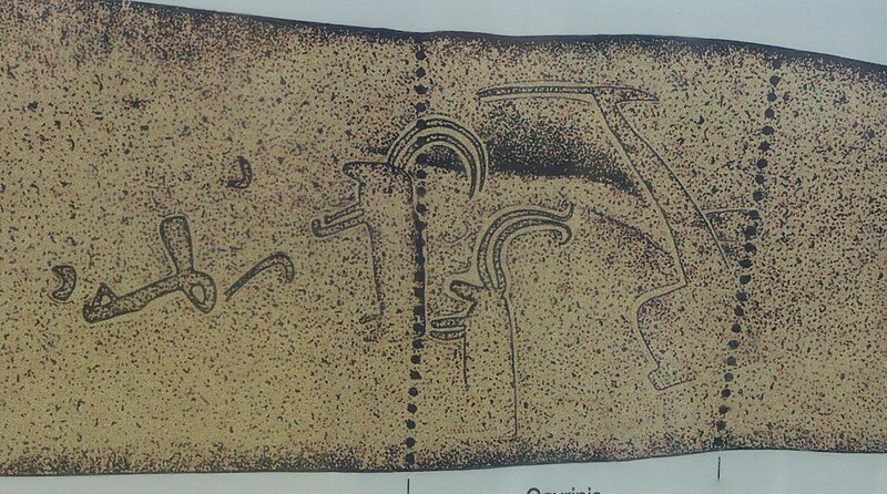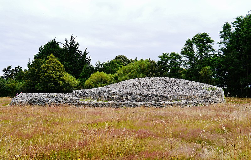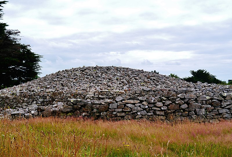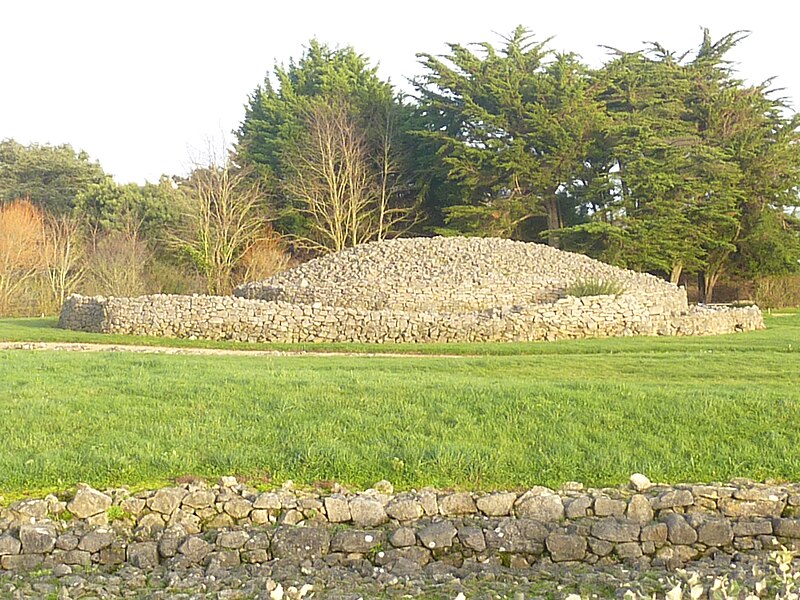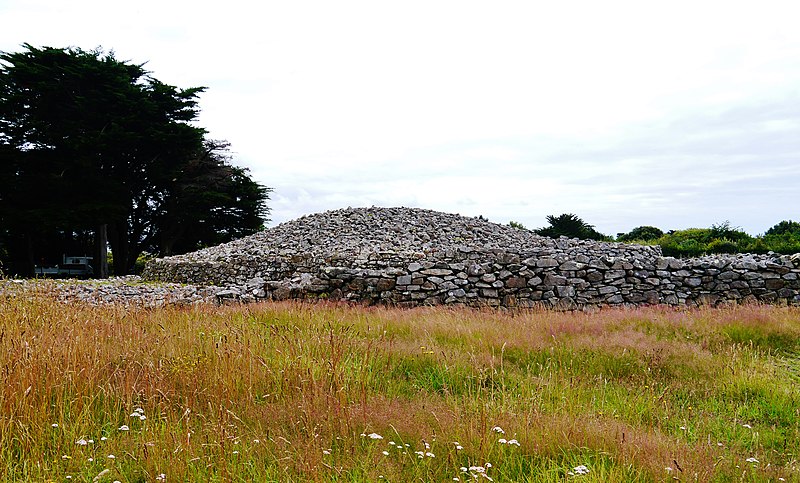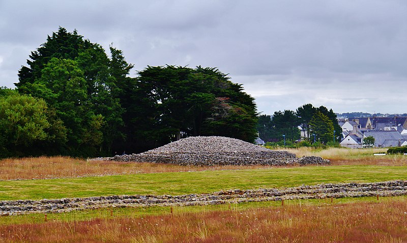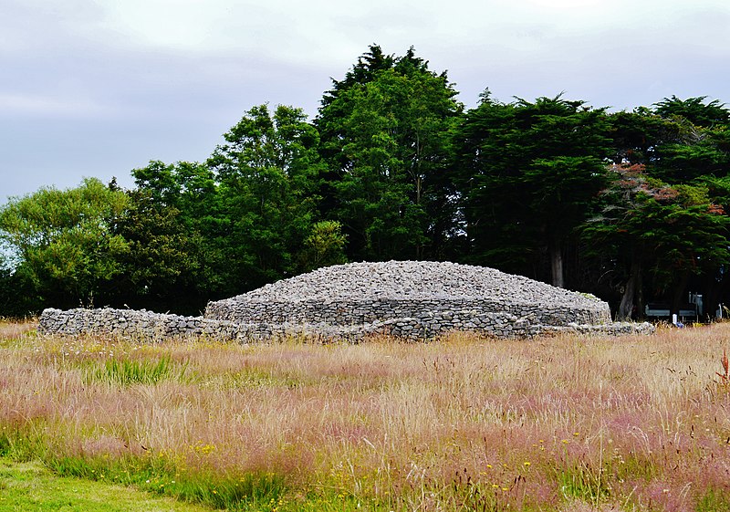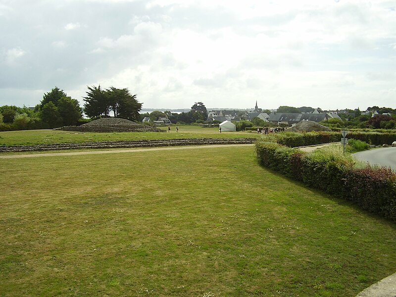 La dalle de couverture représente une grande hache emmanchée, une crosse allongée et le train avant d'un animal ; la stèle d'origine est brisée et des fragments correspondant à la partie manquante ont été réemployés dans d'autres monuments, notamment le cairn de Gavrinis, et un fragment ultérieur pourrait avoir été réutilisé dans le tumulus d'Er Grah ou ailleurs. Les orthostates n°2 et n°3 présentent des tracés très effacés découverts plus tardivement, avec une figure quadrangulaire, des signes serpentiformes et ramiformes et un groupe de cupules, tandis que les n°16 et 17 ne portent que des cupules, ce qui suggère une construction symétrique par paire dont la signification reste inconnue.