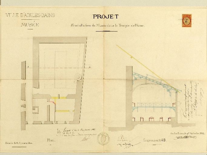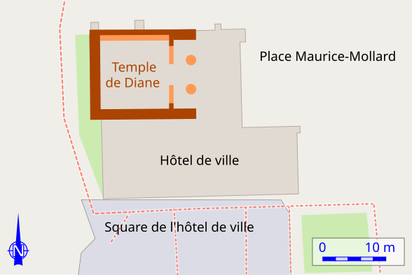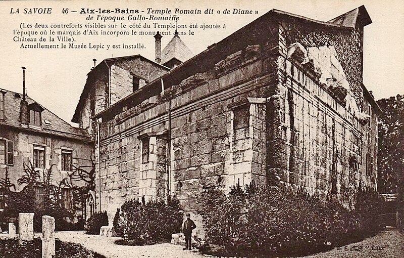 Le temple romain dit de Diane se situe à Aix-les-Bains (Savoie), l’antique Aquae relevant de la cité de Vienne en territoire allobroge. Les fouilles de 1988-1989 ont mis en évidence des séquences stratigraphiques qui situent la construction de l’édifice dans la première moitié du IIe siècle de notre ère. Sur le côté nord, des structures de fondation pourraient correspondre aux vestiges d’un temenos délimitant un espace sacré autour du monument. Avant la construction du temple, une structure maçonnée polygonale en petits moellons était implantée sur le site ; trois segments de mur de 2,60 m et le départ d’un quatrième permettent de restituer un diamètre de 24 m, sans qu’il soit possible d’affirmer s’il s’agissait d’un polygone complet. Le temple est ensuite édifié légèrement décalé vers l’ouest, sur une terrasse en relation avec un agrandissement des thermes voisins. À 22 m en avant et dans l’axe du monument, un seuil monumental large de 2,75 m, taillé en blocs calcaires moulurés réemployés, marque l’accès et comporte des feuillures pour un portail à deux vantaux. Un mur de clôture, partiellement détruit par le creusement du fossé du château des marquis d’Aix, semble avoir entouré le temple, et cet enclos a favorisé la réutilisation et la conservation partielle du monument. À la fin de l’Antiquité, au Ve siècle, l’édifice paraît avoir été agrandi vers l’est par le prolongement de ses deux antes, portant sa longueur à plus de 46 m et laissant supposer une nouvelle affectation, possiblement religieuse ; une donation de 867 mentionne d’ailleurs un édifice religieux implanté en ce lieu. Les fouilles ont mis au jour une quinzaine de sépultures antérieures au Xe siècle, situées à proximité ou à l’intérieur de la construction. Par la suite, le temple fut intégré au château seigneurial, utilisé comme cellier et sans doute comme carrière de pierre, puis transformé en salle de spectacle lors de l’aménagement du château en casino en 1824 ; la paroi nord fut alors doublée pour supporter des gradins. Trop modeste, ce théâtre fut abandonné après l’ouverture du Casino Grand-Cercle. La ville racheta le bâtiment à la famille de Seyssel en 1868 et y installa le musée Lepic en 1874 ; à cette occasion la toiture fut reprise, une verrière zénithale ouverte et une mezzanine métallique créée dans la cella, ce qui nécessita l’ajout de contreforts contre le mur nord. Le musée Lepic disparut en 1939 ; après la Seconde Guerre mondiale le temple abrita le musée archéologique, ouvert en 1948, et il est classé au titre des monuments historiques depuis 1875. Le monument, situé dans la partie occidentale de la place Maurice-Mollard, est accolé à l’hôtel de ville dont le mur méridional est visible depuis l’intérieur. Les premières occupations romaines d’Aix-les-Bains, liées à l’aménagement de sources thermales, remontent à la seconde moitié du Ier siècle ; le site, implanté sur le flanc ouest du mont Revard, bénéficie d’un microclimat et d’une proximité avec le lac du Bourget. À la lumière des travaux récents, Aquae apparaît davantage comme un vicus rural accompagné d’un complexe thermal fréquenté par l’aristocratie locale que comme une agglomération urbaine dotée d’un centre monumental. Les familles qui finançaient et exploitaient les thermes faisaient construire à proximité des monuments funéraires ; le temple dit de Diane et l’arc de Campanus pourraient ainsi appartenir à un même ensemble funéraire. Le temple conserve trois murs extérieurs intégralement et ses dimensions sont de 17,20 m de longueur, 13,65 m de largeur et 13,12 m de hauteur depuis le sol antique, sans compter les tympans des frontons haut de 2,30 m. Il repose sur un podium de 3,29 m et son entrée se situe à l’est en liaison avec les thermes ; un mur transversal de 0,80 m sépare la cella (10,50 × 10,30 m) du pronaos (4,30 × 10,30 m). L’élévation est construite en grand appareil assemblé à joints vifs sans mortier, sur un massif de fondation de 1,56 m en petits moellons ; le podium comporte cinq assises et les murs treize assises. La pierre employée, dite « pierre de Seyssel », proviendrait des carrières de Franclens et de Surjoux. Le décor, sobre et en partie dégradé, se compose d’un entablement visible comportant une architrave à trois bandeaux, une mouluration, une frise non décorée et une corniche moulurée ; le choix de l’ordre (ionique, corinthien ou toscan) fait débat parmi les spécialistes. Un chapiteau toscan et deux tambours de colonne retrouvés à proximité pourraient appartenir à la colonnade de façade, mais cette attribution est contestée sur des critères stylistiques. À l’examen des vestiges, les murs ouest et nord sont conservés jusqu’au niveau de la corniche, le fronton occidental et son grand appareil étant encore visibles, tandis que la façade orientale, la toiture et les aménagements intérieurs ont disparu et ne peuvent être restitués. La fonction exacte du bâtiment reste discutée : l’attribution à la déesse Diane repose sur une tradition médiévale sans fondement certain, et les hypothèses vont du nymphée ou casino thermal au temple consacré à Borvo ou à la déesse de la santé, voire à une construction du culte impérial. La découverte d’une statue acéphale en marbre représentant une femme en péplos a alimenté des lectures diverses — Hygie, statue impériale honorifique ou Perséphone — et laisse ouverte la possibilité d’une fonction cultuelle ou funéraire. Sur la base d’un examen global du site, certains chercheurs, notamment Philippe Leveau, proposent d’interpréter le monument comme un mausolée-temple intégré à un complexe funéraire lié aux familles locales aisées, ce qui expliquerait son plan et son implantation marginale par rapport à un éventuel centre urbain.