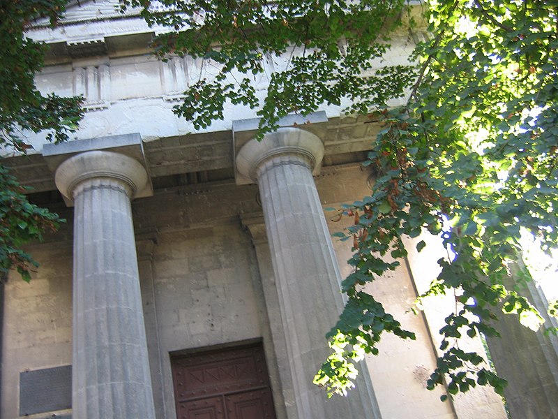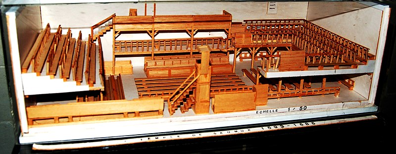 Le temple protestant de Saumur, situé rue des Païens dans le département de Maine-et-Loire, abrite une paroisse membre de l'Église protestante unie de France. Le premier édifice a été construit en 1590 grâce aux fonds du théologien Philippe Duplessis-Mornay et de son épouse Charlotte d'Arbeleste, puis inauguré en mars 1593 par le roi Henri IV, né protestant. L'établissement de la cité comme place de sûreté protestante en 1589 et la fondation de l'Académie de Saumur en 1599 ont attiré de nombreux huguenots. À la révocation de l'édit de Nantes en 1685, le temple fut détruit "jusques aux fondations". Il a été reconstruit en 1843 d'après les plans de l'architecte Charles Joly-Leterme. L'édifice a été endommagé lors des combats de Saumur pendant la Seconde Guerre mondiale et inscrit au titre des monuments historiques par arrêté du 18 avril 1991. La façade, inspirée des temples antiques de Paestum, présente quatre colonnes d'ordre dorique soutenant un fronton triangulaire surmonté d'une croix. Sur ce fronton apparaît un triangle symbolisant le Dieu trinitaire, dans lequel est gravée en lettres capitales l'inscription « A la gloire de Dieu, Père, Fils et St Esprit ». Parmi les ressources et liens associés figurent le site officiel, les bases Mérimée et Structurae, Clochers de France et divers portails consacrés au protestantisme, à l'Anjou et aux monuments historiques ainsi qu'à l'architecture chrétienne.