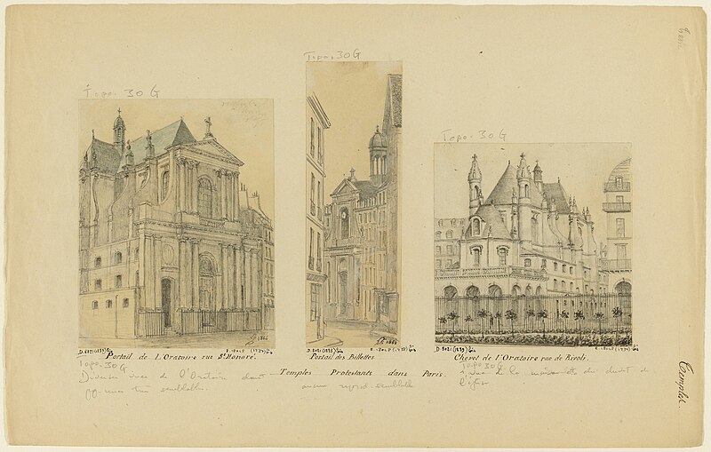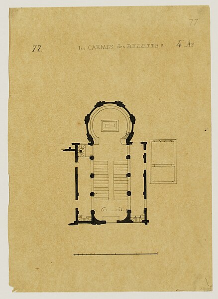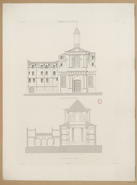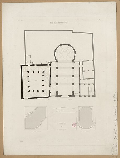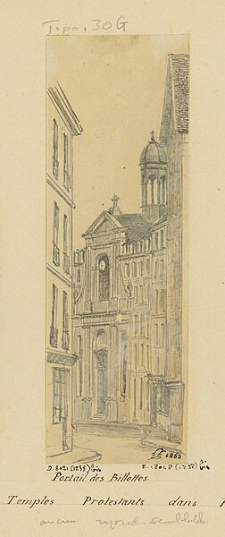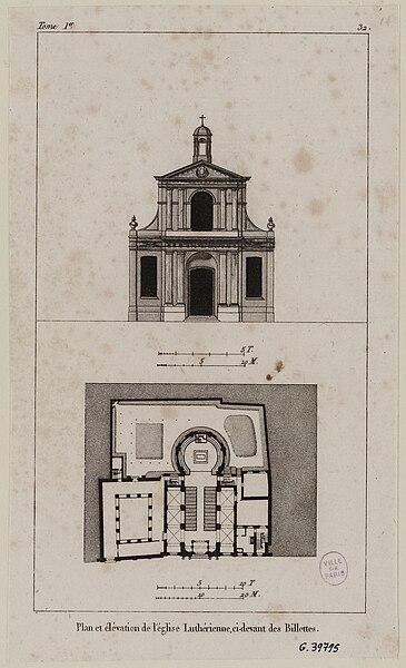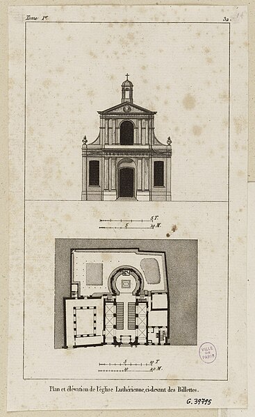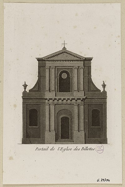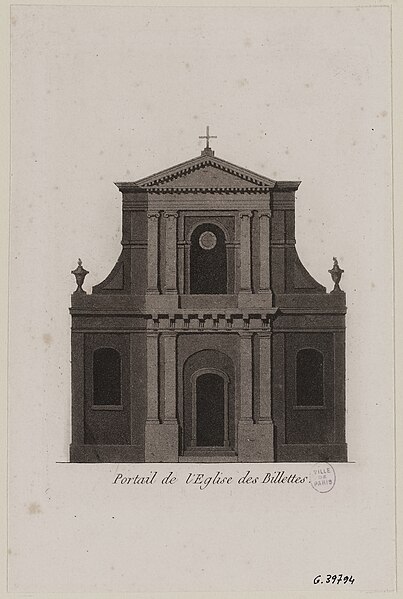 Le Temple des Billettes, ancien couvent des Carmes-Billettes, est situé 24, rue des Archives dans le 4e arrondissement de Paris et abrite aujourd'hui une paroisse protestante luthérienne rattachée à l'Église protestante unie de France. L'origine du lieu remonte à la chapelle fondée en 1294 pour commémorer la légende du miracle de la Sainte Hostie, selon laquelle une hostie profanée par un juif nommé Jonathas aurait saigné puis, jetée dans de l'eau bouillante, se serait mise à voler. La propriété issue du procès de Jonathas fut donnée à Reinier Flaming, qui fit bâtir en 1294 la « maison des Miracles », fondation confirmée par une bulle en 1295. En 1299, les frères hospitaliers de la Charité-Notre-Dame, appelés aussi religieux des Billettes, assurèrent le service religieux et le site devint un important lieu de pèlerinage. L'église fut reconstruite en 1405, et un cimetière et un cloître furent ajoutés en 1427 ; ce dernier est le seul cloître médiéval subsistant à Paris. Les bâtiments au‑dessus des galeries datent des XVIIe et XIXe siècles. En 1633, les Carmes de l'Observance prirent en charge l'église, d'où le nom Carmes‑Billettes. Différents projets de reconstruction furent envisagés aux XVIIe et XVIIIe siècles mais se heurtèrent à l'opposition des marguilliers de la paroisse voisine de Saint‑Jean‑en‑Grève, entraînant plusieurs transactions et contestations. À partir de 1742 les Carmes relancèrent le projet et firent appel à Jacques Hardouin‑Mansart de Sagonne, qui dressa des plans et procéda à des expertises entre 1744 et 1748. Les discussions sur l'ampleur de la nef et les négociations juridiques se poursuivirent jusqu'à la reprise du projet en 1752 et à son approbation en janvier 1753. La reconstruction, réalisée de 1754 à 1758, reprend manifestement des solutions proposées par Mansart de Sagonne, notamment le plan rectangulaire prolongé d'une rotonde, l'emploi de pots‑à‑feu et l'ornement de palmes sur la façade. L'attribution de l'église au frère Claude, avancée pour la première fois en 1787, n'est étayée par aucun document antérieur, tandis que l'influence de Mansart de Sagonne s'impose par les éléments architecturaux. L'ensemble paroissial possédait également des terrains et des vignes à Bagneux. À la Révolution, l'église et le couvent furent désaffectés puis partiellement vendus les 17 avril 1793 et 19 mars 1795. La Déclaration des droits de 1789 et les évolutions juridiques du début du XIXe siècle permirent aux protestants de s'organiser ; en 1802 les articles organiques encadrèrent les cultes et en 1808 un Consistoire luthérien de la Seine fut institué avec deux pasteurs, Georges Boissard et Jean‑Jacques Goepp. Par décret impérial du 28 juillet 1808 la Ville de Paris fut autorisée à acquérir les bâtiments pour le Consistoire ; elle les acheta le 26 novembre 1808 pour 73 000 francs. Tout au long du XIXe siècle, le culte y fut célébré alternativement en français et en allemand ; l'aménagement intérieur date pour l'essentiel de l'Empire et du règne de Louis‑Philippe. Le premier orgue provenait de la chapelle de l'ambassade de Suède, une seconde galerie fut ajoutée et, en 1820, la duchesse Dorothée von Medem finança la cloche de l'église. L'église fut fréquentée par des personnalités comme la princesse Hélène de Mecklembourg‑Schwerin et la communauté luthérienne de Paris y tint une place importante au XIXe siècle. Dans les années 1980, le sculpteur Philippe Kaeppelin réalisa l'autel et le lutrin, et un nouvel orgue construit par le facteur alsacien Mühleisen fut inauguré le 2 octobre 1983. En 2008 furent installées les stèles de Jean Rodolphe Loth sur le thème des Sept paroles du Christ en croix. L'église accueille régulièrement des concerts et le cloître sert de lieu d'exposition pour de jeunes artistes ; le site reçoit également des manifestations comme le Festival du Marais.