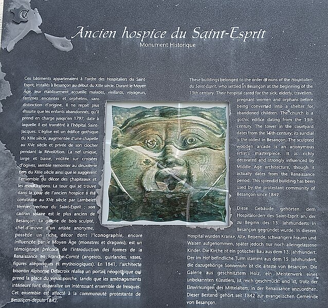 La façade du XVIe siècle sise sur le côté ouest de la petite cour attenant à l'ancienne église du Saint-Esprit : classement par arrêté du 22 avril 1932 - La façade et la toiture de la maison sise 31 quai Vauban, ainsi que la chaussée et le quai : inscription par arrêté du 16 septembre 1933 - Le mur entre rue et cour avec grand portail ; les façades sur rue et sur cour, ainsi que les combles qui les surmontent de l'immeuble sis rue Claude Goudimel : inscription par arrêté du 25 octobre 1937 - La tour en totalité, sise 5 rue Goudimel et 29, quai Vauban, y compris la porte déposée et la fermeture en bois de la tour d'escalier (cad. AD 135) : classement par arrêté du 19 août 2005 ; Les parties suivantes de l’enceinte urbaine : les vestiges enfouis de la contrescarpe de la tour bastionnée de Rivotte situés sur la parcelle 58 (section DK), les vestiges du rempart, même ceux enfouis, entre la tour bastionnée de la Rivotte et la tour bastionnée de Brégille, situés sur la parcelle n°11 (section AK), la partie du rempart entre le bastion du moulin Saint-Paul et les vestiges de la tour bastionnée Saint-Pierre, située 22 avenur Arthur-Gaulard, sur les parcelles n°16 et 67 (section AH), les vestiges de la tour bastionnée Saint-Pierre située rue Elisée Cusenier, sur la parcelle n°29 (section AE), les vestiges enfouis de la lunette de Bregille, situé sur la parcelle n°109 (section CX), le corps de garde est de Chamars du XVIIIe siècle, situé 2 avenue de la Gare d’Eau, sur la parcelle n°36 (section AR), l’ensemble des vestiges enfouis de la seconde ligne de remparts situés sous l’hôpital Saint-Jacques, sur la parcelle n°5 (section AV), 2 avenue de la Gare d’eau, parking du Département Doubs, 4 et 6 avenue de la Gare d’eau, sur les parcelles n°35, 44, 48 et 73 (section AR), le corps de garde nors de la porte d’Arènes, situé sur la parcelle n°164 (section AX), tels que délimités en rouge sur le plan annexé à l’arrêté : inscription par arrêté du 10 septembre 2019 ; En totalité, le temple du Saint-Esprit, ancienne église de l’hôpital du Saint-Esprit, y compris sa chapelle nord ainsi que le corps de logis, situé entre le porche actuel de l’église et la galerie en bois, situé 5, rue Claude-Goudimel, sur les parcelles n° 107 et 121, figurant au cadastre section AD, tel que délimité par un liseré rouge sur le plan annexé à l’arrêté : inscription par arrêté du 5 août 2020