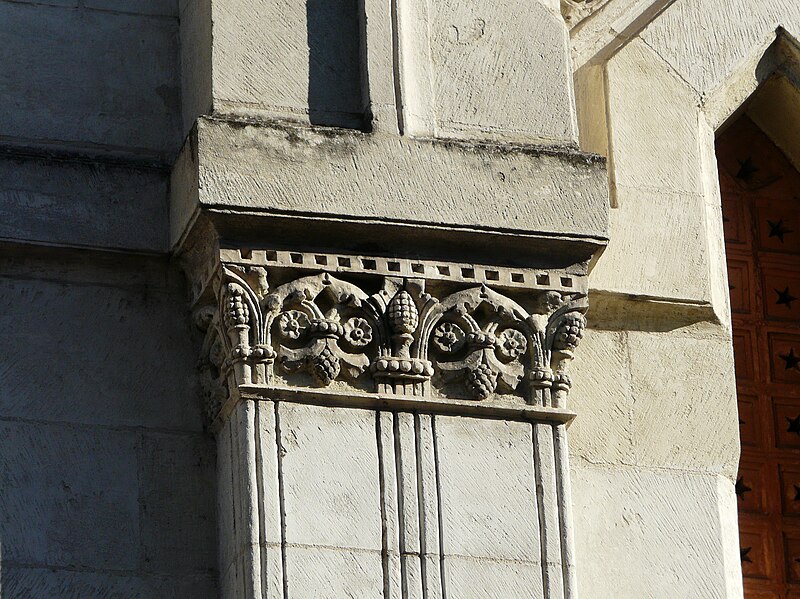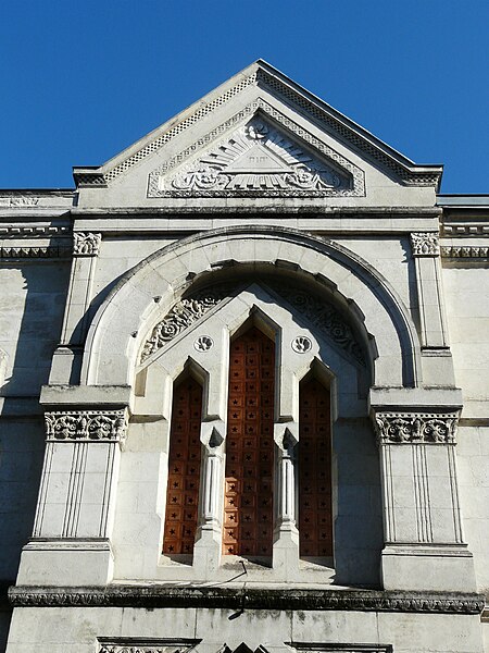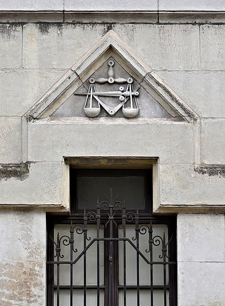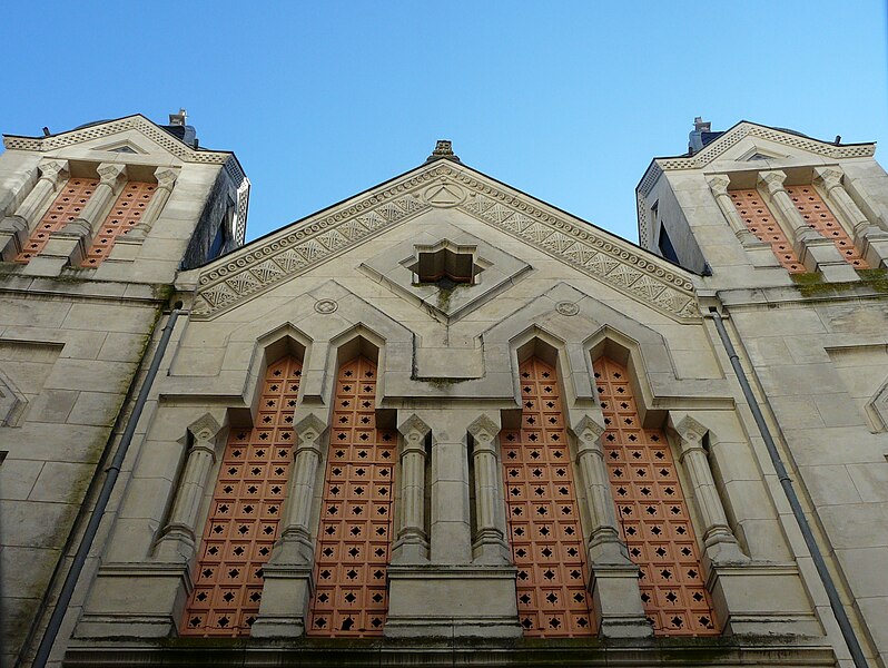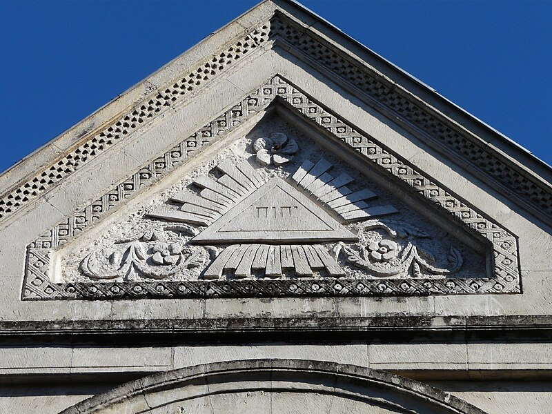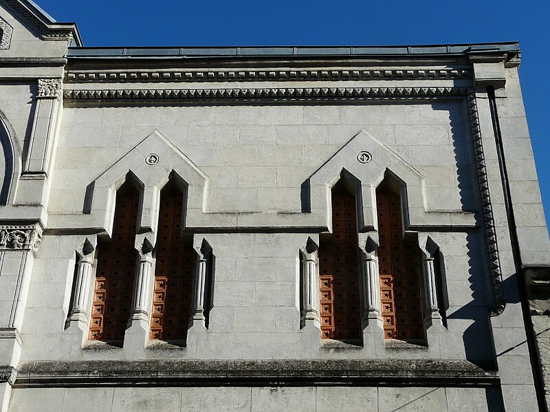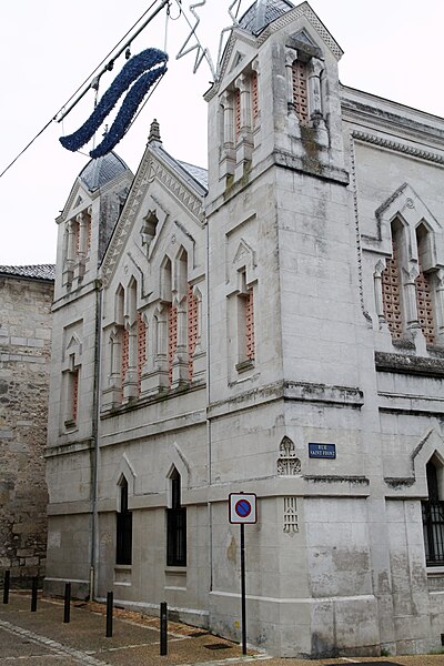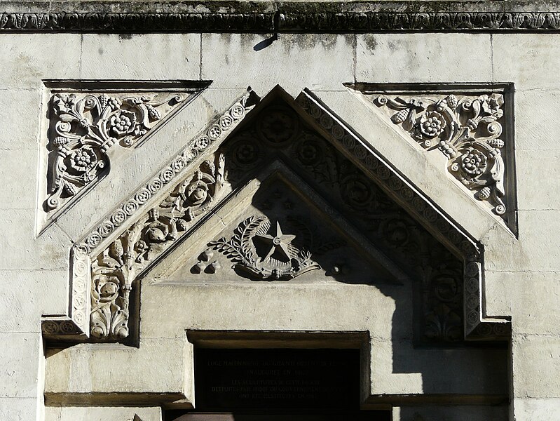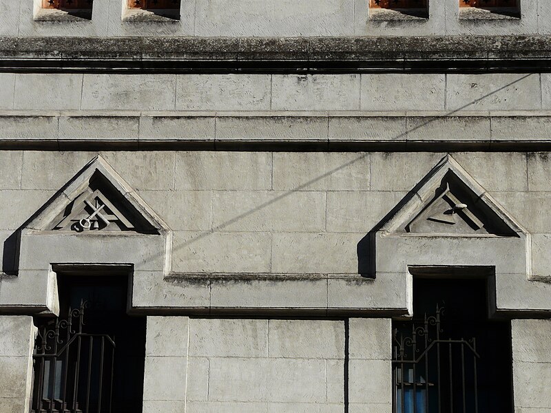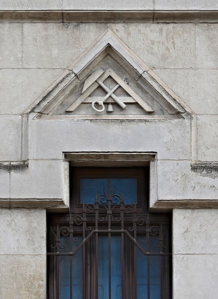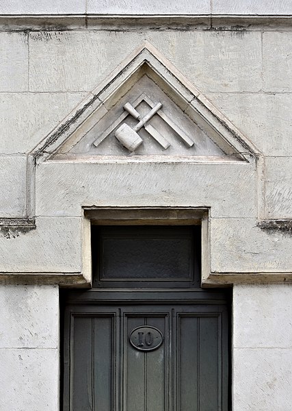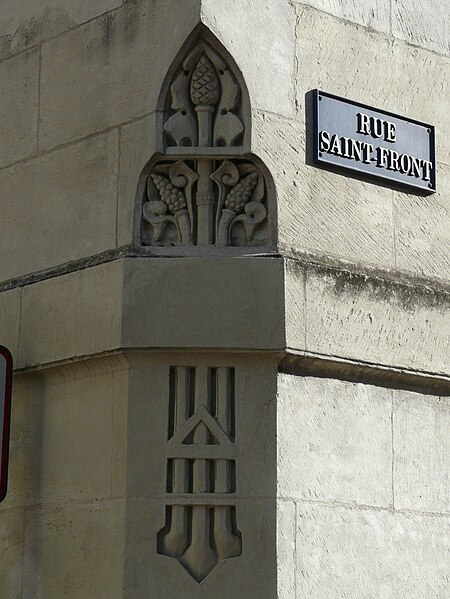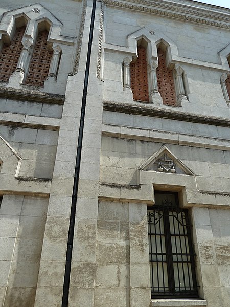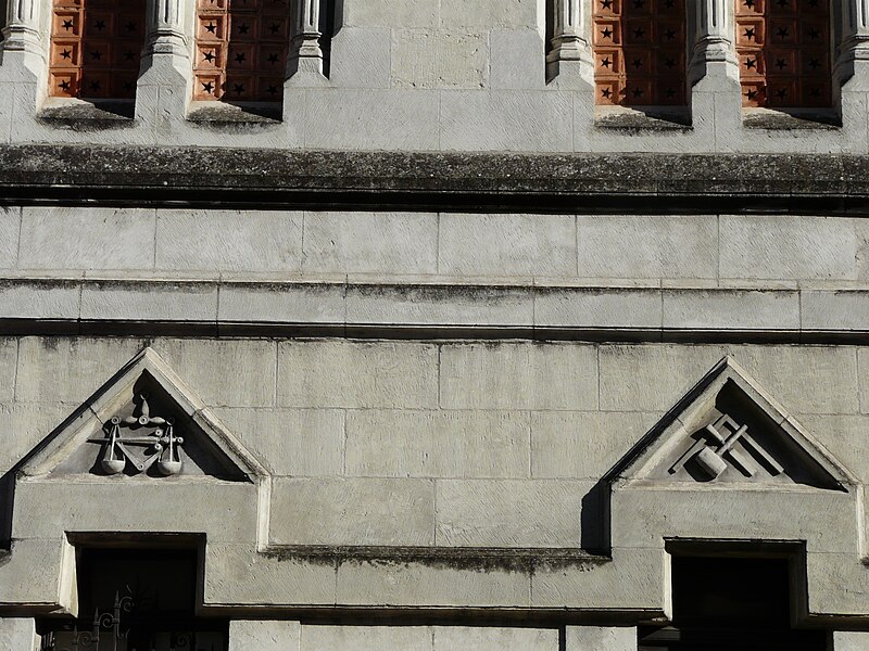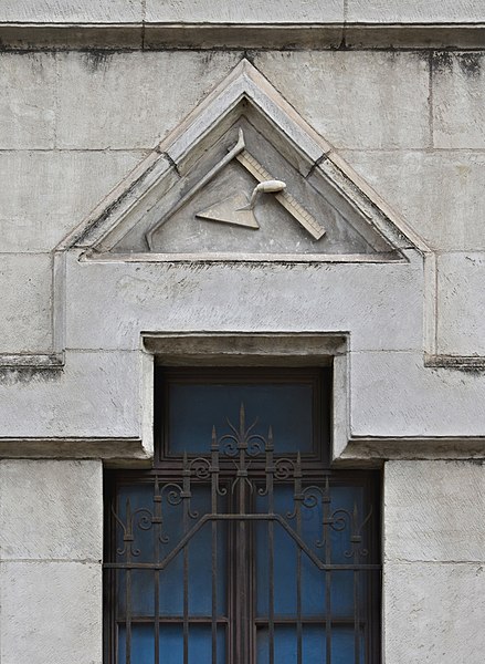 Seules les façades nord et ouest reçurent un décor inspiré d'une architecture mauresque balkanique : les ouvertures de l'étage sont géminées et ornées de colonnettes supportant un arc mitré, et deux types de petits clochetons encadrent le pignon. La décoration privilégie les lignes brisées, ponctuées d'éléments circulaires, de rinceaux et de motifs végétaux. Sur la façade principale, les fenêtres du rez-de-chaussée sont surmontées de sculptures représentant des outils du compagnonnage et de la franc-maçonnerie — équerre, compas, fil à plomb, truelle, maillet — et le portail est surmonté d'un tympan richement décoré de feuillages, au centre duquel figure une étoile à cinq branches. Au-dessus du portail, une fenêtre encadrée de pilastres est coiffée d'un fronton triangulaire, et des frises géométriques soulignent le bord inférieur des toits.