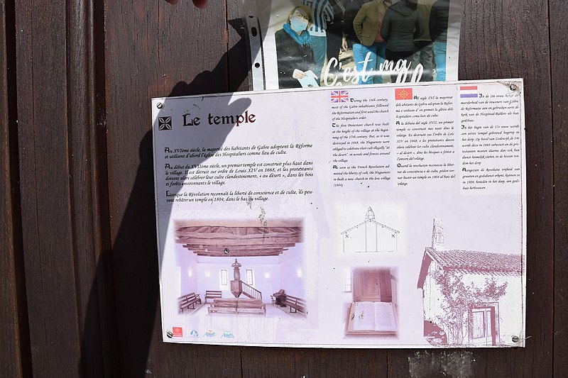 Le temple protestant de Gabre, situé 7 place de la Mairie dans l'Ariège, est un édifice modeste et simple, qualifié de « temple au Désert ». Gabre fut le siège d'une commanderie d'Hospitaliers dès le XIIe siècle et, au début du XVIe siècle, des verriers s'installèrent dans la région du Mas-d'Azil, attirés par l'abondance de bois et de sable. Au milieu du XVIe siècle, les idées de la Réforme se répandirent dans la région et la population de Gabre y adhéra massivement, les verriers en tête. En 1568, les commandeurs furent dépossédés de la tour et l'église partiellement détruite fut affectée au nouveau culte. La révocation de l'édit de Nantes entraîna la disparition de ce lieu de culte et contraignit les fidèles à des pratiques clandestines ; les gentilshommes-verriers organisèrent alors des assemblées illicites en plein air. Parmi ces assemblées, celle de 1697 dans le bois de la Bade, où prêchait le menuisier Gardel, fut réprimée et donna lieu à des condamnations aux galères et à la prison. L'église Saint-Laurent, ayant été endommagée puis restaurée, avait été utilisée comme temple protestant ; l'édifice fut rendu aux catholiques après l'édit de Nantes en 1598. Un temple fut reconstruit sur les hauteurs de Las Termes au début du XVIIe siècle, desservi par les pasteurs du Mas-d'Azil et du Carla. En 1625, le maréchal de Thémines assiégea le Mas-d'Azil sans parvenir à prendre la cité, tenue par Jacques de Saint-Blancard et soutenue par les protestants des environs. En 1668, Louis XIV ordonna que les protestants démolissent eux-mêmes leur temple ou en paient les frais ; après la révocation, les habitants durent soit abjurer, soit cacher leur foi. Deux familles de gentilshommes-verriers sont particulièrement citées : les de Robert, à la verrerie des Garils, et les de Grenier, à Gabre et Fabas. En 1762, l'affaire du pasteur François Rochette et l'arrestation des frères de Grenier aboutirent à des poursuites et à des condamnations capitales, dont l'exécution figure dans les documents d'époque. Après la Révolution, la liberté de culte fut rétablie et environ 7 000 protestants subsistaient alors en Ariège, principalement autour du Mas-d'Azil, de Saverdun et de Mazères. En 1802, les articles organiques instituèrent des consistoires pour les Églises réformées et, au début du XIXe siècle, la population protestante de Gabre était évaluée à 267 habitants sur 520. La topographie de la commune conduisit à la construction de deux temples : l'un en 1803 au cœur du village, près de l'église catholique Saint-Laurent, financé par l'État au titre de l'Église réformée consistoriale ; l'autre, en 1804, sur les hauteurs à Las Termes, édifié par l'Église libre au site de l'ancien temple, geste qui traduisit aussi un différend théologique. Les deux constructions furent prises en charge par la communauté protestante, la commune ne pouvant assumer les dépenses. Très tôt, le temple du village nécessita des réparations : un devis de 1834 prévoyait la reprise d'un mur du couchant et le replâtrage des maçonneries, d'autres travaux urgents furent signalés en 1856 et, en 1889, le conseil presbytéral dénonça le défaut de solidité de l'édifice. Devenu propriété de la commune en 1905, le temple resta le seul lieu de culte protestant de Gabre après la transformation du temple de Lasternes en école. La communauté fit appel à l'aide des autorités tout au long du XIXe siècle, et plusieurs habitants de Gabre furent reconnus comme Justes pendant la Seconde Guerre mondiale. Depuis 1938, Gabre est rattaché aux Églises évangéliques libres et le temple a fait l'objet d'entretiens constants, avec d'importants travaux menés entre 1993 et 1998 financés par la commune et par des dons privés, puis des interventions plus récentes en 2012-2013. Le temple a été restauré à plusieurs reprises au XXe siècle, notamment en 1927 et en 1997, et il a été inscrit au titre des monuments historiques le 7 avril 2015. La paroisse est membre de l'Union nationale des Églises protestantes réformées évangéliques de France.