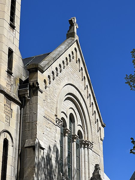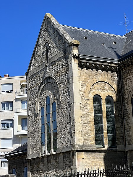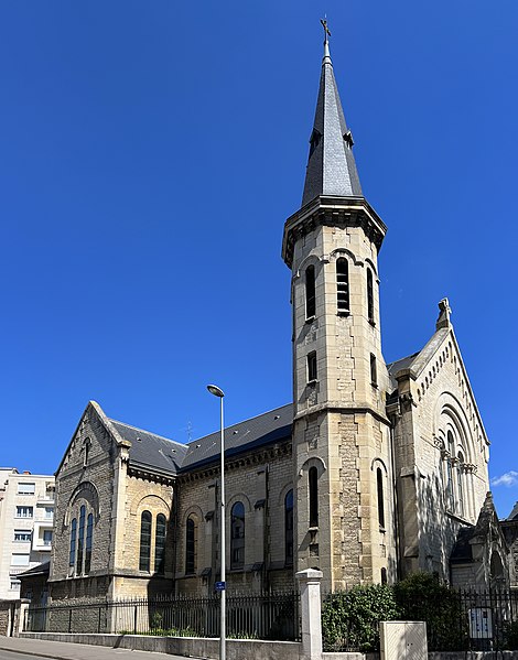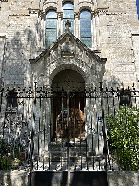 Architecturalement, Félix Paumier a élevé le temple entre août 1896 et décembre 1898 dans un style néoroman rhénan ; l'édifice est identique au temple protestant des Batignolles à Paris, à la différence près que le clocher se trouve à gauche de l'entrée. Le clocher abrite une cloche de 620 kg nommée Sophia, fondue à Dijon par M. A. Farnier, dont le flanc porte l'inscription tirée de l'Évangile selon Luc 2,14 : « Gloire à Dieu au plus haut des cieux ! Paix sur la terre et bienveillance envers les hommes. » Le porche porte en lettres capitales « Église réformée de France » et, au-dessus, une Bible en bas-relief installée en 1910 ; sur ses pages sont gravés « La sainte Bible » à gauche et « La parole est vérité », citation de Jean 17,17, à droite. À l'intérieur, la chaire et la table de communion ont été conçues par l'architecte Félix Paumier.