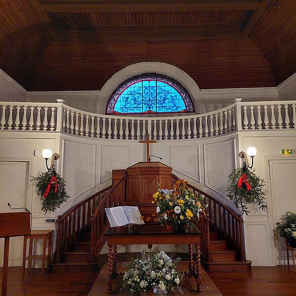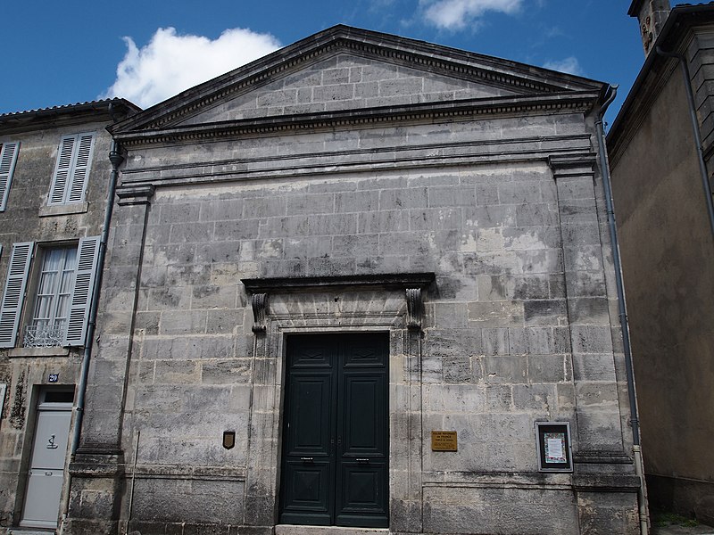 Le temple protestant de Jarnac, situé 16 rue Abel Guy, est géré par la paroisse du Cognaçais, membre de l'Église protestante unie de France. Élevé à cet emplacement en 1761, il est le plus ancien temple encore en exercice dans la région. Jarnac fut un foyer calviniste précoce de l'Angoumois et a connu des lieux de culte successifs, le premier installé dans une grange proche du château ayant été supprimé à la fin du XVIIe siècle. La « maison d'oraison » de 1761, qui occupe l'actuel emplacement, a été agrandie et rehaussée au début du XIXe siècle. À partir de 1820, les travaux d'agrandissement et de rehaussement furent réalisés d'après les plans de François-Nicolas Pineau et sous le contrôle de Paul Abadie père, ce qui permit l'accès direct au temple depuis la rue. Des devis datés de 1862 annoncent des réparations et aménagements intérieurs, mais les travaux ne furent entrepris qu'à partir de 1888, lorsque l'architecte Albert Cochot remplaça la charpente et réaménagea l'intérieur. Ces réaménagements inclurent un plafond en forme de vaisseau inversé, une sacristie, une tribune, une mosaïque d'entrée et des vitraux. Le temple présente un plan rectangulaire très allongé et est construit en pierre de taille ; ses dimensions sont de 30 mètres sur 10. La façade néo-classique, ordonnancée et encadrée de deux colonnes à pilastre, illustre la sobriété de l'église réformée ; elle a été inscrite aux monuments historiques en 1998. L'intérieur se distingue par sa sobriété liturgique : trois rangs de bancs en sapin blond font face à un ensemble de boiseries comprenant la chaire, la balustrade et la table de communion. Les vitraux, ornés de feuilles d'acanthe et de grappes de raisin, renvoient à la symbolique biblique de la Sainte-Cène et au rôle local du négoce vinicole. Un décalogue en pierre daté de 1694, trouvé à Givrezac, est accroché sur le mur droit et une mosaïque décore le sol de l'entrée. L'orgue Merklin de Lyon, composé de sept jeux et onze registres, fut installé en 1901 sur la tribune d'entrée grâce à un legs d'Adolphe Persaud ; il figure à l'inventaire supplémentaire des monuments historiques depuis 2011. Le temple a joué un rôle local important dans la vie religieuse et associative : en 1906 s'y tint une assemblée préparatoire à l'unification des Églises réformées françaises, dite « Union de Jarnac ». En juin 2013, il a célébré l'union formant l'Église protestante unie de France. L'ancienne rue du Faubourg du Chail a été rebaptisée rue Abel Guy en 1891 en mémoire d'un mécène lié à la paroisse, et un legs a permis des acquisitions et des installations au service de la communauté. La succession des pasteurs qui ont servi la paroisse est documentée depuis 1801 ; parmi eux figurent, dans l'ordre, Jean Mazauric, Guillaume Berneaud, Antoine Benjamin Guy, Pierre Maurice Crozes, Maurice Dejarnac, Mathieu Augustin Ducros, Eugène Hoffet, Paul Ribagnac, Roger Bellant, Georges Philip, David Mitrani, Nicolas Blanc et, depuis 2021, Cyrille Payot, entre autres. Le temple demeure un témoin majeur du protestantisme en Charente, marqué par son architecture, ses aménagements intérieurs et son rôle continu dans la vie religieuse locale.