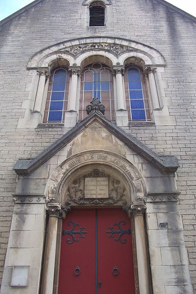 L'entrée est ornée d'un fronton formant une voûte portant l'inscription « aimez-vous les uns les autres », qui encadre une Bible où figure la citation « le ciel et la terre passeront, mes paroles ne passeront point (Mathieu XXIV, 35) ».