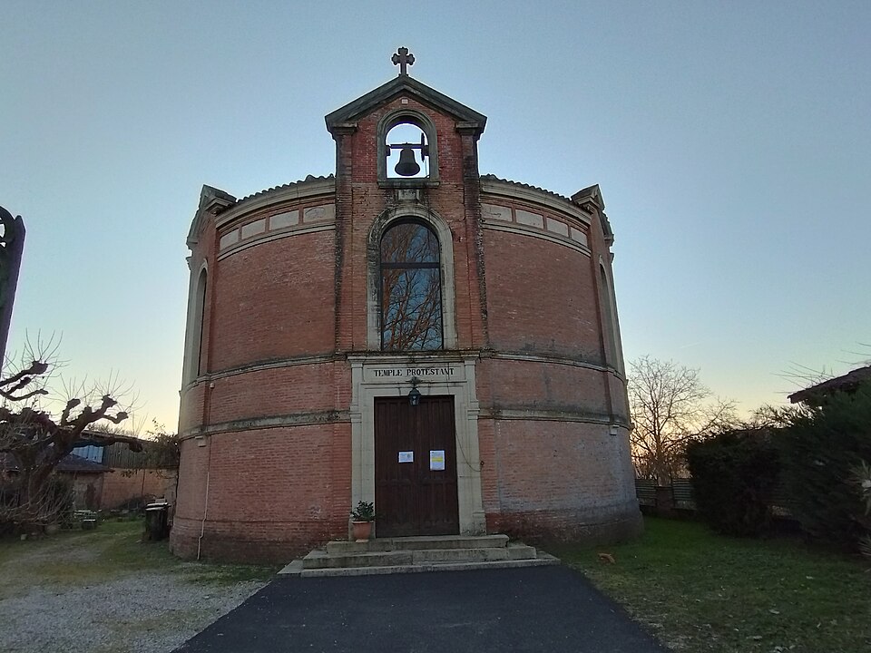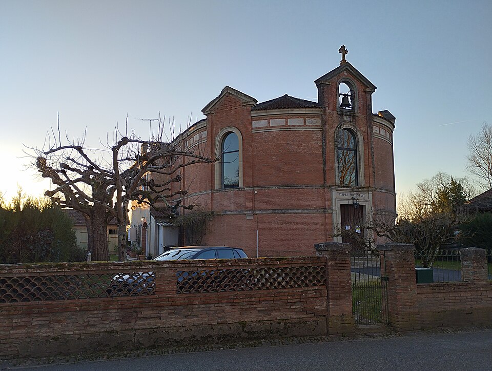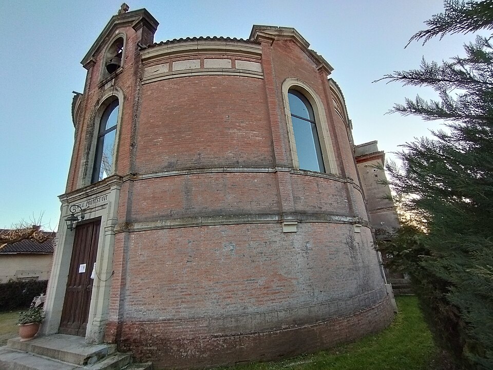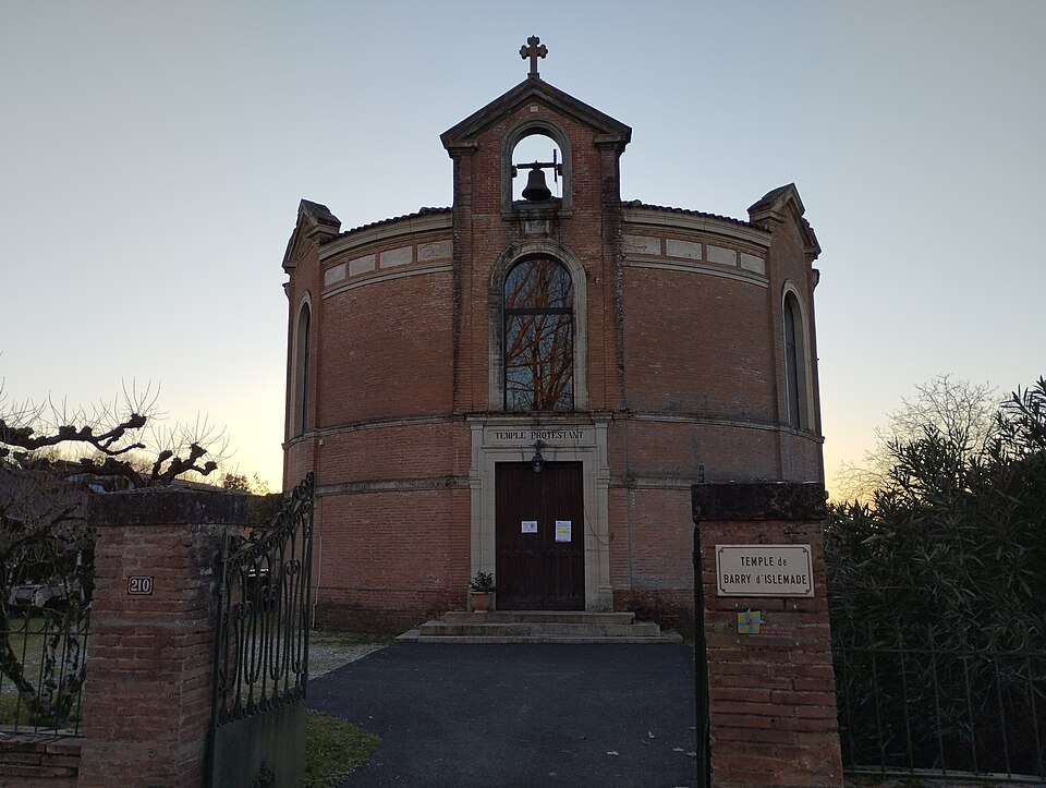 Le temple protestant de Barry-d'Islemade, situé dans la commune éponyme (Tarn-et-Garonne, Occitanie), abrite une paroisse membre de l'Église protestante unie de France. L'église protestante de Barry-d'Islemade fut créée en 1803 après sa séparation du consistoire de Montauban ; le premier temple, construit en terre peu après la Révolution et implanté près du carrefour de la route des rives du Tarn et de celle de Ventilhac, menaçait ruine au milieu du XIXe siècle. La reconstruction fut envisagée dès 1857 et examinée en séance du consistoire ; les plans et devis estimèrent la dépense et conduisirent à des demandes de secours auprès de l'État, qui accorda plusieurs subventions à la fin des années 1850 et au début des années 1860. La reconstruction se fit sur un terrain cédé par Jean Lacaze en échange des matériaux de l'ancien temple et fut conduite par l'architecte Théodore Olivier. Celui-ci présenta plusieurs projets : un premier dossier de juin 1858 fut rejeté par le ministère des Cultes en raison de son coût, puis des devis modifiés furent remis à l'automne 1858 et un projet transmis au préfet en février 1859 ; les plans et devis successifs semblent toutefois absents des fonds des archives départementales. Les travaux, exécutés par l'entreprise Boyé, furent certifiés achevés par Olivier en janvier 1860, qui signala peu après la nécessité d'interventions complémentaires entraînant une nouvelle demande de secours. Olivier proposa également des plans d'agrandissement de l'école protestante, comprenant une salle de classe accolée au chevet et surmontée d'un logement pour l'instituteur ; malgré le refus de la commune de participer, ce projet put être réalisé grâce à une aide du ministère, et le bâtiment d'école, achevé après acceptation du conseil presbytéral, sert aujourd'hui de presbytère. En 1881, la commune accepta d'acquérir un terrain destiné à un cimetière protestant lors de l'agrandissement du cimetière catholique. En 1935, une donation de madame Henri Courtois de Maleville permit l'ajout d'un clocheton sur la façade ; l'ouvrage fut réalisé par l'entreprise Bourdoncle d'Albefeuille-Lagarde d'après un dessin de Germain Olivier et la cloche provint des fonderies Causard de Colmar, le petit clocher étant inauguré le 22 septembre 1935. Le temple, caractérisé par une forme circulaire relativement rare et construit en brique rouge lors de sa reconstruction, conserve en son intérieur une grande tribune en bois à la fois vernaculaire et élégante. L'édifice a été inscrit au titre des monuments historiques par arrêté du 20 mai 2015.
