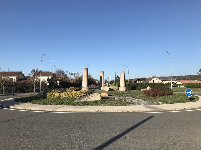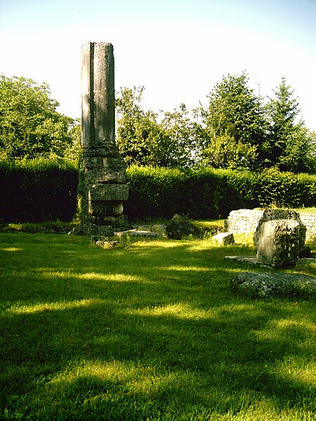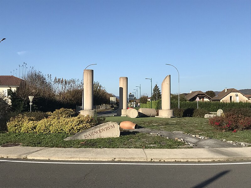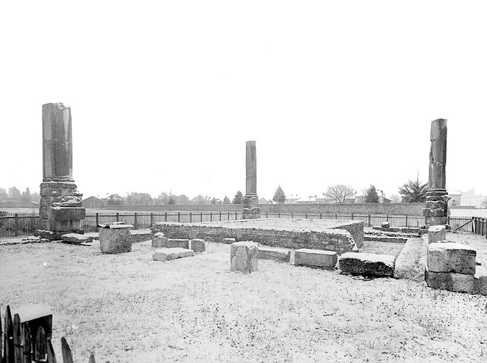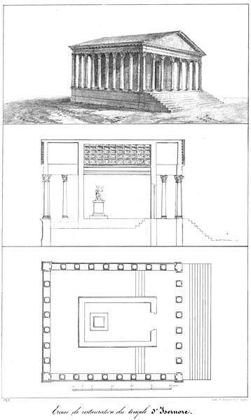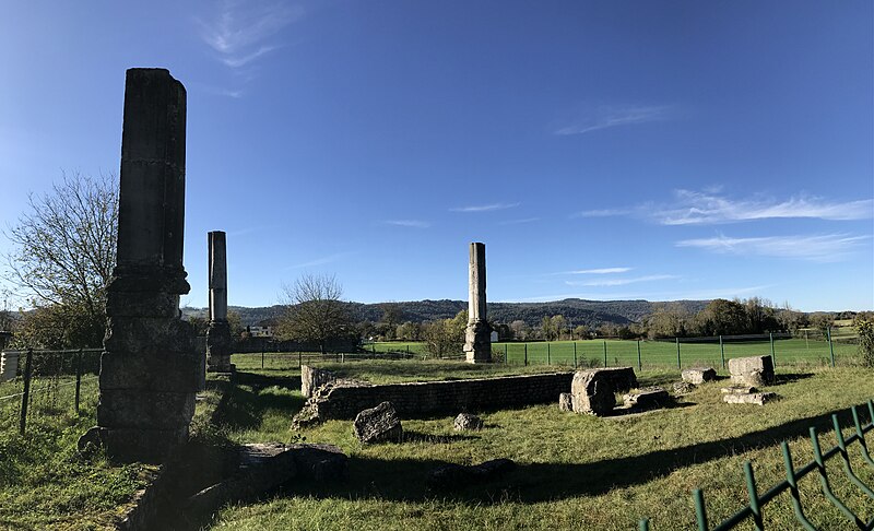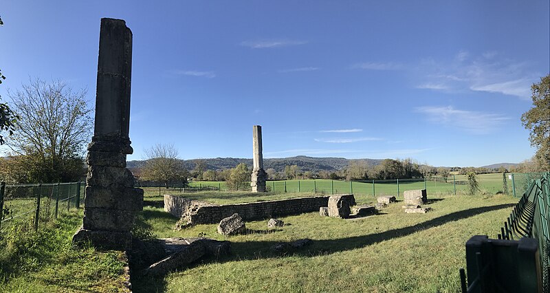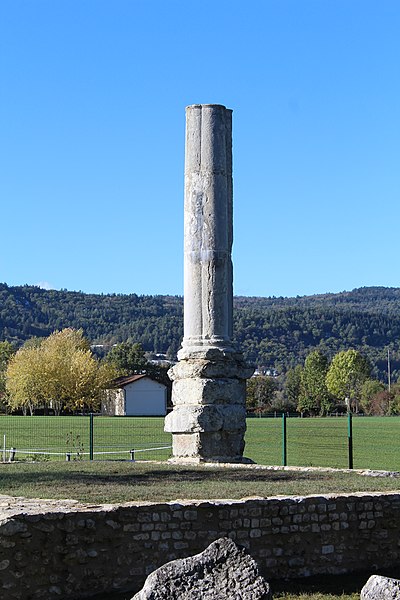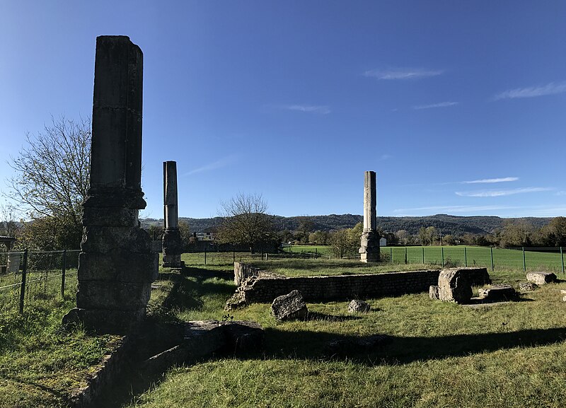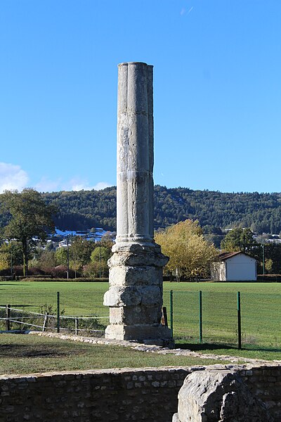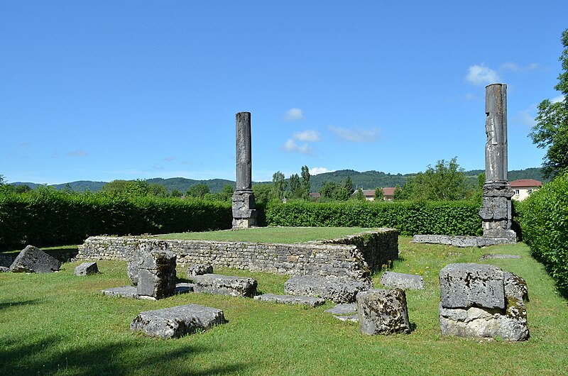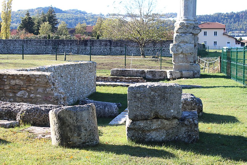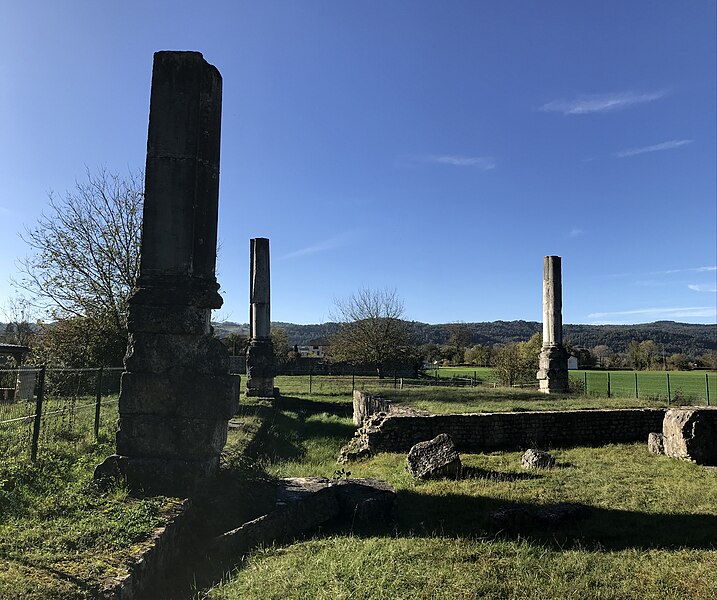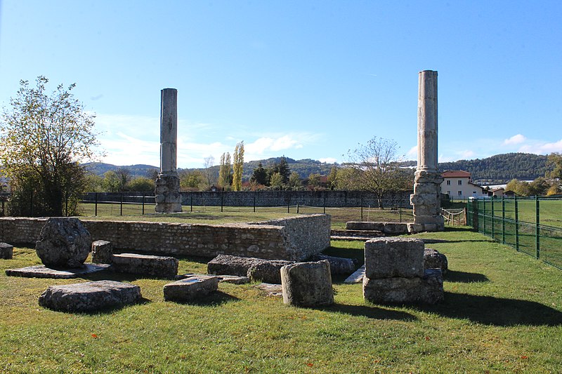 Le temple gallo-romain d'Izernore, situé dans la commune d'Izernore (Ain, Auvergne‑Rhône‑Alpes), est classé au titre des monuments historiques en 1840 et constitue le seul vestige antique visible en élévation dans le département. Il correspond à deux édifices monumentaux successifs érigés au même emplacement entre le milieu du Ier et la fin du IIe siècle, le second réutilisant des structures du premier, et s'inscrit dans un ensemble cultuel plus vaste rattaché à l'agglomération antique d'Isarnodurum ; l'ensemble paraît abandonné à la fin de l'Antiquité. Les vestiges encore en élévation — trois piliers d'angle et des blocs épars — appartiennent au second monument, la base des murs étant une reconstruction du début du XXe siècle, et l'élévation insuffisante empêche une restitution certaine des bâtiments. Le site, implanté à environ 500 m au nord‑nord‑est du chef‑lieu communal à 462 m d'altitude, occupe le rebord d'une crête dominant le bief et la vallée du synclinal de l'Oignin‑Izernore, et une voie antique nord‑sud semble passer à l'ouest du temple. Des monnaies gauloises attestent une occupation antérieure, une couche de cendres marque un incendie séparant les deux phases, et la datation des deux temples reste incertaine, reposant en partie sur des monnaies dont la chronologie est limitée. Le second édifice, bâti sur les fondations du premier, est un temple périptère sur podium avec large escalier d'accès et des dimensions d'environ 19,20 × 22,60 m ; sa cella de 7,80 × 12,80 m est décentrée vers la façade, le massif de la colonnade mesure 1,80 m et les trois piliers conservés, en calcaire dur, comportent des demi‑colonnes engagées. Le décor peint, dont plusieurs fragments sont conservés, comportait des panneaux blancs encadrés d'une large bande vermillon (cinabre) et des motifs géométriques, végétaux et animaliers, dont certains semblent inspirés de modèles italiques. L'identité de la divinité vénérée demeure inconnue : la tradition a proposé Mercure sur la base d'une inscription votive en remploi, mais d'autres indices (fragment de pétase, doigt de bronze, petite statuette) ont conduit à des hypothèses diverses sans preuve décisive. Le site a été mentionné dès le haut Moyen Âge, fouillé dès la fin du XVIIIe siècle puis au XIXe siècle, protégé et restauré au début du XXe siècle, étudié et publié à plusieurs reprises au XXe et XXIe siècles, consolidé après des fouilles récentes et valorisé par un musée local et une réplique stylisée.