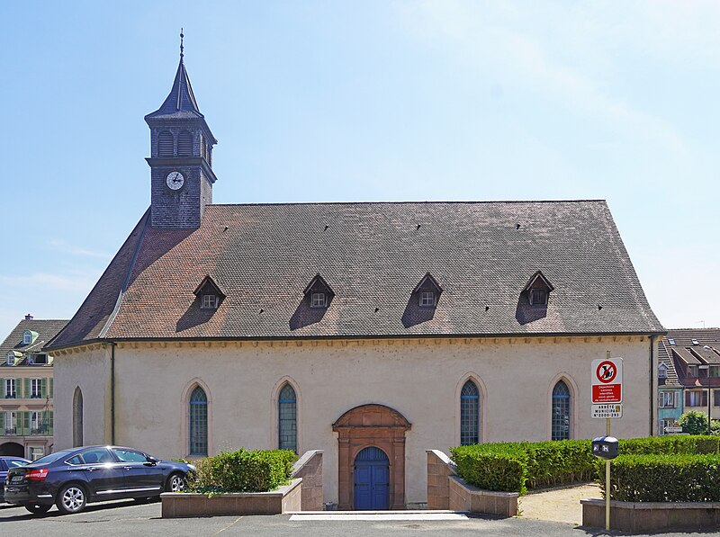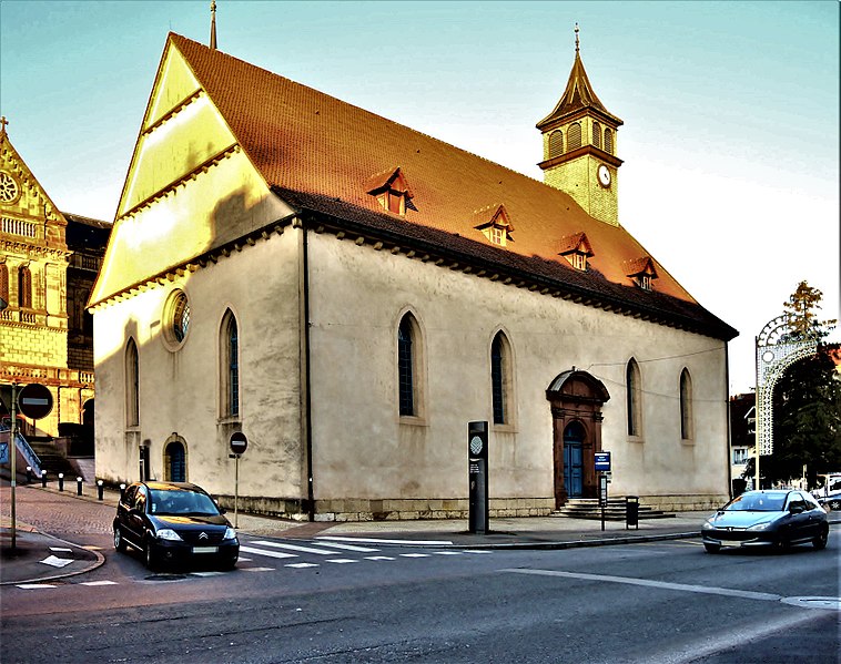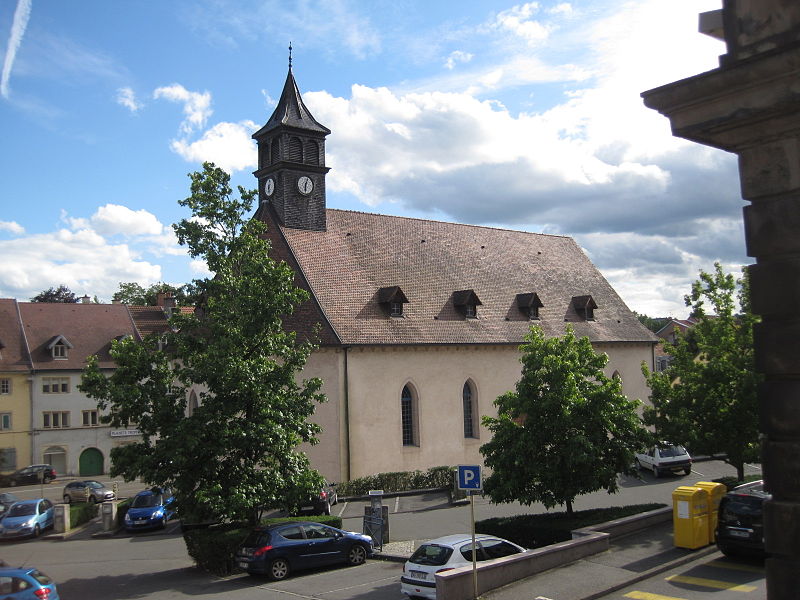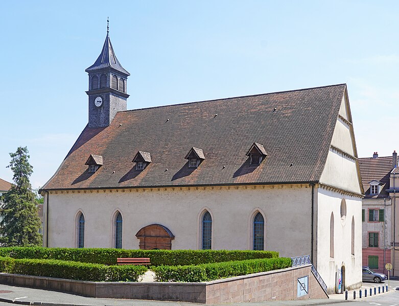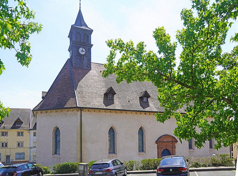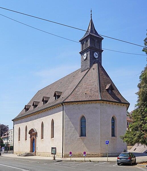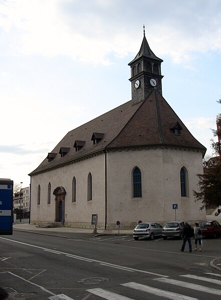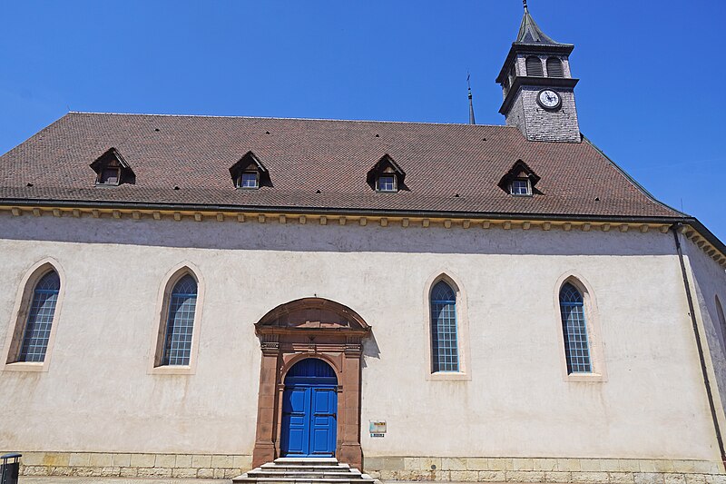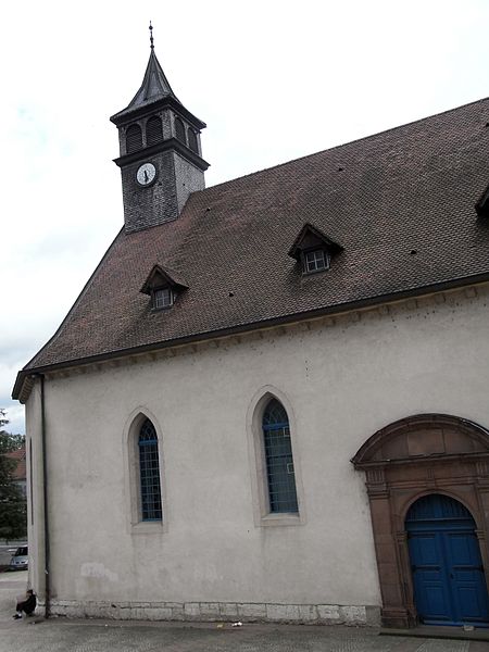 Deuxième édifice protestant de la ville, il a été érigé à partir de 1674 sur décision du prince Georges II de Wurtemberg pour suppléer le temple Saint-Martin, devenu insuffisant face à l'afflux de réfugiés huguenots et aux nouveaux habitants du quartier de la Neuve Ville (actuel faubourg de Besançon). Les travaux furent interrompus en 1676 lors de l'occupation conduite par le maréchal de Luxembourg au service du roi Louis XIV ; le bâtiment, déjà couvert, servit alors de magasin à fourrage. Achevé entre 1732 et 1739, il fut donné à la ville par le duc Louis Eberhard de Wurtemberg le 23 juillet 1733 et consacré le 29 décembre 1739, date portée par une inscription. En 1764, un marché prévit la reconstruction du campanile à son emplacement actuel et l'aménagement d'une tribune intérieure. Des réparations de façades eurent lieu en 1897. Désaffecté après 1949, il servit un temps d'entrepôt pour de vieux papiers destinés au recyclage. Sa toiture, refaite récemment en bardeaux d'asphalte, fut ravagée par un incendie le 7 avril 1987 ; la restauration effectuée en 1988 par « les Compagnons de France » a permis son aménagement en centre de conférence.