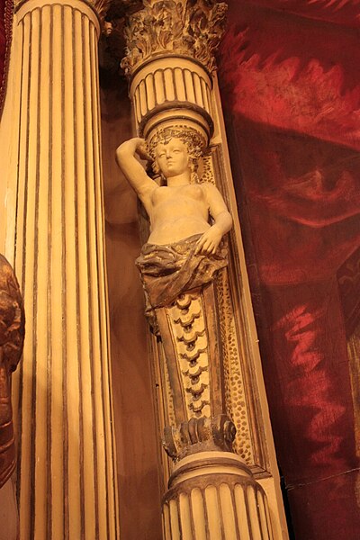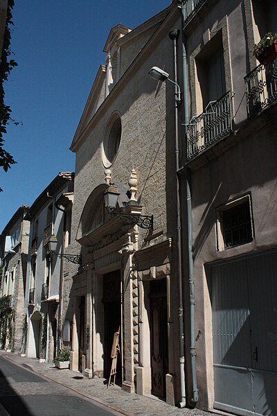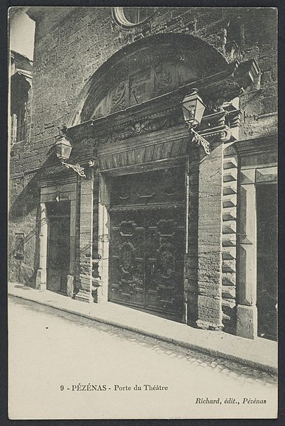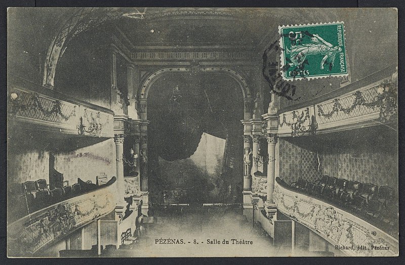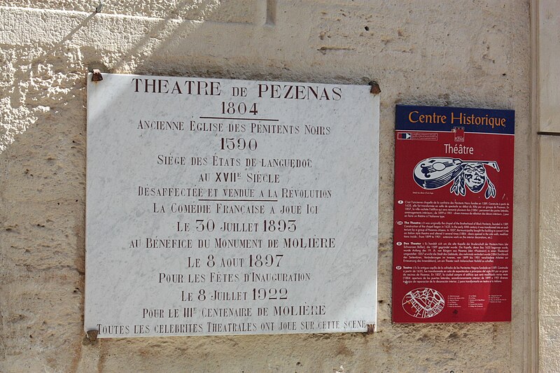 Édifice élevé vers 1590, il fut à l'origine l'église de la confrérie des Pénitents noirs. Selon Poncet, la compagnie, fondée le 1er juin 1589 à l'imitation des pénitents blancs, fut agréée en 1605 par Paul V et approuvée par l'évêque d'Agde en 1635. De l'édifice primitif subsistent principalement l'enveloppe des murs, la façade principale, la plus grande partie du voûtement de la nef et la sacristie ; l'aménagement intérieur originel a été profondément modifié lors de sa transformation en salle de spectacle. La porte d'entrée est encadrée d'une architecture de pierre à bossages, flanquée de pilastres ioniques et surmontée d'un entablement orné d'une frise à guirlandes, d'une corniche à denticules et d'un fronton courbe. Le plan primitif présentait un rectangle allongé terminé à l'est par un chevet plat fortement dévié vers le sud ; la nef, divisée en cinq travées, était couverte d'une fausse voûte d'ogives, et la sacristie voûtée d'arêtes, située au sud du chœur, servira plus tard de foyer des artistes, les loges étant disposées sous le plateau. Vendue comme bien national à la Révolution, l'église fut acquise en 1803 par une société de notables souhaitant doter la ville d'un théâtre et transformée l'année suivante en salle de spectacle. Ce premier théâtre, décrit en 1855 par l'architecte Joseph Montgaillard, présentait les caractéristiques des théâtres français de la fin du XVIIIe siècle : vestibule voûté d'arêtes, salle de concert au-dessus, café, bureau de distribution et salle des pas-perdus donnant accès au parterre, aux baignoires et aux deux niveaux de galeries ; sa capacité était d'environ cinq cents spectateurs. La municipalité décida l'achat en 1855, l'acquisition étant réalisée dans les années suivantes, et procéda à des aménagements successifs : interventions en 1867, des travaux importants en 1884 sous la direction d'A. Saunière, puis une campagne de restauration engagée à la fin du XIXe siècle. À l'occasion des fêtes en l'honneur de Molière, un réaménagement fut décidé à partir de 1897, et l'aspect actuel de la salle italienne date essentiellement de la rénovation menée de 1899 à 1901 par l'architecte Paul Jeanbon ; cette décoration de 1901 illustre l'art décoratif officiel de l'époque. Plusieurs aménagements et décors supplémentaires furent réalisés jusqu'en 1947.