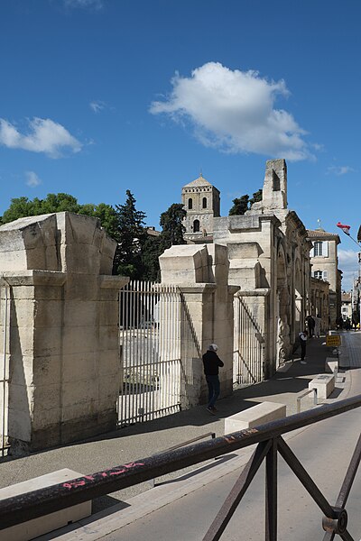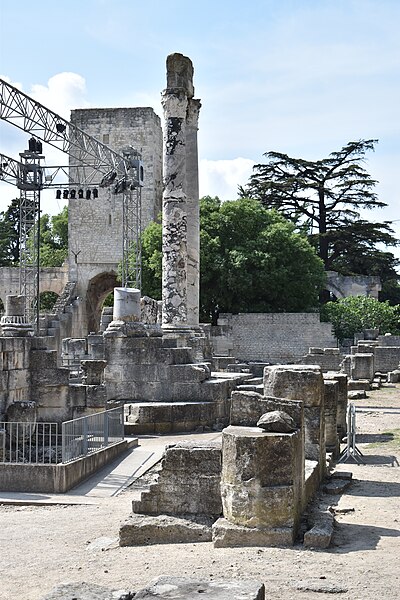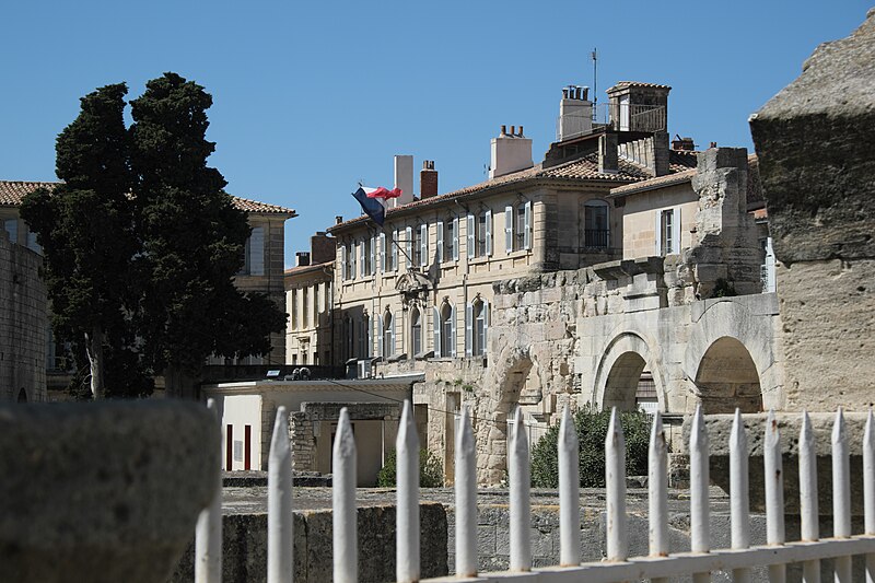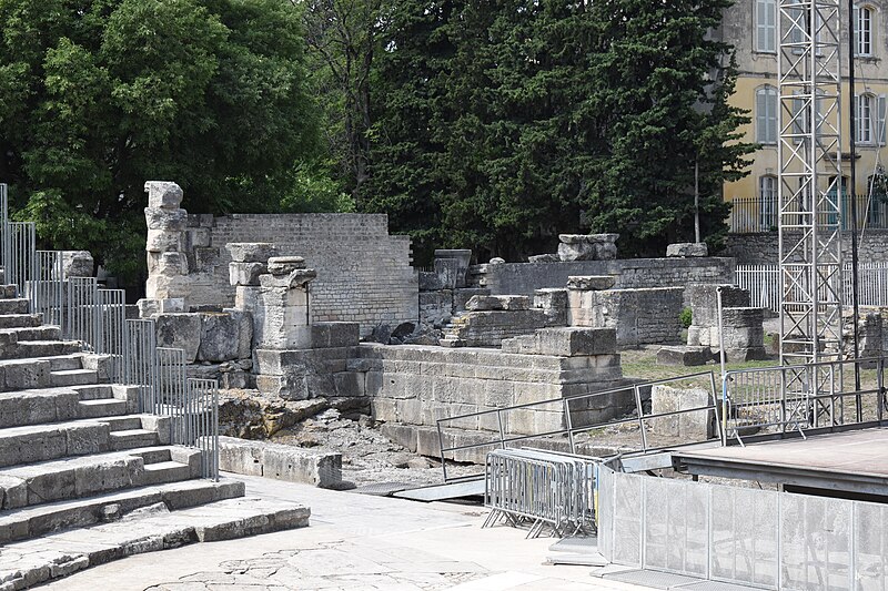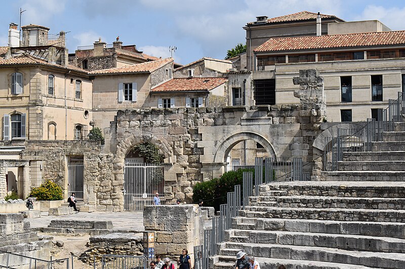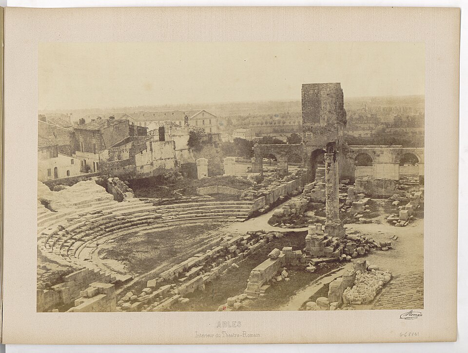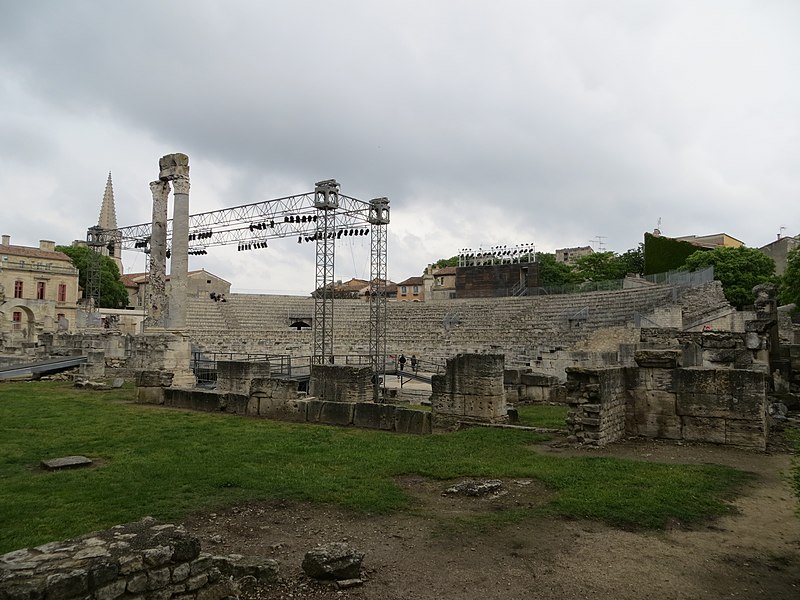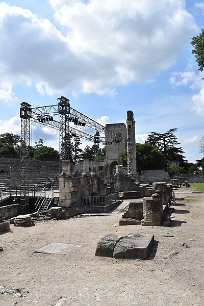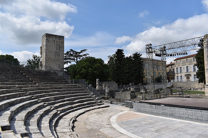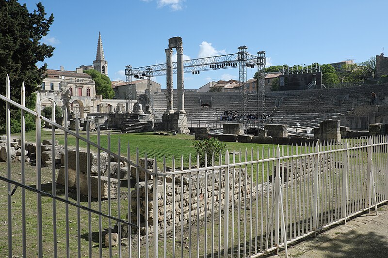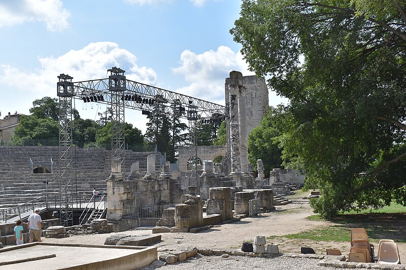 Le théâtre romain d'Arles a été construit à la fin du Ier siècle av. J.-C., sa construction s'achevant vraisemblablement vers 12 av. J.-C., peu après la fondation de la colonie romaine sous Auguste. Installé sur le decumanus, au sommet de la colline de l'Hauture, il fait partie des premiers théâtres en pierre du monde romain. Ne pouvant s'appuyer sur un flanc rocheux, la cavea repose entièrement sur un vaste appareil de substructures constitué de galeries concentriques et de salles voûtées rayonnantes. D'un diamètre de 102 mètres, la cavea comportait 33 rangées de gradins et pouvait accueillir environ 10 000 spectateurs, répartis selon les classes sociales : le peuple dans les rangs supérieurs, les chevaliers et notables sur les gradins inférieurs et dans l'orchestre. Les arcades extérieures, encore partiellement conservées, présentent une superposition de trois ordres doriques tardo‑antiques qui ne suivent pas les modèles vitruviens ; leur ornementation fut copiée au XVIe siècle dans des monuments comme le jubé de la cathédrale de Bordeaux ou le château d'Uzès. La scène reposait sur une plate‑forme de bois longue de 50 mètres et large de 6 mètres, dont les substructions abritaient la machinerie du théâtre. Le mur de scène comportait une centaine de colonnes d'ordre corinthien réparties sur trois niveaux ; seules deux d'entre elles subsistent aujourd'hui, surnommées « les deux veuves ». Des niches du mur accueillaient une statuaire d'inspiration grecque, parmi laquelle la Vénus d'Arles, retrouvée sur le site, fait aujourd'hui partie des collections du Louvre après une restauration controversée. Le théâtre recevait des spectacles de tragédie, comédie, mimes et pantomimes d'origine romaine ou grecque, principalement lors de fêtes religieuses ; ces représentations étaient gratuites et destinées à un public jugé plus raffiné. Parfois, des représentations étaient réservées aux hommes et les femmes et les enfants devaient être accompagnés par un homme adulte. Jean‑Louis Vaudoyer a qualifié le théâtre d'Arles de « seul théâtre grec, en France », en référence au répertoire antique joué sur ce lieu. Le monument resta en usage jusqu'au début du Ve siècle ; on rapporte également qu'une représentation grandiose y fut offerte par l'empereur Constance II le 10 octobre 353. À l'époque paléochrétienne, l'Église utilisa une partie du théâtre comme carrière pour la construction de la basilique Saint‑Étienne, entreprise sous l'épiscopat d'Hilaire. Entre la fin du VIe et le début du VIIIe siècle, un mur du théâtre fut probablement renforcé et intégré à l'enceinte urbaine, complété d'une tour dite « Tour de Rotland ». Le terrain fut ensuite loti et occupé par des habitations, hôtels particuliers et établissements religieux, notamment un collège jésuite et une communauté de Sœurs de la Miséricorde ; au XVIIIe siècle, la cour du couvent servit à présenter des découvertes archéologiques. Les premières fouilles dès le XVIIe siècle ont mis au jour de nombreux vestiges, et des campagnes de dégagement plus systématiques commencèrent en 1828 sous l'impulsion du maire baron de Chartrouse ; les travaux, repris dans les années 1840, s'achevèrent en 1860. Parmi les découvertes figurent la Vénus d'Arles, un buste d'Auguste en Apollon et la tête d'Arles, aujourd'hui au Musée de l'Arles antique. Le théâtre est inscrit sur la liste des monuments historiques de 1840 dressée par Prosper Mérimée et figure depuis 1981 sur la liste du patrimoine mondial de l'UNESCO. Aujourd'hui le site est visitable : de l'élévation antique soutenant la cavea il ne subsiste qu'une travée absorbée au Moyen Âge dans le rempart et transformée en tour de défense. L'orchestre conserve l'empreinte du scellement de l'autel aux cygnes, emblème d'Auguste voué à Apollon, et deux colonnes isolées demeurent comme vestiges visibles du mur de scène. Le théâtre reste par ailleurs un lieu de spectacles et accueille notamment, entre fin juin et fin août, les Fêtes d'Arles et du costume, les Rencontres Internationales de la Photographie, le festival Les Suds, les Escales du Cargo et le Festival du film péplum.
