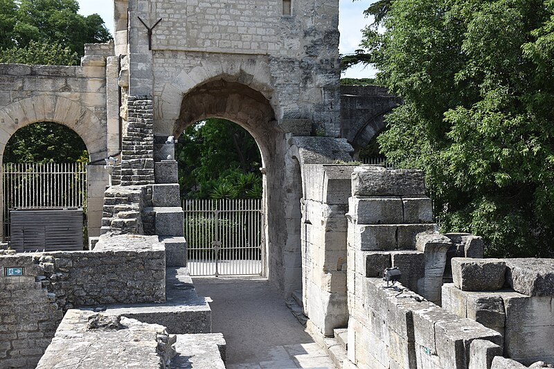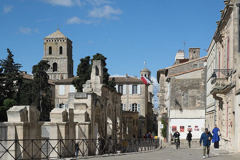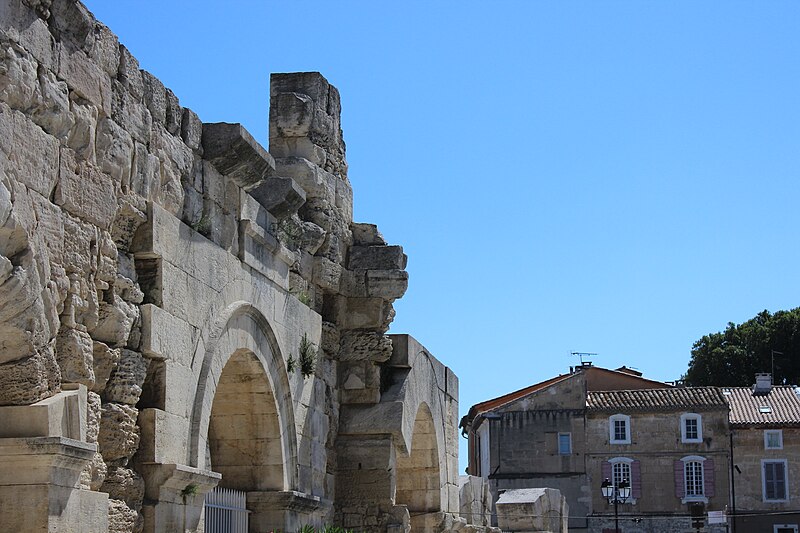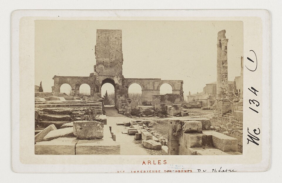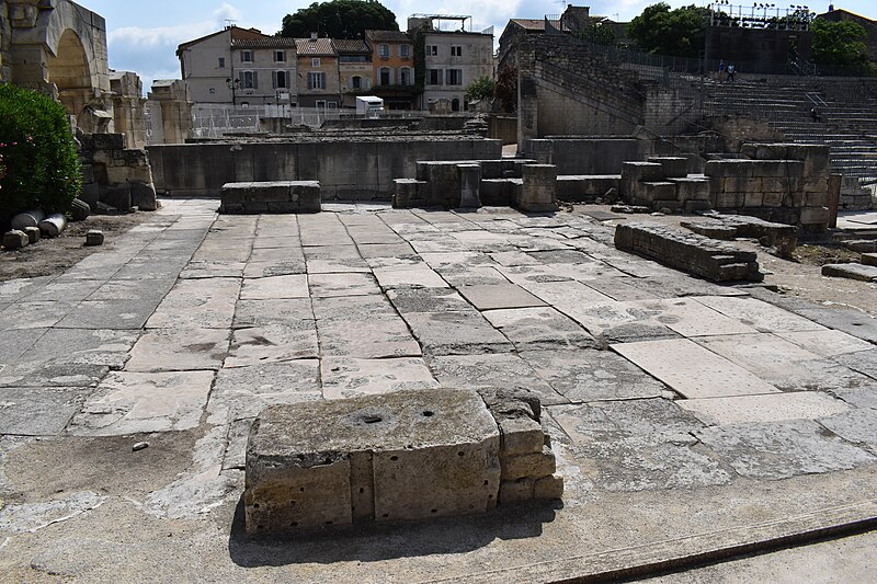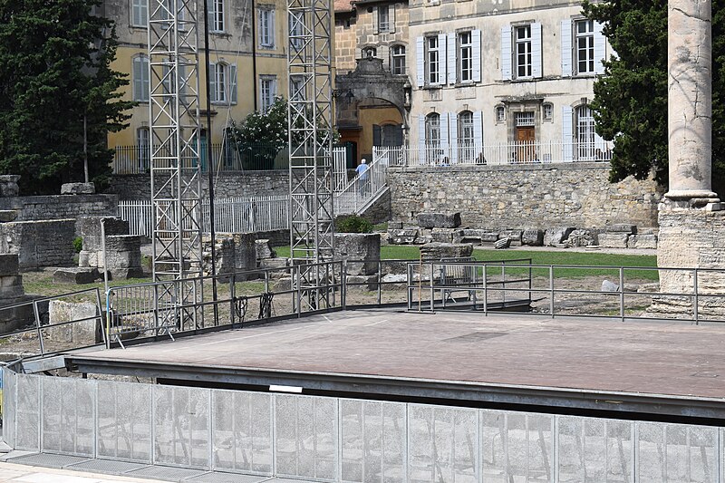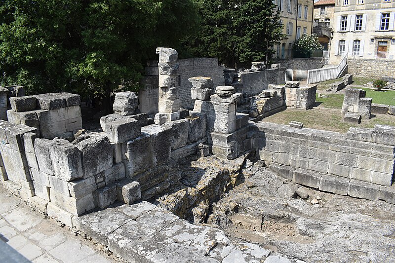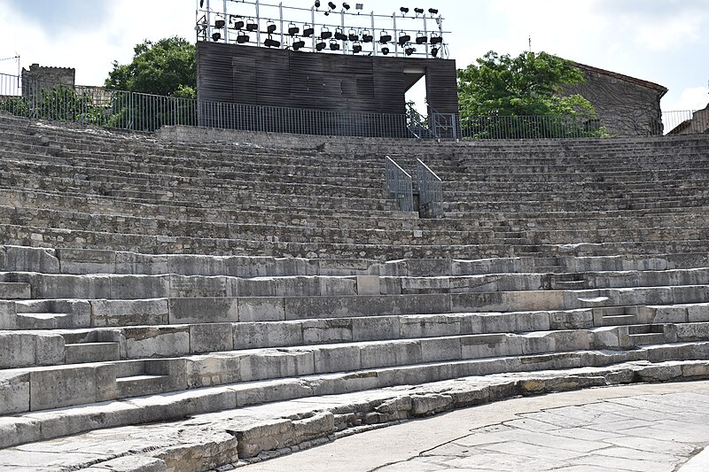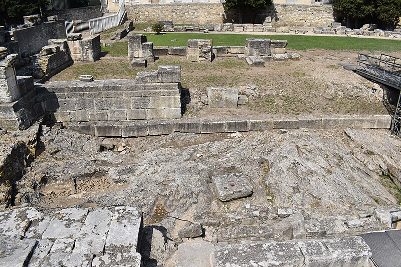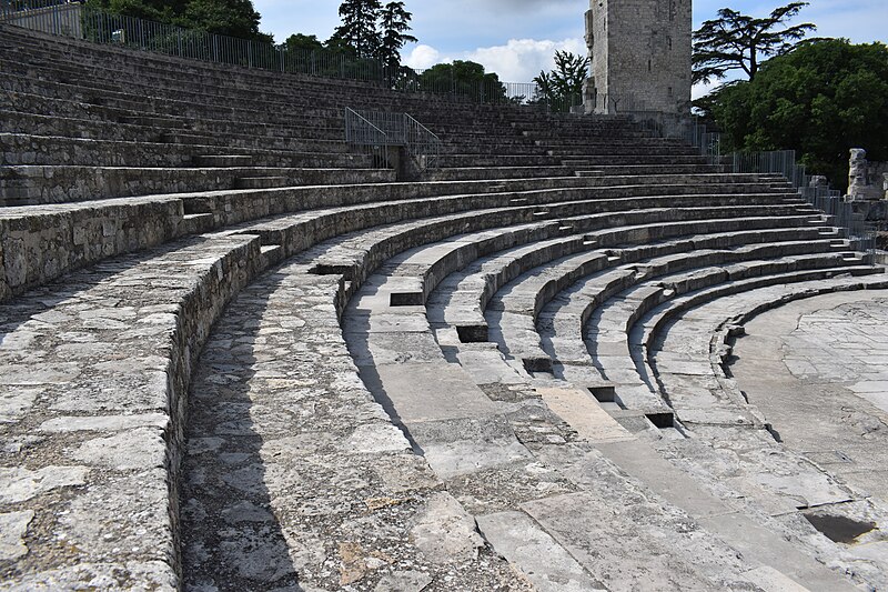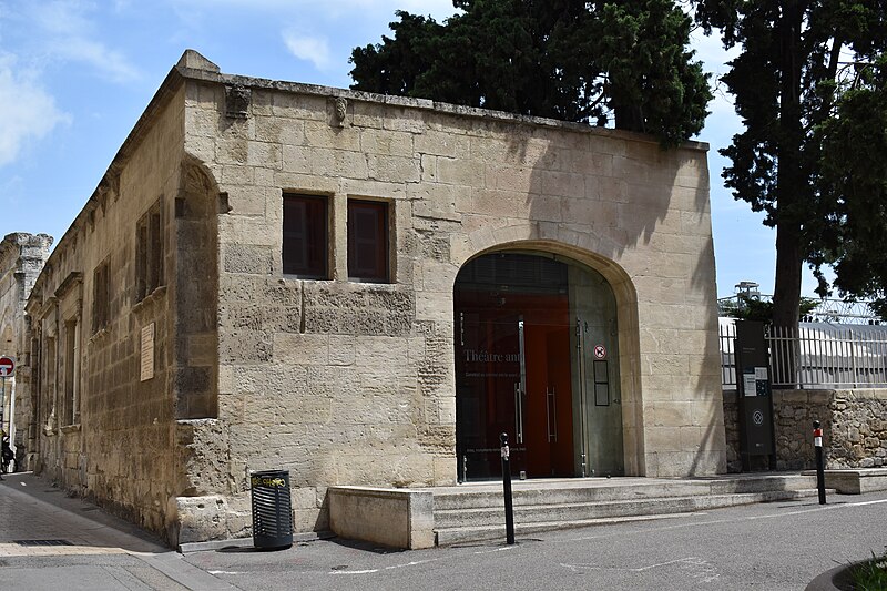 Le théâtre romain d'Arles a été construit à la fin du Ier siècle av. J.-C., sa construction s'achevant vraisemblablement vers 12 av. J.-C., peu après la fondation de la colonie romaine sous Auguste. Installé sur le decumanus, au sommet de la colline de l'Hauture, il fait partie des premiers théâtres en pierre du monde romain. Ne pouvant s'appuyer sur un flanc rocheux, la cavea repose entièrement sur un vaste appareil de substructures constitué de galeries concentriques et de salles voûtées rayonnantes. D'un diamètre de 102 mètres, la cavea comportait 33 rangées de gradins et pouvait accueillir environ 10 000 spectateurs, répartis selon les classes sociales : le peuple dans les rangs supérieurs, les chevaliers et notables sur les gradins inférieurs et dans l'orchestre. Les arcades extérieures, encore partiellement conservées, présentent une superposition de trois ordres doriques tardo‑antiques qui ne suivent pas les modèles vitruviens ; leur ornementation fut copiée au XVIe siècle dans des monuments comme le jubé de la cathédrale de Bordeaux ou le château d'Uzès. La scène reposait sur une plate‑forme de bois longue de 50 mètres et large de 6 mètres, dont les substructions abritaient la machinerie du théâtre. Le mur de scène comportait une centaine de colonnes d'ordre corinthien réparties sur trois niveaux ; seules deux d'entre elles subsistent aujourd'hui, surnommées « les deux veuves ». Des niches du mur accueillaient une statuaire d'inspiration grecque, parmi laquelle la Vénus d'Arles, retrouvée sur le site, fait aujourd'hui partie des collections du Louvre après une restauration controversée. Le théâtre recevait des spectacles de tragédie, comédie, mimes et pantomimes d'origine romaine ou grecque, principalement lors de fêtes religieuses ; ces représentations étaient gratuites et destinées à un public jugé plus raffiné. Parfois, des représentations étaient réservées aux hommes et les femmes et les enfants devaient être accompagnés par un homme adulte. Jean‑Louis Vaudoyer a qualifié le théâtre d'Arles de « seul théâtre grec, en France », en référence au répertoire antique joué sur ce lieu. Le monument resta en usage jusqu'au début du Ve siècle ; on rapporte également qu'une représentation grandiose y fut offerte par l'empereur Constance II le 10 octobre 353. À l'époque paléochrétienne, l'Église utilisa une partie du théâtre comme carrière pour la construction de la basilique Saint‑Étienne, entreprise sous l'épiscopat d'Hilaire. Entre la fin du VIe et le début du VIIIe siècle, un mur du théâtre fut probablement renforcé et intégré à l'enceinte urbaine, complété d'une tour dite « Tour de Rotland ». Le terrain fut ensuite loti et occupé par des habitations, hôtels particuliers et établissements religieux, notamment un collège jésuite et une communauté de Sœurs de la Miséricorde ; au XVIIIe siècle, la cour du couvent servit à présenter des découvertes archéologiques. Les premières fouilles dès le XVIIe siècle ont mis au jour de nombreux vestiges, et des campagnes de dégagement plus systématiques commencèrent en 1828 sous l'impulsion du maire baron de Chartrouse ; les travaux, repris dans les années 1840, s'achevèrent en 1860. Parmi les découvertes figurent la Vénus d'Arles, un buste d'Auguste en Apollon et la tête d'Arles, aujourd'hui au Musée de l'Arles antique. Le théâtre est inscrit sur la liste des monuments historiques de 1840 dressée par Prosper Mérimée et figure depuis 1981 sur la liste du patrimoine mondial de l'UNESCO. Aujourd'hui le site est visitable : de l'élévation antique soutenant la cavea il ne subsiste qu'une travée absorbée au Moyen Âge dans le rempart et transformée en tour de défense. L'orchestre conserve l'empreinte du scellement de l'autel aux cygnes, emblème d'Auguste voué à Apollon, et deux colonnes isolées demeurent comme vestiges visibles du mur de scène. Le théâtre reste par ailleurs un lieu de spectacles et accueille notamment, entre fin juin et fin août, les Fêtes d'Arles et du costume, les Rencontres Internationales de la Photographie, le festival Les Suds, les Escales du Cargo et le Festival du film péplum.
