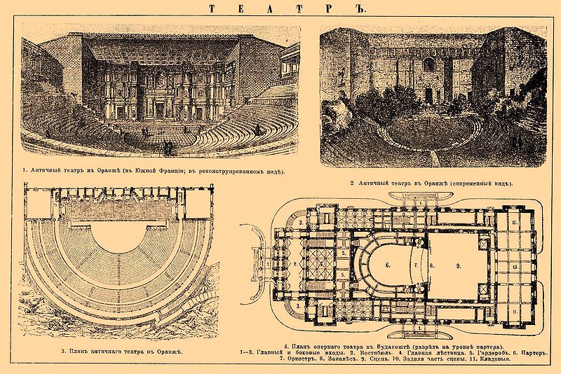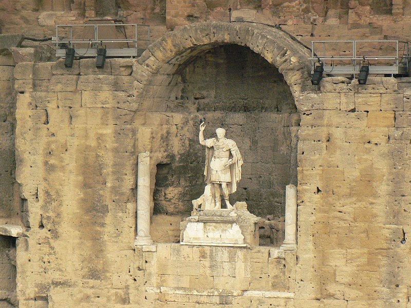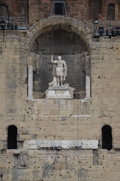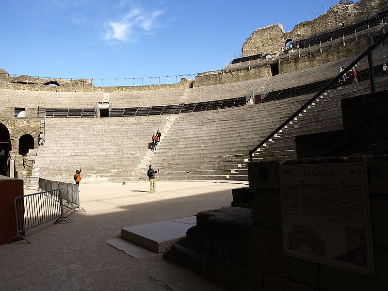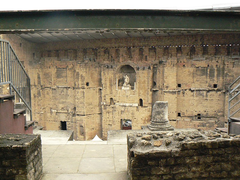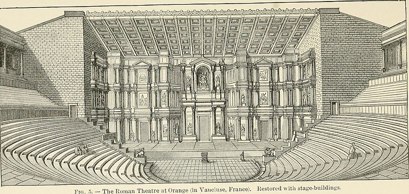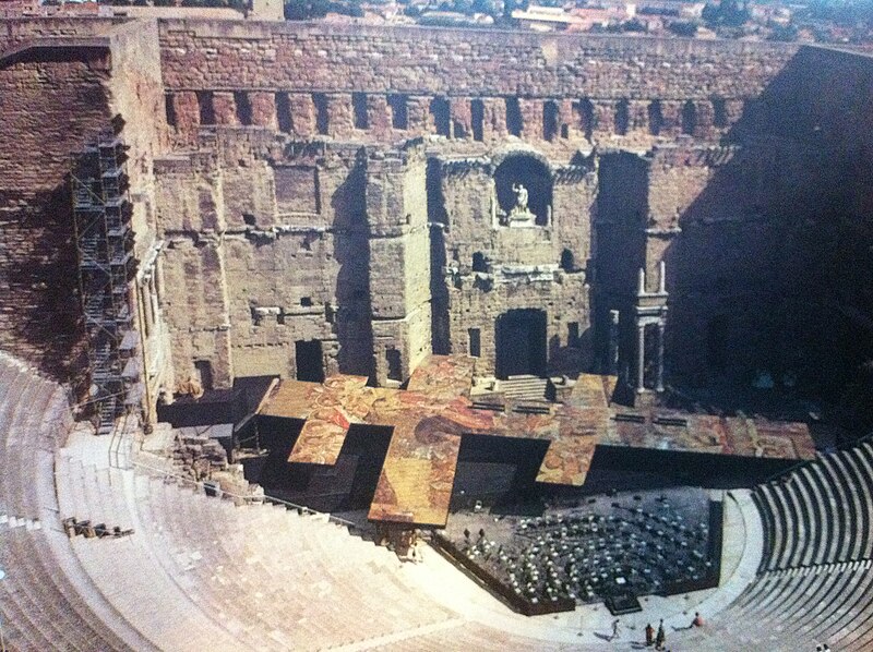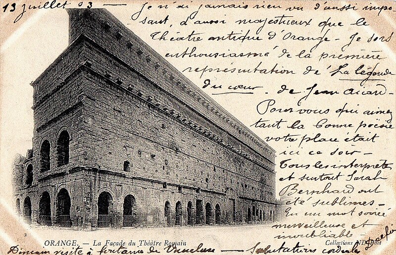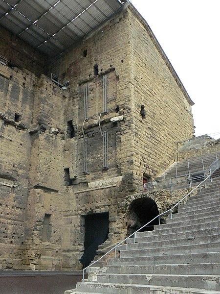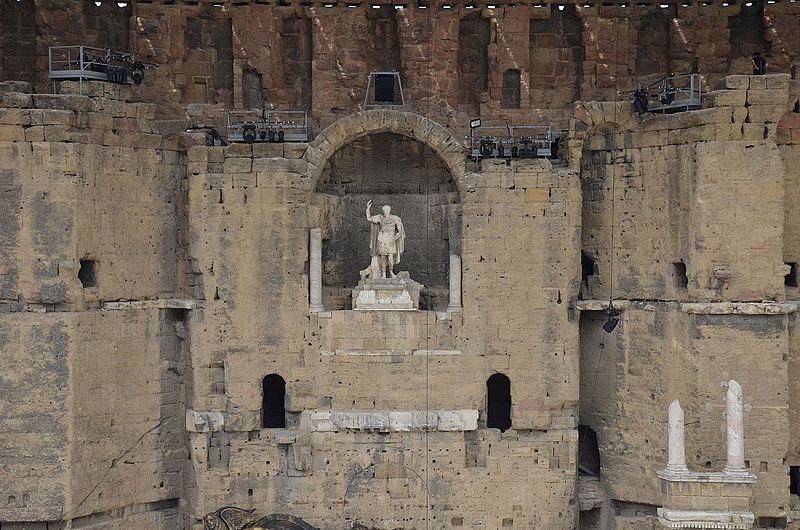 Le théâtre antique d'Orange, construit sous le règne d'Auguste au Ier siècle av. J.-C. par les vétérans de la IIe légion, figure parmi les théâtres romains les mieux conservés au monde. Il conserve un mur extérieur remarquable, long de 104 m et haut de 35 m, précédé à l'origine d'un portique dont subsiste une arche à l'ouest. Ce mur en grand appareil, d'aspect sobre, est organisé en trois niveaux ; au rez-de-chaussée, la porte royale centrale et les deux portes latérales sont séparées par une série d'arcades. La cavea, d'une capacité d'environ 9 000 spectateurs répartis selon le rang social, se compose de trois mæniana répartis sur 34 gradins et séparés par des murs. L'ima cavea comprend vingt gradins dont les trois premiers étaient réservés aux chevaliers, la media cavea neuf gradins destinés aux marchands et citoyens, et la summa cavea cinq gradins accueillant les catégories sociales les plus défavorisées. L'orchestre en demi-cercle est séparé des gradins par un parapet, et de grandes salles superposées servaient à l'accueil du public et aux coulisses. La scène, composée d'un plancher de bois abritant la machinerie, mesure 61 m de longueur pour 9 m de profondeur utile ; elle dominait l'orchestre d'environ 1,10 m, soutenue par le pulpitum. En arrière se trouve la fosse du rideau ; le mur de scène, haut de 35 m, était autrefois décoré de statues, frises et colonnes de marbre dont subsistent des vestiges. Le mur est percé de trois portes et porte au-dessus de la porte royale une frise de centaures de 0,70 m. Une niche abrite une statue colossale de 3,50 m dont la tête n'est pas d'origine ; certains y voient Auguste, d'autres l'estiment postérieure et la situent au IIe siècle apr. J.-C. Après la conquête par les vétérans de la IIe légion, la colonie romaine Arausio connaît un essor sous Auguste, période de construction du théâtre. Fermé en 391, le bâtiment a été préservé par des réutilisations au Moyen Âge : il servit de poste avancé aux princes d'Orange et fut, au XVIe siècle, envahi par des îlots d'habitation servant de refuge lors des guerres de Religion. Au début du XIXe siècle se concrétise l'idée de dégager le théâtre des maisons qui l'encombraient ; on y dénombrait 91 maisons en 1814 et un premier programme d'intervention engagé vers 1823 confia démolitions et consolidations à l'architecte Prosper Renaux. Prosper Mérimée alerta sur l'état du monument et sur la nécessité de réparations importantes. Les travaux se poursuivirent dans la seconde moitié du XIXe siècle sous Simon-Claude Constant-Dufeux et Pierre-Honoré Daumet ; en 1892 Jean Camille Formigé reconstruisit les gradins d'après la reconstitution d'Augustin Caristie, puis son fils Jules lui succéda. Entre 1929 et 1931, des fouilles du pulpitum enrichirent la connaissance du mur de scène ; des colonnes, entablements et escaliers furent remontés ou reconstruits dans les années 1920–1930. Depuis ces restaurations, seuls quelques blocs des trois premiers gradins sont encore antiques. En 2006 un toit de scène en verre et métal, calqué sur l'emplacement du toit romain, fut ajouté pour protéger les murs et permettre l'accrochage des éclairages. Le théâtre est inscrit au patrimoine mondial de l'UNESCO depuis 1981 ; le périmètre de classement a été étendu en 2007 pour inclure la colline Saint-Eutrope. En 2018 une reconstitution en visite virtuelle datée de 36 av. J.-C. présente notamment le velum du théâtre. Le site accueille chaque été depuis 1869 un festival lyrique devenu les Chorégies d'Orange, et il a reçu de nombreux artistes de renommée internationale. Depuis 2019 s'y tient également le Positiv Festival, consacré aux musiques électroniques, et en 2022 la gestion et la valorisation culturelle ont été confiées à la société Edeis dans le cadre d'un projet axé sur l'innovation sonore. En 2022 a été créé un festival Metal qui a rassemblé des formations majeures du genre lors de ses premières éditions. Le théâtre continue par ailleurs d'accueillir concerts, spectacles variés et manifestations populaires, prolongeant ainsi son rôle de scène vivante.