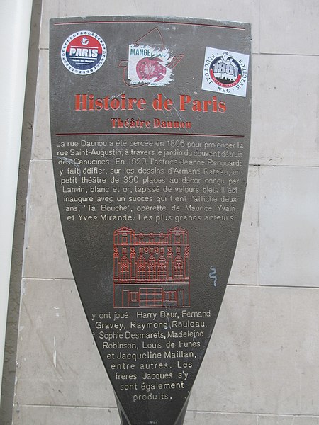 Le Théâtre Daunou est situé 7 rue Daunou, dans le 2e arrondissement de Paris, et est desservi par la station de métro Opéra. La première pierre du nouvel établissement a été posée le 10 décembre 1919 sur l'emplacement de l'ancien hôtel de l'Empire et d'une boutique de modiste. Le projet, commandé par un généreux mécène pour l'actrice Jane Renouardt, est dû à l'architecte Auguste Bluysen. Le bâtiment, conçu comme un important immeuble de rapport, explique la durée des travaux : seuls les étages inférieurs et le sous-sol ont été aménagés pour la salle de spectacle. Le projet initial prévoyait 350 places ; d'autres sources décrivent par la suite la salle comme comportant 450 places. Le théâtre a été inauguré le 30 décembre 1921 avec Une sacrée petite Blonde de Pierre Wolff et André Birabeau, suivie de l'opérette Ta bouche. Jane Renouardt confia la décoration intérieure à sa proche amie Jeanne Lanvin, qui s'associa à Armand Rateau au sein de l'atelier Lanvin décoration ; les établissements Lanvin et Janssens participèrent à l'aménagement pour lui donner un cachet en accord avec le goût de la bourgeoisie progressiste. La salle comporte des boiseries ouvragées, inspirées de miniatures persanes, et des marguerites dorées à l'or fin, motif lié à Jeanne Lanvin. Le décor et l'aménagement, jugés avant-gardistes, font du théâtre un très bon exemple d'édifice Art déco avec des réminiscences du style Empire. En décembre 1971 un incendie détruit le théâtre ; il a été restauré à l'identique et rouvert en février 1973 avec Aurélia de Robert Thomas. Dès son ouverture, la programmation a privilégié les comédies et les opérettes ; on y a notamment joué, parmi de nombreuses productions, Une sacrée petite Blonde, Ta bouche, Mistigri (1930), Le Médecin malgré lui (1949), Aurélia (1973) et des spectacles récents comme La Vie Parisienne ou presque (2017). En 1926 la comédienne Madeleine Carlier loue le théâtre ; en 1939 René Sancelme en devient propriétaire et le loue à François d'Orgeix, puis en 1946 il confie la direction à son épouse. La dernière directrice connue est Denise Petitdidier, décédée le 24 mai 2019. En 2010 le théâtre a rejoint, avec une cinquantaine d'autres salles privées parisiennes, la nouvelle enseigne "Théâtres parisiens associés". À l'issue d'une campagne de réhabilitation de sept ans, les murs du théâtre, développant environ 2 000 m2, ont été acquis en 2020 par le Groupe 6e sens Immobilier.
