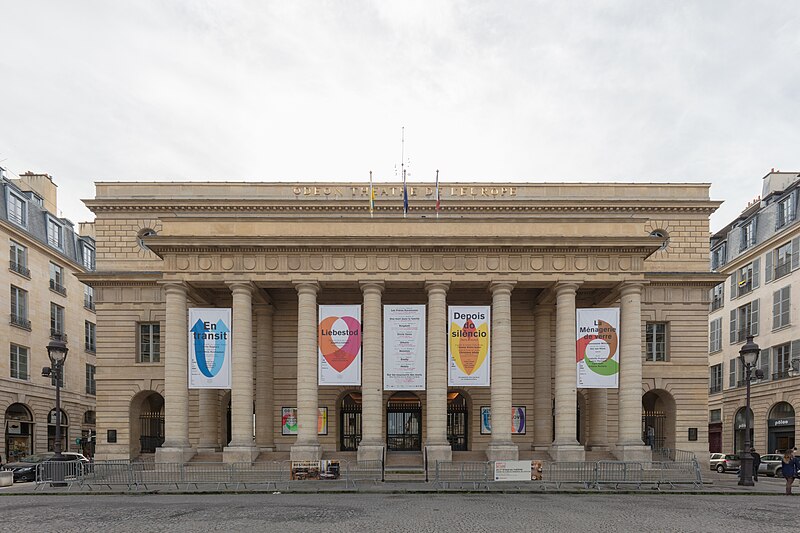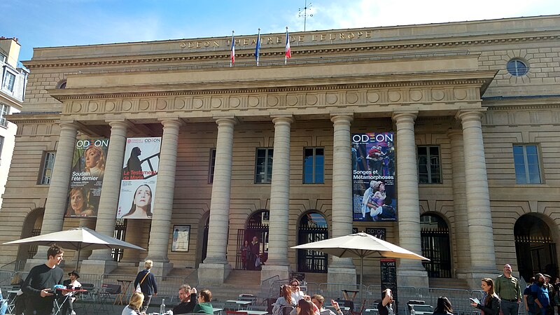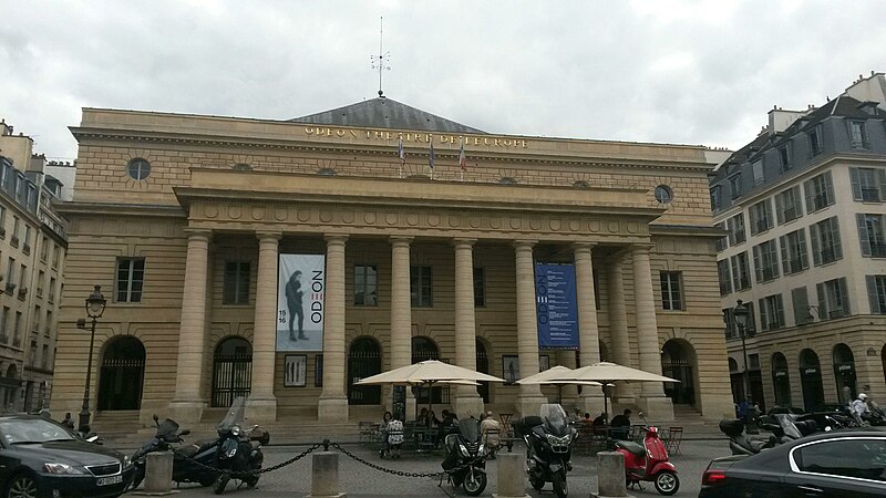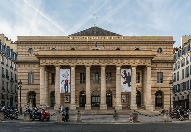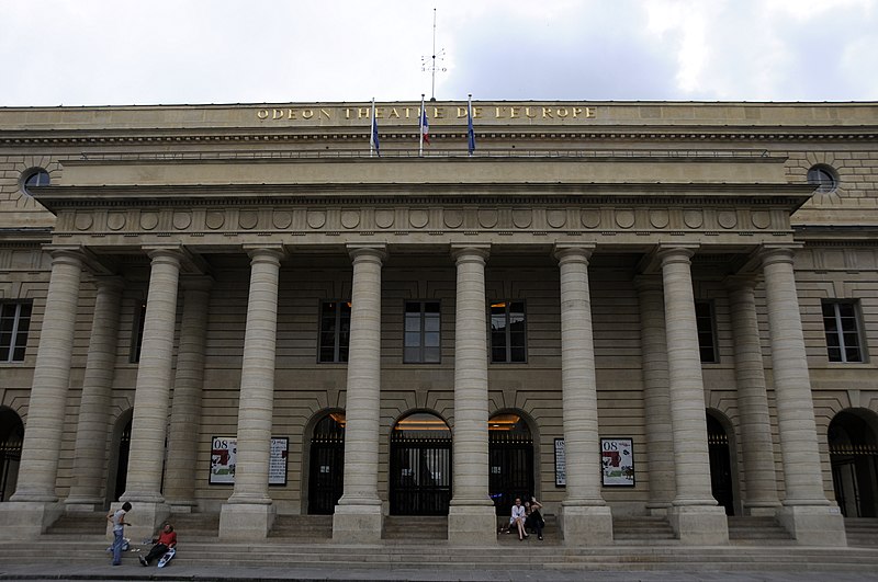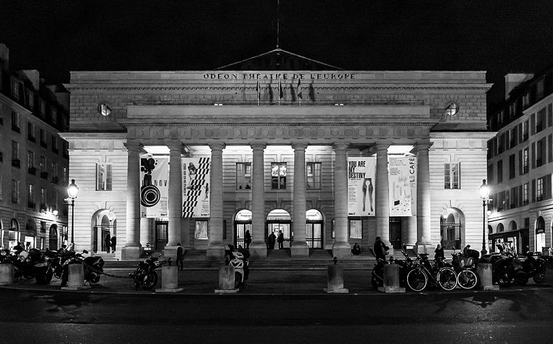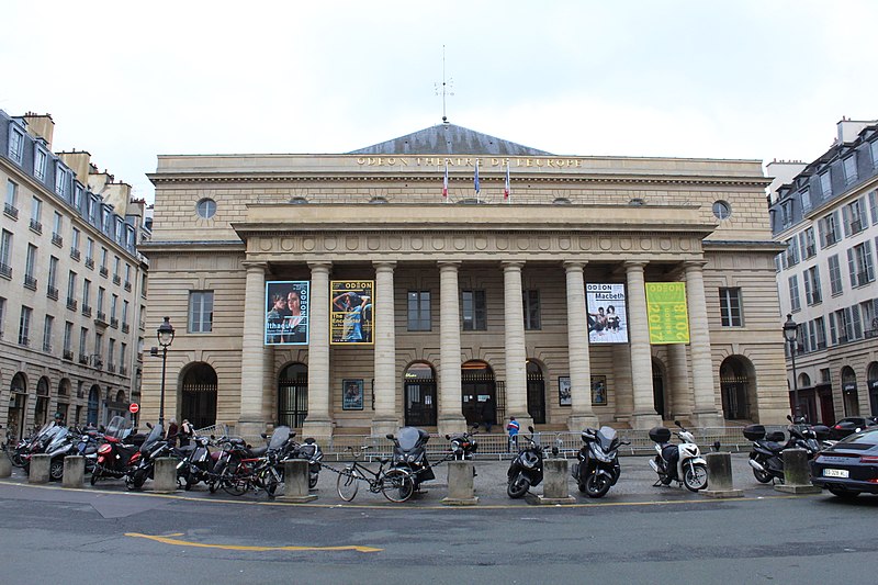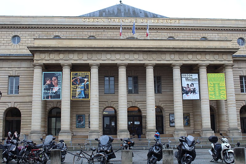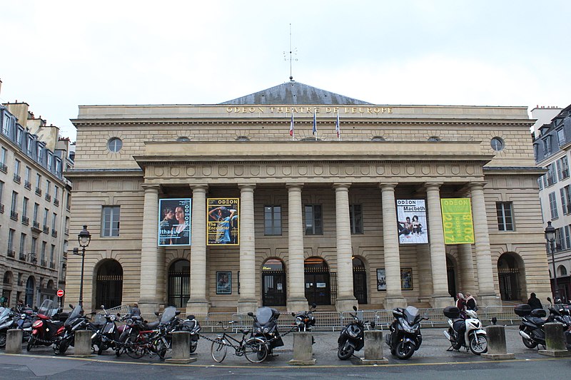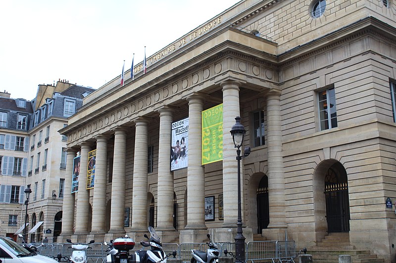 Le théâtre de l'Odéon, situé place de l'Odéon dans le 6e arrondissement de Paris, a été élevé à la fin du XVIIIe siècle par Marie-Joseph Peyre et Charles de Wailly sur l'emplacement de l'hôtel de Condé et inauguré en 1782 pour la troupe du Théâtre-Français. Conçu comme point focal d'un nouveau quartier, il s'ouvre sur une vaste place semi-circulaire pouvant se transformer en théâtre de plein air. Sa salle, première salle « à l'italienne » avec un orchestre équipé de bancs, contraste avec une façade néoclassique d'inspiration palladienne d'une grande sobriété. Le bâtiment a été victime de deux incendies majeurs en 1799 et 1818 ; il fut restauré par Chalgrin en 1808 puis reconstruit par Pierre Thomas Baraguay, qui livra la salle inaugurée en 1819. Sous la Révolution la salle porta successivement les noms de Théâtre de la Nation et de Théâtre de l'Égalité, perdit les privilèges de la Comédie-Française et traversa des périodes d'instabilité mêlant faillites, changements de direction et fermetures. L'Odéon a connu des événements marquants : la création publique du Mariage de Figaro en 1784, les débuts de figures telles que Talma et Sarah Bernhardt, les journées révolutionnaires de 1830 et l'occupation étudiante de mai 1968. Au XIXe et au début du XXe siècle, la direction du théâtre favorisa innovations scéniques et succès populaires, tandis que des travaux successifs améliorèrent le confort, la sécurité et les techniques scéniques. Après l'incendie de la Comédie-Française en 1900, la troupe s'installa temporairement à l'Odéon ; plus tard, des directeurs comme Firmin Gémier, Paul Abram puis Jean-Louis Barrault renouvelèrent le répertoire et la pratique théâtrale. À partir de 1959 la compagnie Renaud-Barrault donna une impulsion moderne au lieu, avec créations, concerts et la transformation du « Petit-Odéon » en laboratoire de recherche scénique. Le théâtre acquit le statut d'établissement public industriel et commercial et fut classé au titre des monuments historiques le 7 octobre 1947 ; il fit l'objet de rénovations importantes, notamment en 1906, 1930 et entre 2002 et 2006. Depuis 1971 l'Odéon fait partie des théâtres nationaux et, depuis 1990, il porte également l'appellation Odéon–Théâtre de l'Europe, accueillant compagnies étrangères et projets européens. Il dispose depuis 2003 d'une seconde salle modulable, les Ateliers Berthier, de 350 à 450 places, installée boulevard Berthier et officiellement rattachée à l'Odéon en 2005. Accessible par les lignes 4 et 10 (station Odéon) et le RER B (gare du Luxembourg), l'Odéon voit ses Ateliers Berthier desservis par les lignes 13, 14 et le RER C à Porte de Clichy. Parmi les directions récentes figurent Lluis Pasqual, Georges Lavaudant, Olivier Py, Luc Bondy, Stéphane Braunschweig et, depuis le 15 juillet 2024, Julien Gosselin.