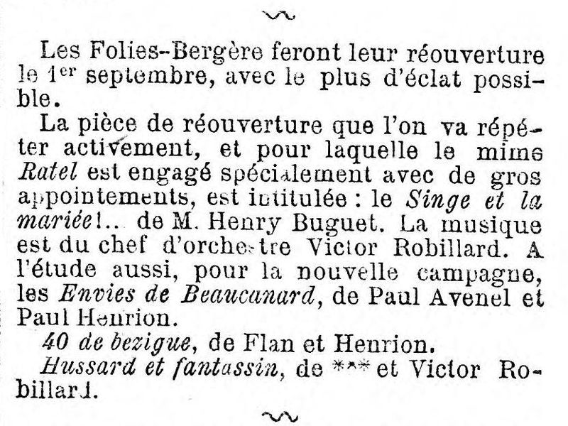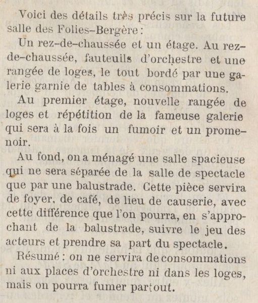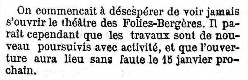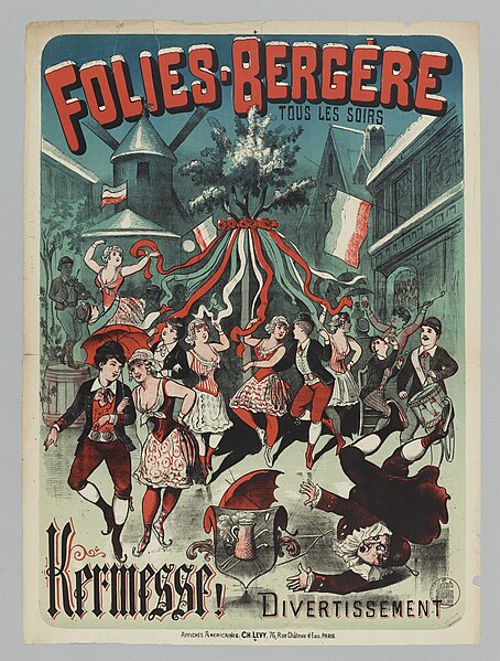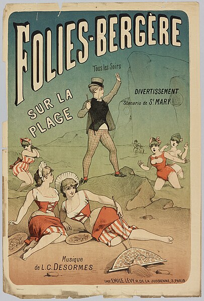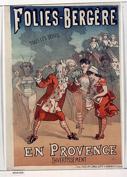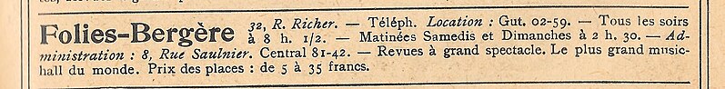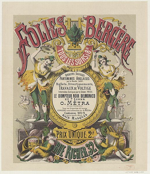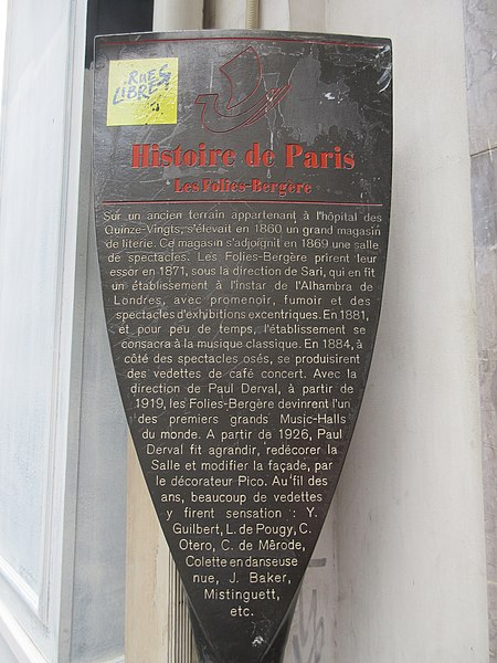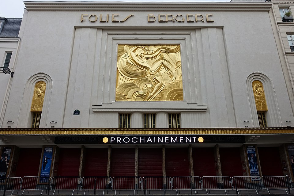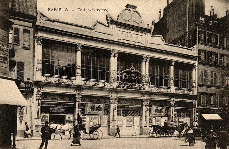 Le théâtre des Folies‑Bergère, situé 32 rue Richer dans le 9e arrondissement de Paris, est une salle de spectacles inaugurée le 2 mai 1869. À l’origine conçu comme music‑hall et « café‑spectacle », il permettait au public d’assister aux représentations tout en buvant et fumant. Le nom évoque à la fois les « folies », lieux de divertissement du XVIIIe siècle, et la rue Bergère ; selon la tradition, l’orthographe sans “s” aurait été choisie pour aboutir à treize lettres. Installé sur le site d’un ancien magasin de literie ouvert en 1860, l’établissement est transformé en 1871 par Léon Sari, qui crée un vaste jardin d’hiver appelé promenoir, typique des music‑halls parisiens et organisé autour de galeries favorisant la libre circulation des spectateurs. Sous la direction d’Édouard Marchand à partir de 1886 naît la revue de music‑hall à grand spectacle, avec des artistes comme la danseuse américaine Loïe Fuller. La salle connaît des évolutions architecturales et décoratives : une façade art nouveau est posée en 1905, puis la salle est profondément remaniée à la fin des années 1920 et dotée d’un décor art déco marqué par un grand bas‑relief représentant la danseuse Lila Nicolska, initialement couvert de feuille de cuivre et doré lors d’une restauration en 2012. À la même époque, la programmation et l’esprit du lieu changent : la salle devient un cabaret de nu et la libre circulation avec le promenoir est fermée ; des adjonctions des années 1930, liées notamment à des décorateurs de revues, et des décors conservés jusque dans les années 1960 ont modifié l’aspect originel du promenoir. Paul Derval dirige les Folies‑Bergère de 1918 à 1966 et impulse de nombreuses revues, attirant des vedettes comme Joséphine Baker, qui y revient notamment en 1936. En 1912, la salle accueille la première apparition scénique d’une femme totalement dénudée, épisode marquant de son histoire de spectacle. La direction passe en 1974 d’Antonia Derval à Hélène Martini, qui conserve pendant des décennies une forte influence sur la maison ; en 2012 elle met en vente une partie des costumes créés entre 1974 et 2002. Le théâtre est racheté par le groupe Lagardère en septembre 2011 ; en 2013 il passe sous la direction de Frédéric Jérôme, et en 2020 Lagardère met en vente ses activités spectacles, dont les Folies‑Bergère. Inscrit au titre des monuments historiques depuis le 7 novembre 1990, le lieu a inspiré de nombreuses affiches et œuvres d’art (parmi les artistes cités figurent Édouard Manet, Jules Chéret et Henri de Toulouse‑Lautrec) et apparaît également dans plusieurs films et productions audiovisuelles. Aujourd’hui la salle présente des comédies musicales, des spectacles de théâtre musical et des concerts de musiques actuelles, tout en conservant la mémoire de son rôle central dans l’histoire du music‑hall parisien.