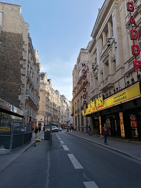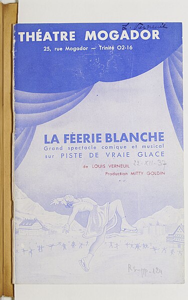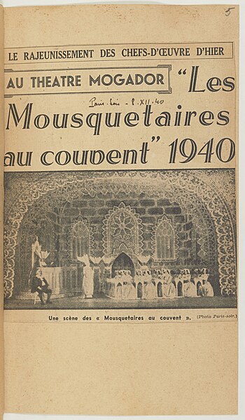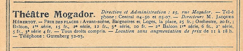 Le théâtre Mogador, situé au 25 de la rue de Mogador dans le 9e arrondissement de Paris, est une salle de spectacles construite en 1913 et inaugurée en 1919. Il peut accueillir 1 618 personnes réparties sur trois niveaux : orchestre, corbeille et balcon. La salle a été créée par le financier britannique Sir Alfred Butt, qui l'a fait édifier sur le modèle du London Palladium conçu par Bertie Crewe ; l'architecte Édouard Niermans a assuré la direction des travaux. Nommée d'abord Palace Théâtre, elle prend le nom de Mogador en référence à la rue où elle se trouve et est inaugurée le 21 avril 1919 en présence du président américain Woodrow Wilson et de Franklin D. Roosevelt. Dans les années 1920 la salle accueille les Ballets russes de Diaghilev et organise les « Thés Mogador », après‑midi musicaux, puis devient dans les années 1930 un lieu consacré aux opérettes, revues et comédies musicales. Mistinguett y connaît un grand succès avec la revue Ça, c'est parisien. Les frères Isola y créent plusieurs succès populaires, parmi lesquels No, No, Nanette, Rose‑Marie et L'Auberge du Cheval‑Blanc. En 1941, Henri Varna prend la direction et produit de grandes opérettes — Violettes impériales, Les Amants de Venise, Naples au baiser de feu, Michel Strogoff — ainsi que de nombreuses reprises de La Veuve joyeuse avec des artistes tels que Géori Boué, Jacques Jansen, Marcel Merkès, Paulette Merval et Tino Rossi. À la mort d'Henri Varna en 1969, le théâtre est rebaptisé Théâtre Henri‑Varna‑Mogador. Sous la direction d'Hélène Martini, la programmation se renouvelle avec des spectacles tels que Monsieur Pompadour et Hello Dolly. À partir des années 1980 le Mogador accueille également des concerts : Higelin y tient l'affiche en 1980‑1981, The Shadows s'y produisent en décembre 1980, et Sting donne en 1985 sept soirées triomphales. Le théâtre reçoit la cérémonie des Molières en 2002, 2003, 2005 et 2006. En 2005, le lieu est racheté par le groupe néerlandais Stage Entertainment. En 2010, le Mogador rejoint l'enseigne commune des Théâtres parisiens associés, regroupant 50 théâtres privés parisiens. Un incendie déclaré le 25 septembre 2016 dans les sous‑sols endommage le plancher de la scène et entraîne la fermeture du théâtre pendant plusieurs mois. La salle rouvre à l'automne 2017 avec un nouveau spectacle. Le 23 janvier 2018, Eric Clapton y présente un concert privé offert par Édouard Carmignac. Le répertoire du Mogador est vaste et comprend dès ses débuts revues et opérettes (Hullo Paris, Rip, Madame l’Archiduc, La Petite Mariée, La Petite Fonctionnaire, La Mascotte) ainsi que les Ballets russes. Les décennies suivantes voient se succéder opéras‑bouffes, opérettes populaires et comédies musicales, avec des productions marquantes et des reprises régulières d'œuvres célèbres comme La Veuve joyeuse. Depuis 2005, sous Stage Entertainment, la programmation met l'accent sur les comédies musicales et les grands spectacles grand public : Swann Lake, Le Roi Lion — qui a attiré environ 1 300 000 spectateurs sur près de 1 000 représentations — Cendrillon, Mamma Mia!, Sister Act, La Belle et la Bête, Le Bal des vampires, Cats, Le Fantôme de l'Opéra (annulé après l'incendie), Grease, Chicago et Ghost. En 2020, Le Tour du monde en 80 jours est contraint de suspendre ses représentations en raison de la pandémie de Covid‑19. En 2021 la reprise du Roi Lion marque le retour du spectacle à Mogador quatorze ans après sa première exploitation dans ce théâtre.