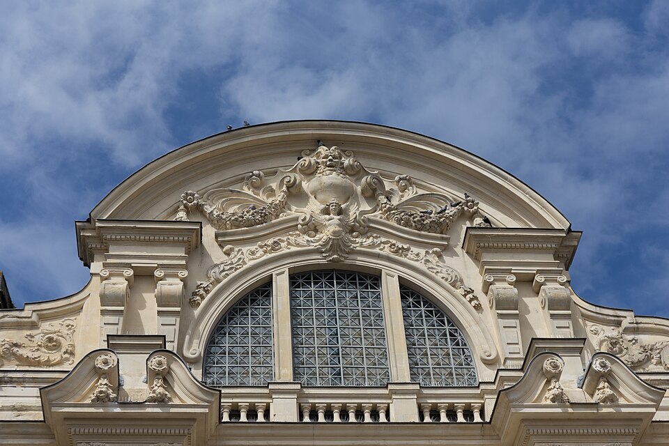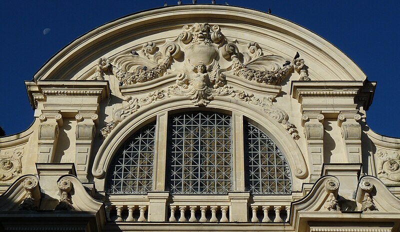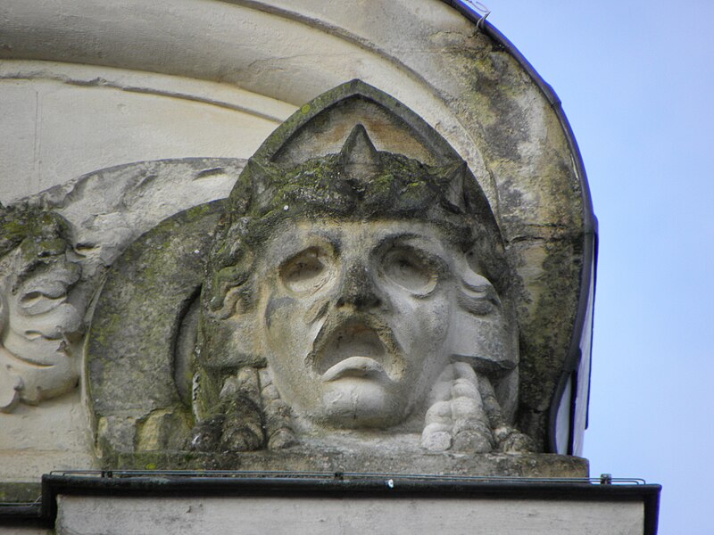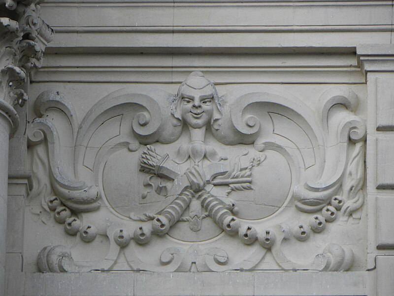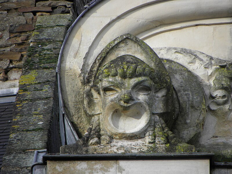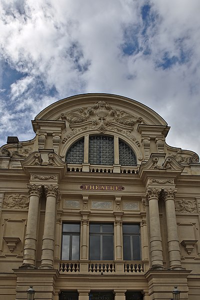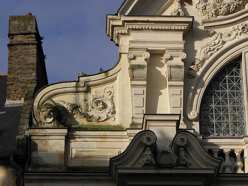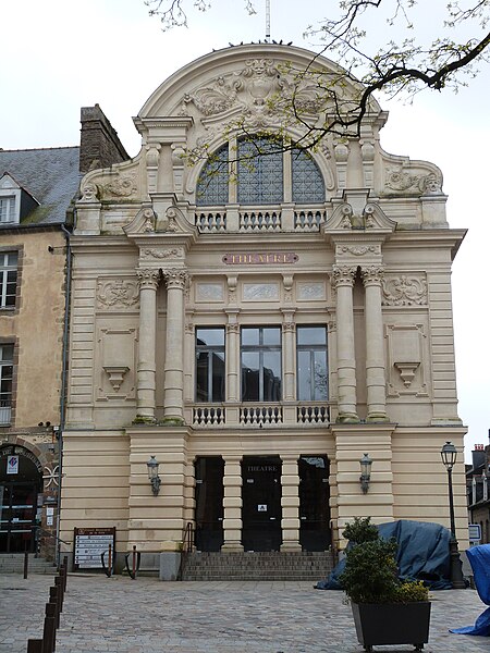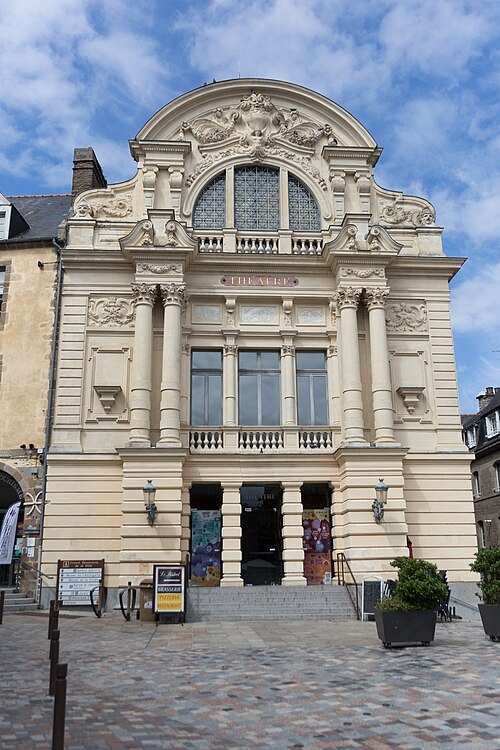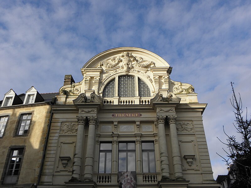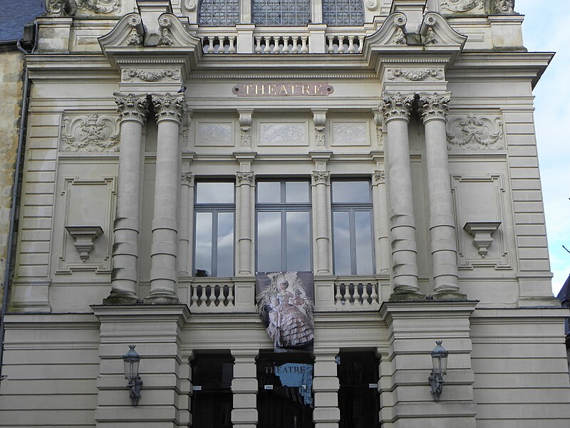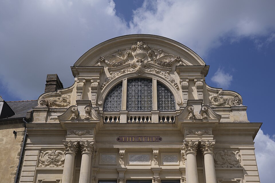 La façade principale, austère et monumentale, témoigne d'une ambition ostentatoire : elle reprend, à une échelle locale, des éléments inspirés du grand théâtre d'Angers et de l'éclectisme du Second Empire, avec bossages, pilastres et colonnes au fût lisse, chapiteaux corinthiens, entablements et frises sculptées. L'élévation s'articule en trois registres — rez‑de‑chaussée, étage noble et attique couronné d'un fronton — et met en valeur une travée centrale animée par balcons, cartouches et consoles ; l'ornementation comprend des guirlandes, des cartouches marbrés portant l'inscription "Théâtre" et des attributs symbolisant la Comédie et la Tragédie. Le décor sculpté, réalisé par l'ornemaniste rennais Gaumerais, s'achève par un couronnement orné de motifs végétaux et d'une tête de Bacchus, tandis que la pierre calcaire employée souligne le caractère ostentatoire de l'ensemble.