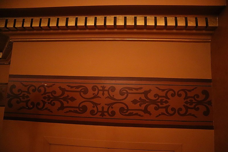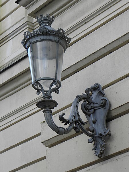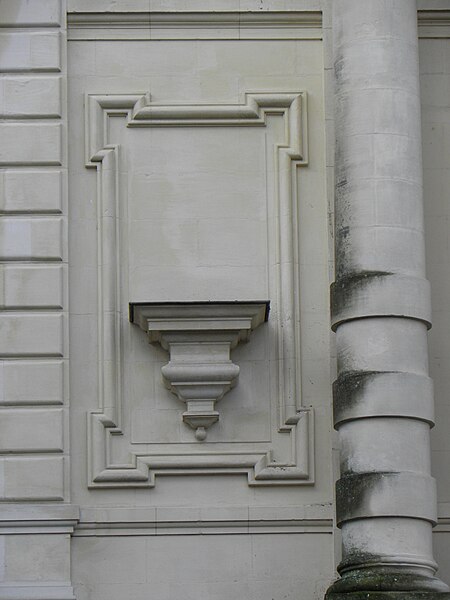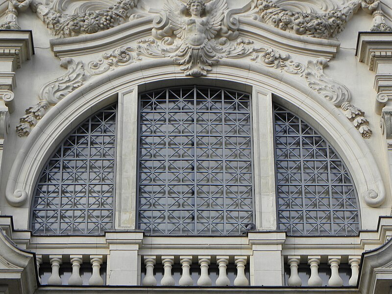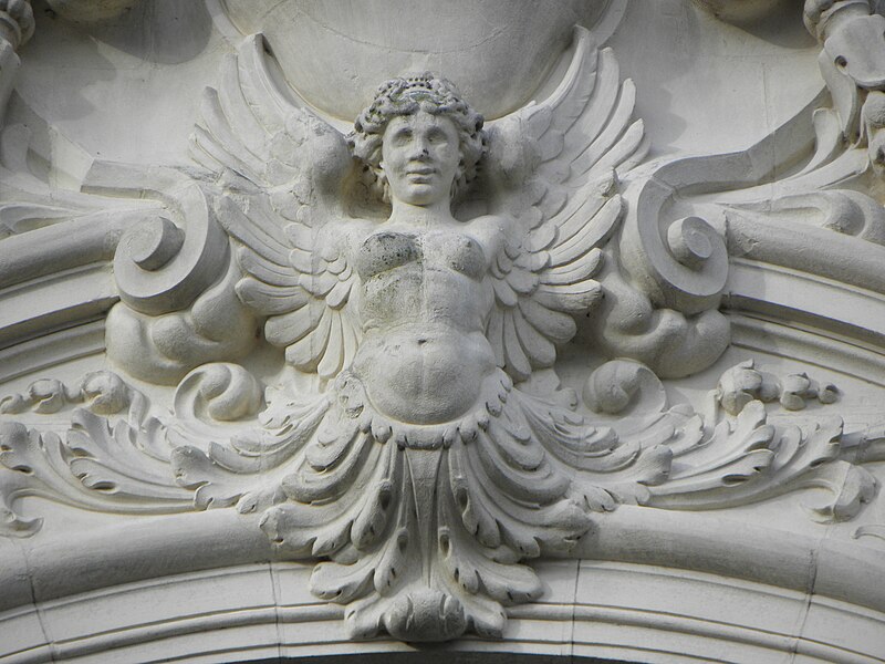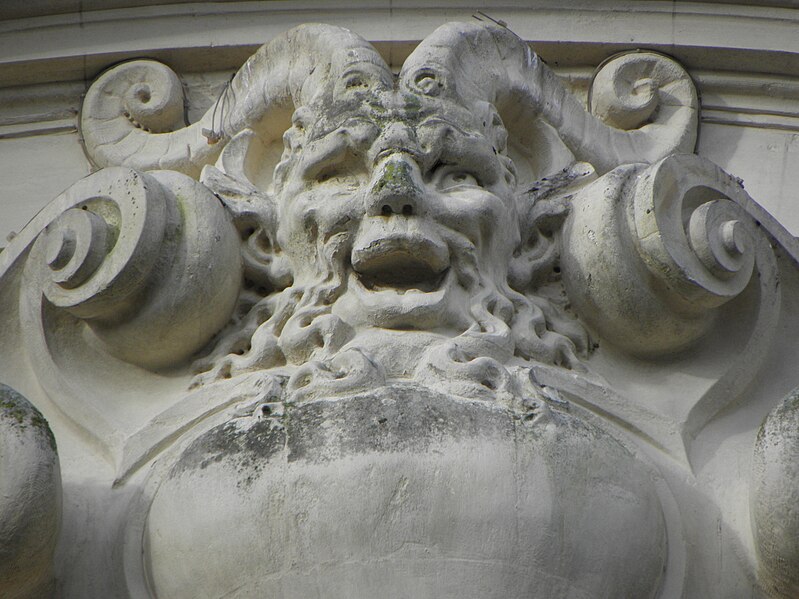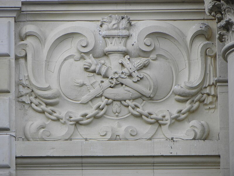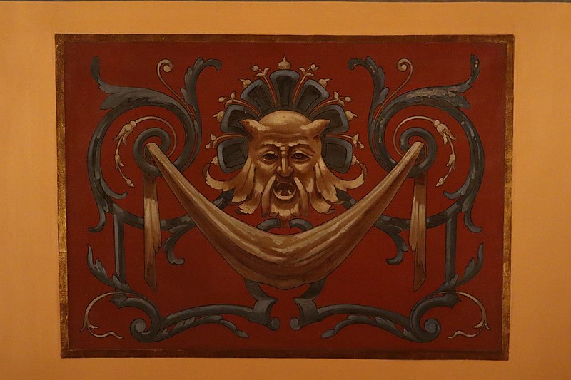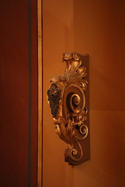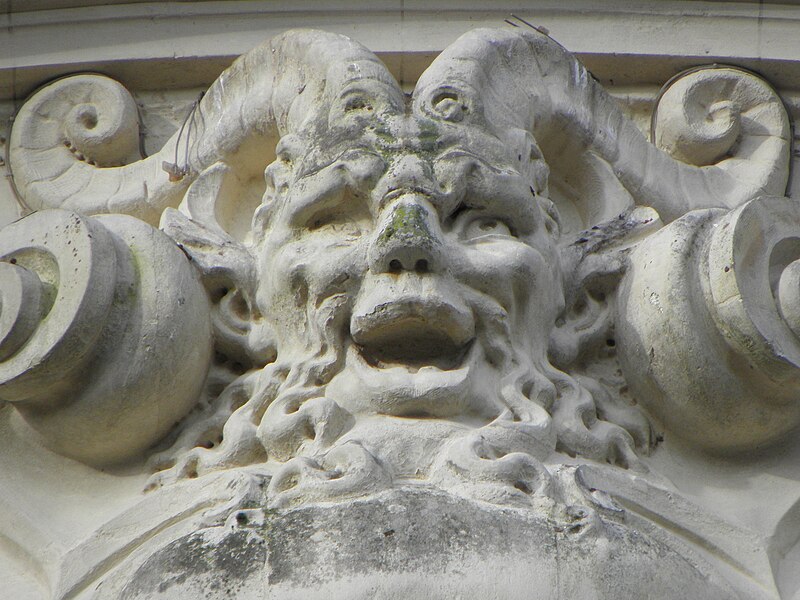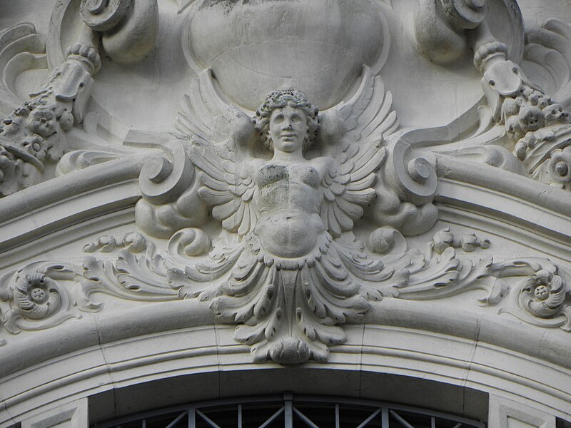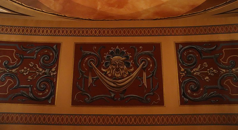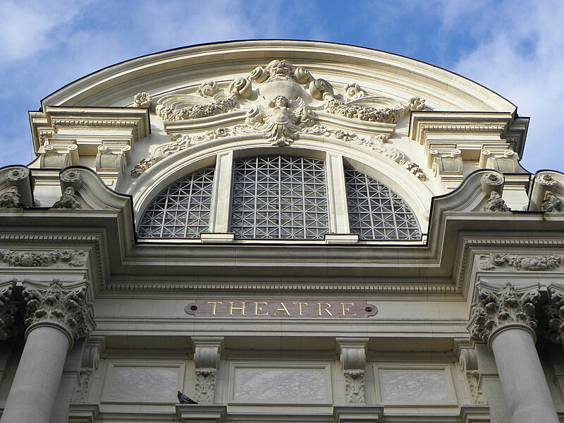 La façade principale, austère et monumentale, témoigne d'une ambition ostentatoire : elle reprend, à une échelle locale, des éléments inspirés du grand théâtre d'Angers et de l'éclectisme du Second Empire, avec bossages, pilastres et colonnes au fût lisse, chapiteaux corinthiens, entablements et frises sculptées. L'élévation s'articule en trois registres — rez‑de‑chaussée, étage noble et attique couronné d'un fronton — et met en valeur une travée centrale animée par balcons, cartouches et consoles ; l'ornementation comprend des guirlandes, des cartouches marbrés portant l'inscription "Théâtre" et des attributs symbolisant la Comédie et la Tragédie. Le décor sculpté, réalisé par l'ornemaniste rennais Gaumerais, s'achève par un couronnement orné de motifs végétaux et d'une tête de Bacchus, tandis que la pierre calcaire employée souligne le caractère ostentatoire de l'ensemble.
